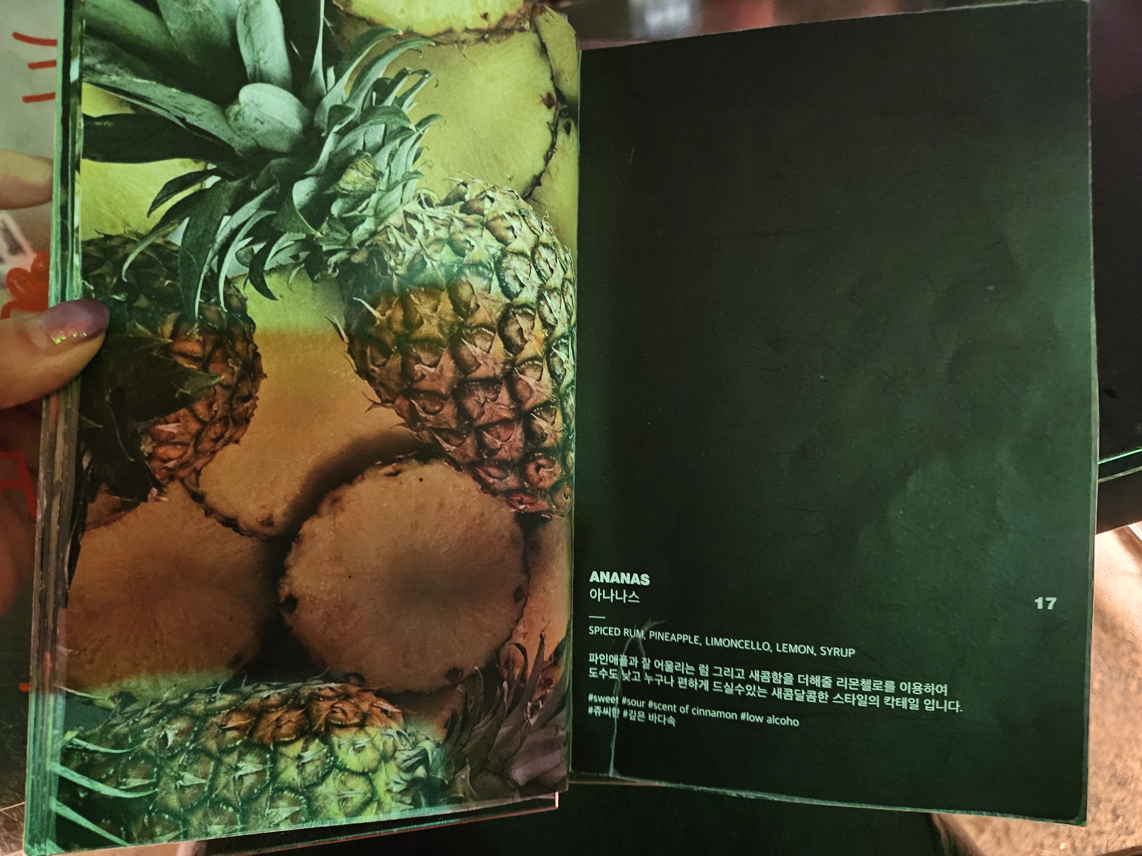 다양한 조합의 상큼한 과일 칵테일이 많은데 논알콜로 마실까 하다가 논알콜 주문 가능한 칵테일이 모스코 뮬, 블러디 메리, 모히토, 피나콜라다 4가지로 한정적이라 일반 과일 칵테일을 마셔보기로 했다.