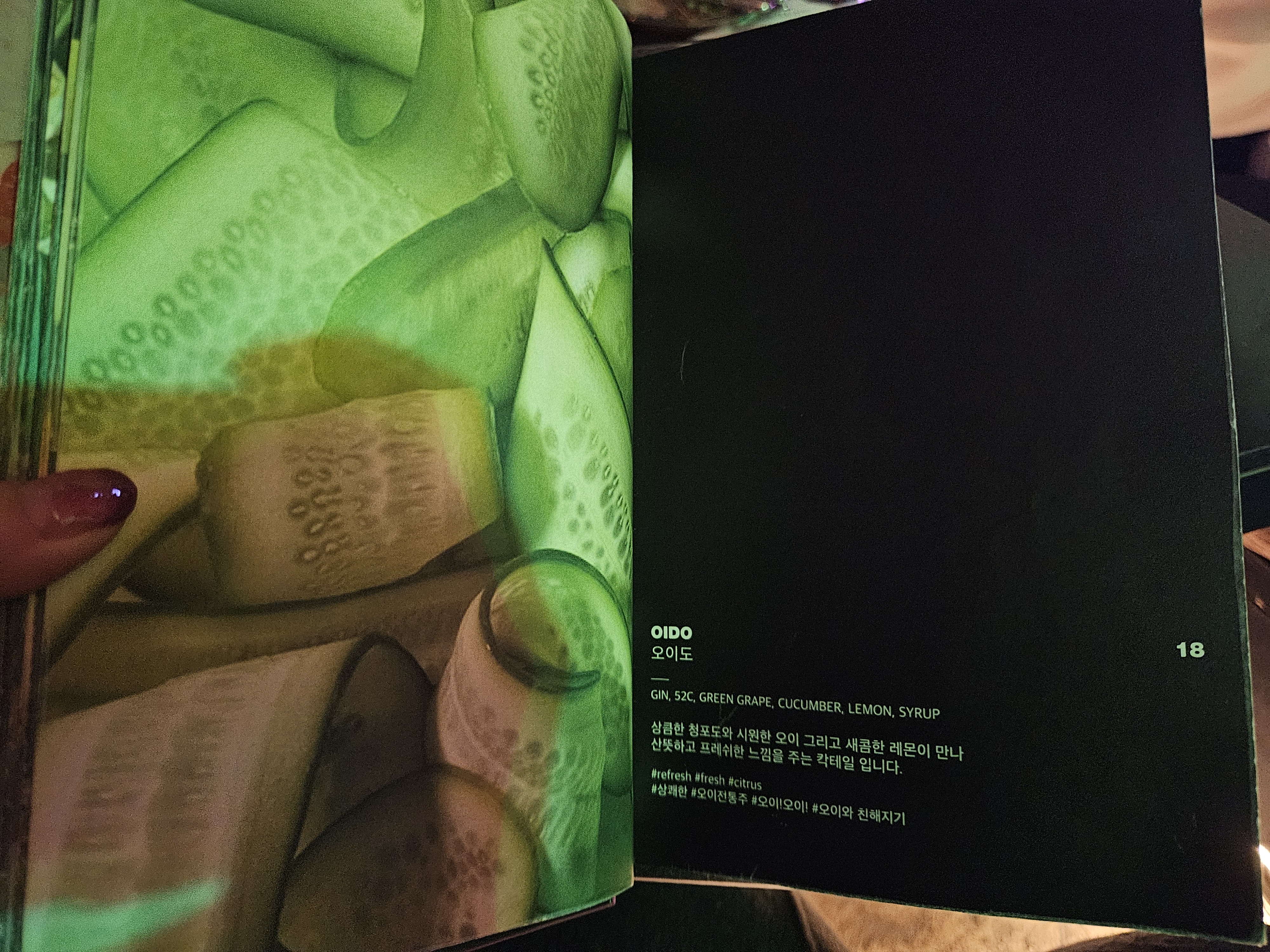 친구가 마신 오이도는 오이주에 청포도와 새콤한 레몬을 더해 산뜻하고 시원한 느낌의 칵테일~ 오이향을 좋아하면 무조건 극호인 청량한 스타일.