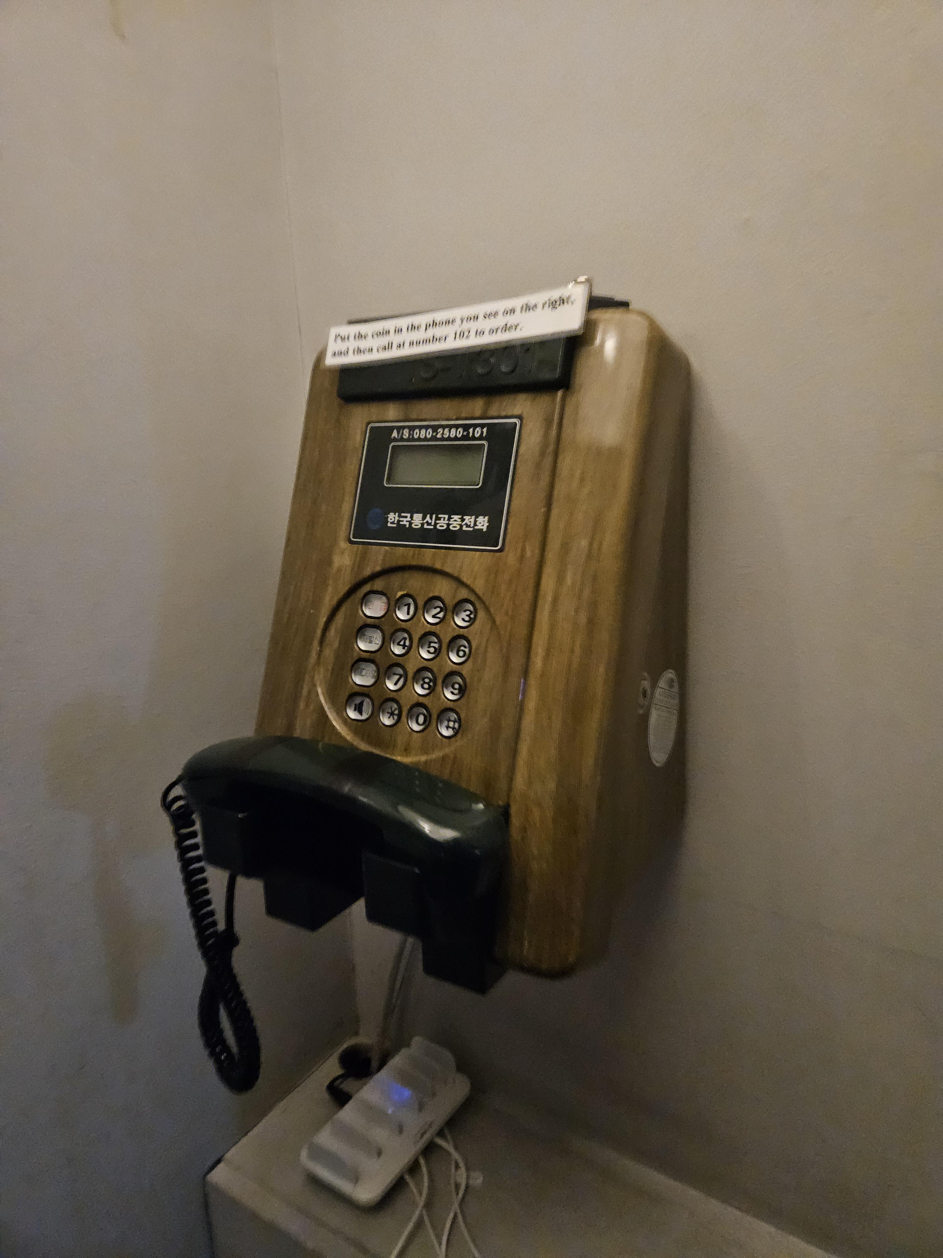 주문 방법은 공중전화 부스로 가면 우측 아래 바구니에 담긴 백원짜리 동전을 넣고 102번을 누르면 카운터로 연결된다.