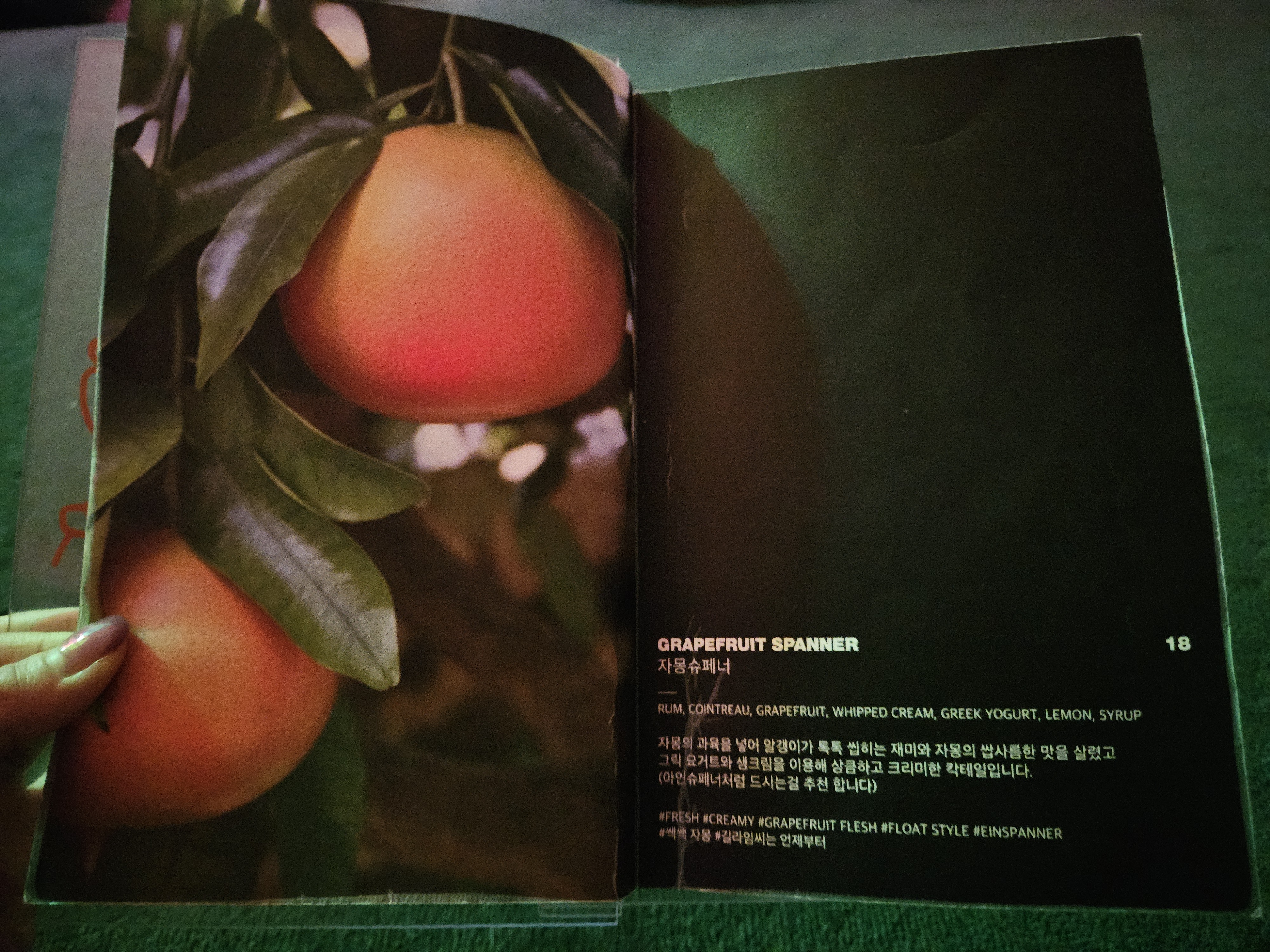 자몽슈패너는 자몽 과육을 넣어 자몽의 쌉싸름함을 살리고 그릭요거트에 생크림으로 상큼하면서 크리미 한 맛이 특징이라 내가 좋아하는 자몽과 그릭요거트 조합이니 무조건 주문할 수밖에 없었던 칵테일.