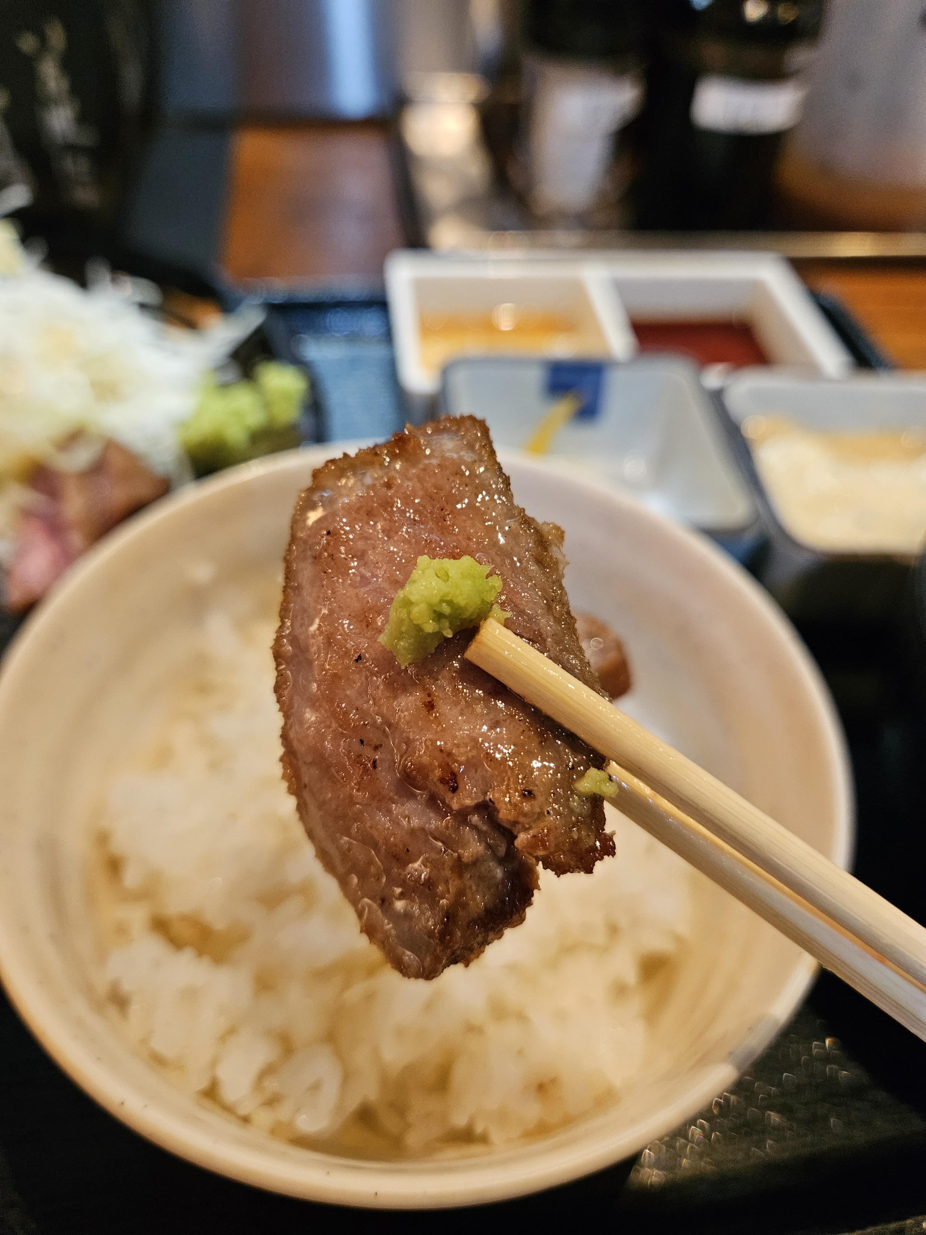주문 메뉴는 정식처럼 트레이에 규카츠와 소스 2종류, 단무지와 장국이 제공됐고 밥은 보리밥이었는데 보리 함량은 많진 않았음. 규가츠는 양배추 샐러드와 감자 샐러드, 와사비가 가니쉬로 제공됐다.