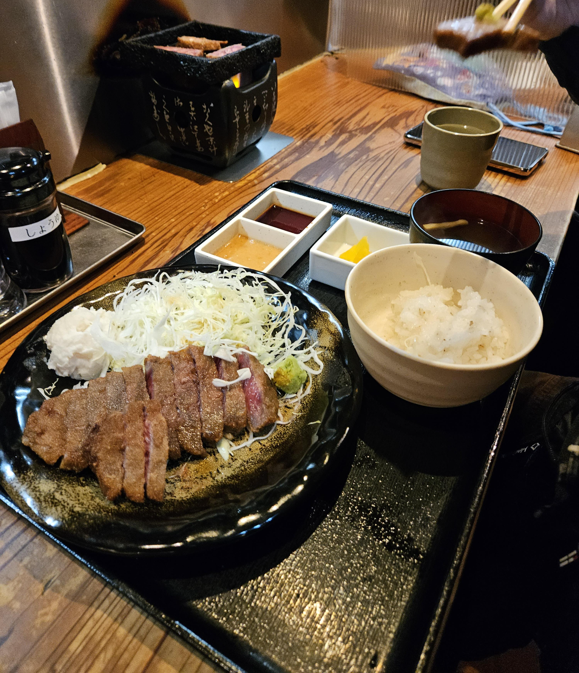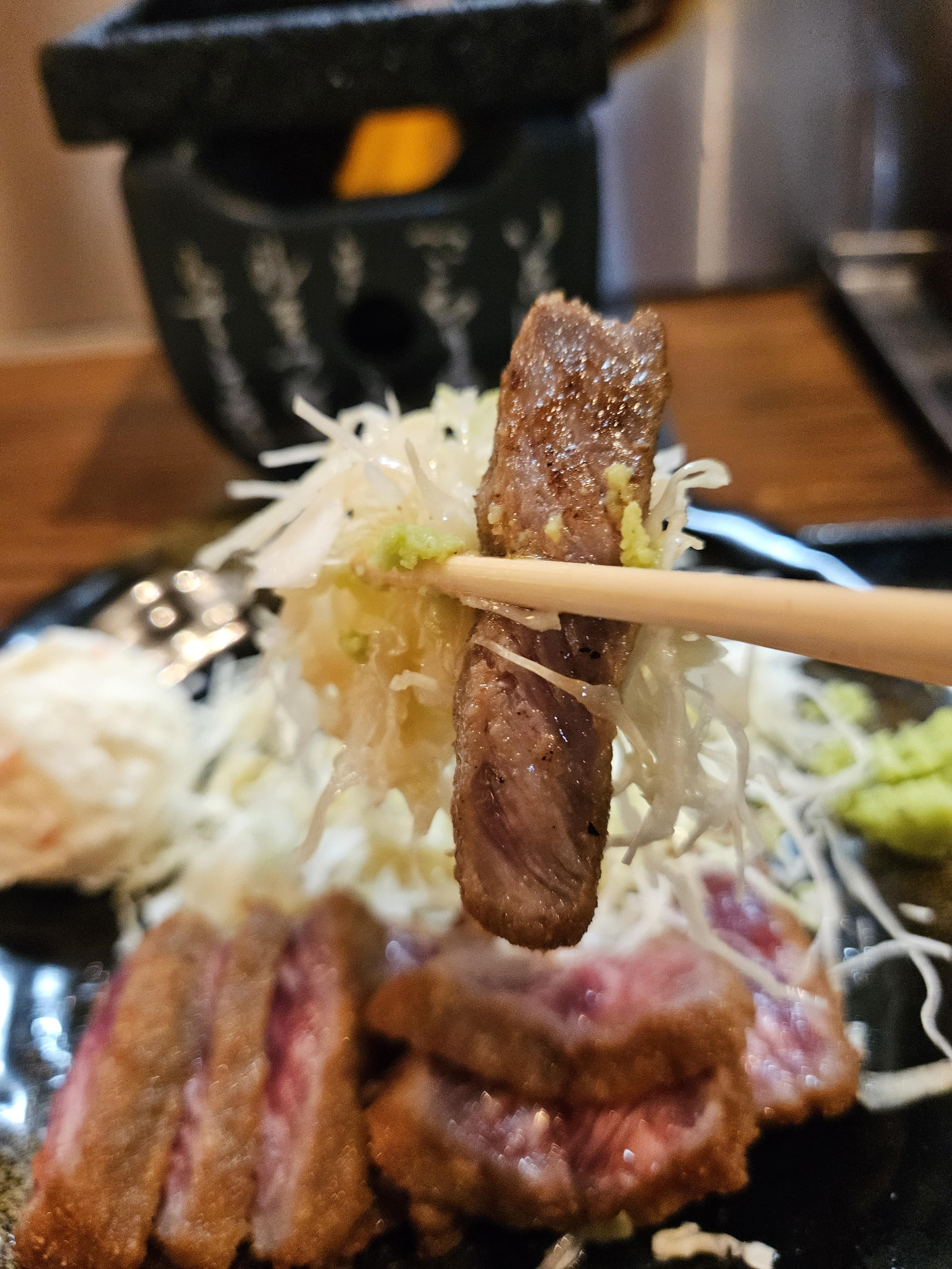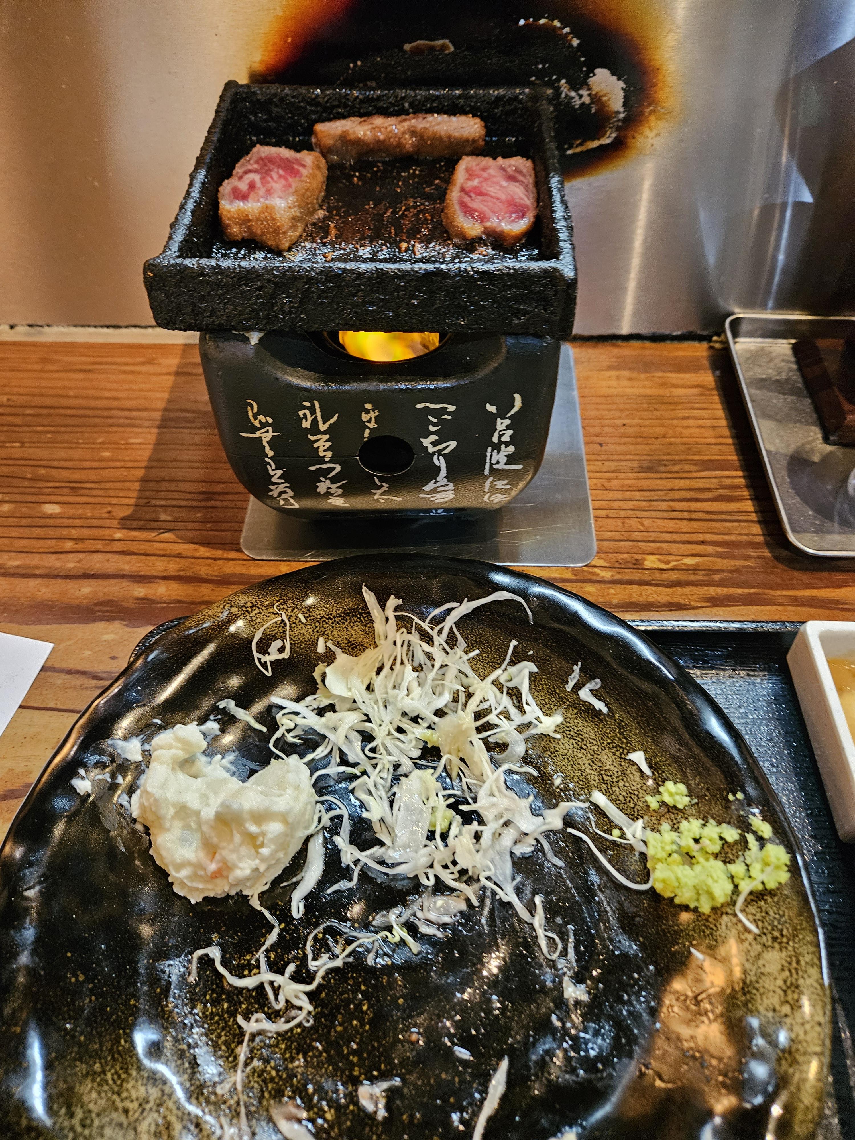 보기는 레어로 나오는데 미니화로에서 원하는 굽기로 구워 와사비 곁들여 제공된 소스에 찍어먹거나 마, 양배추 등과 곁들여 먹으면 맛있다.