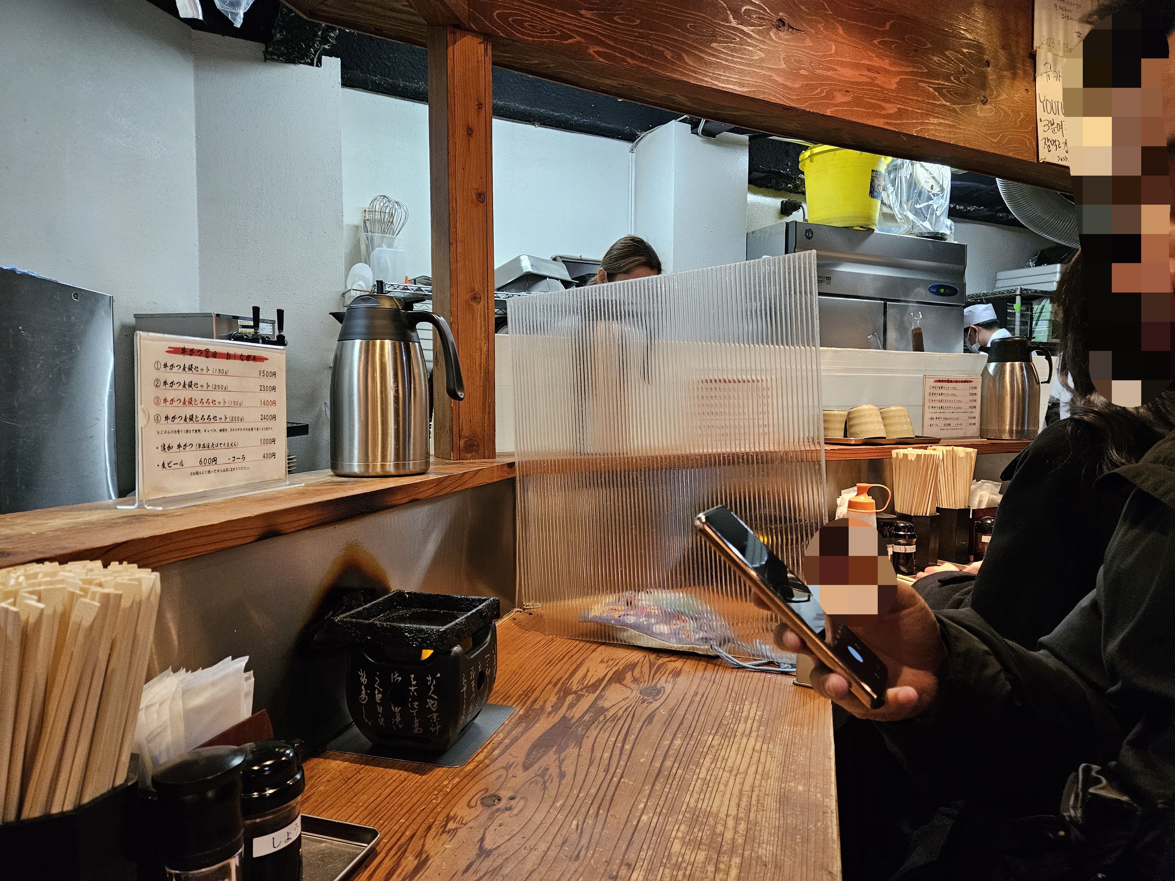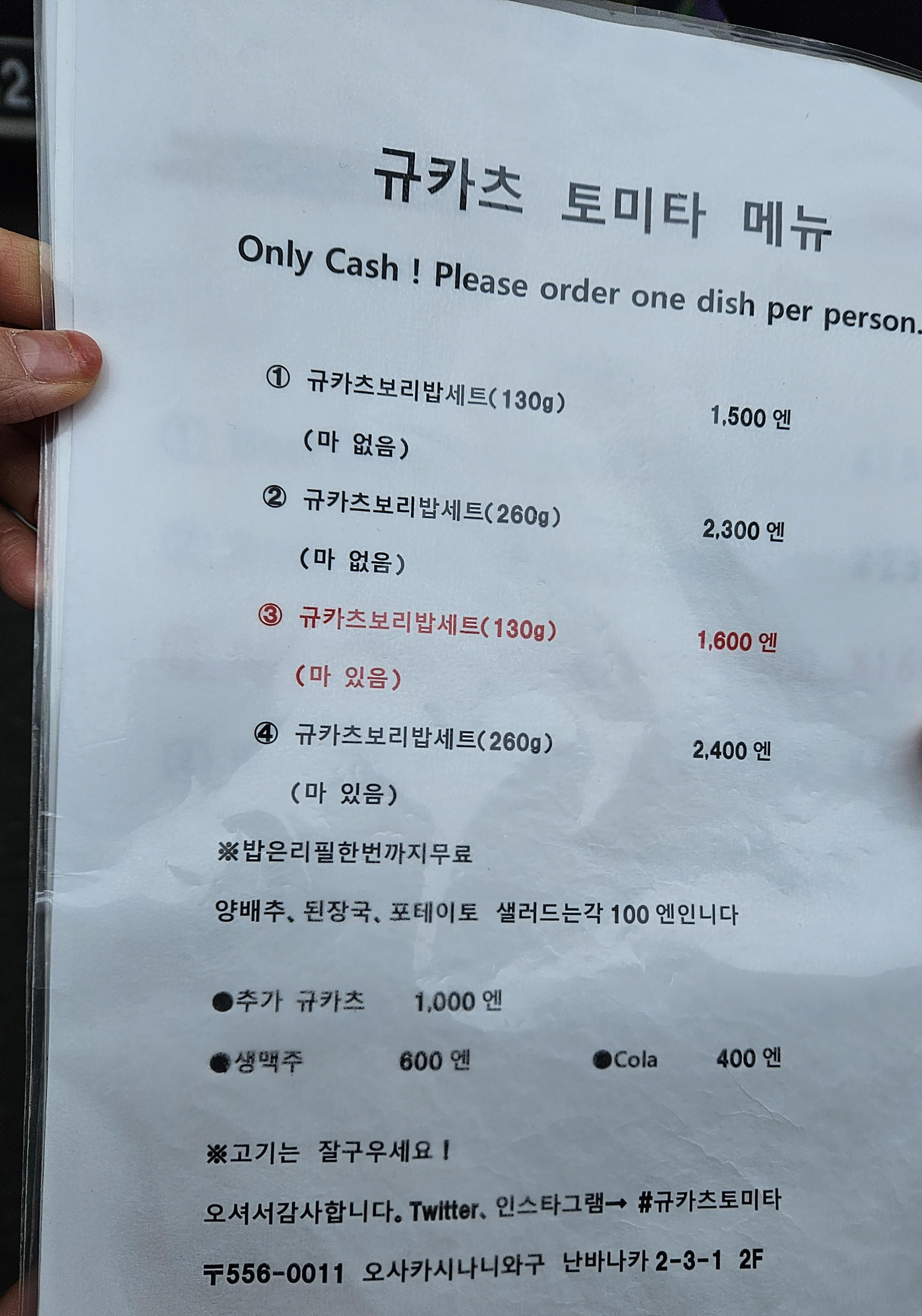 메뉴는 규카츠와 생맥주, 콜라가 전부인데 규카츠는 그램수와 마가 있고 없고에 따라 가격이 달라지니 참고해서 주문하면 되고 마 있는 세트 메뉴 주문 시 100엔이 더 비싸더라.