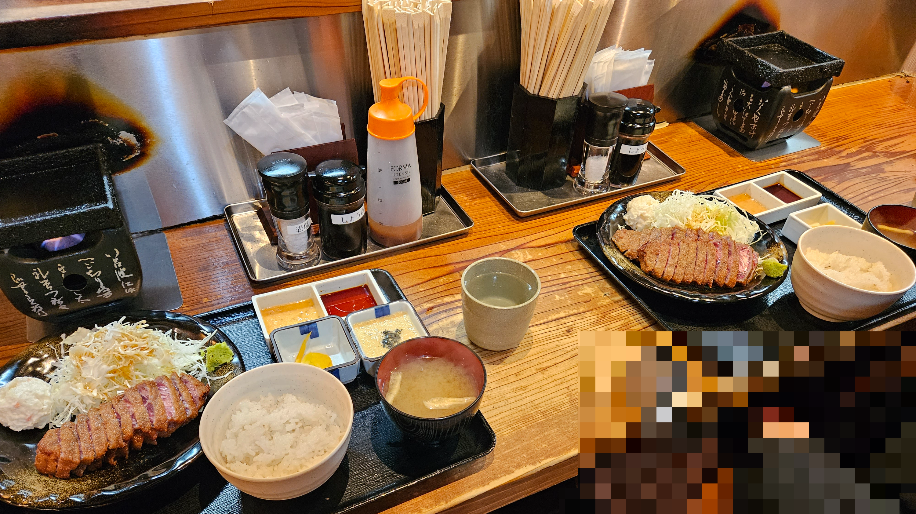 테이블에는 규카츠 구울 미니 개인 화로와 젓가락, 물티슈, 소금, 간장, 드레싱 소스가 비치되어 있었다.