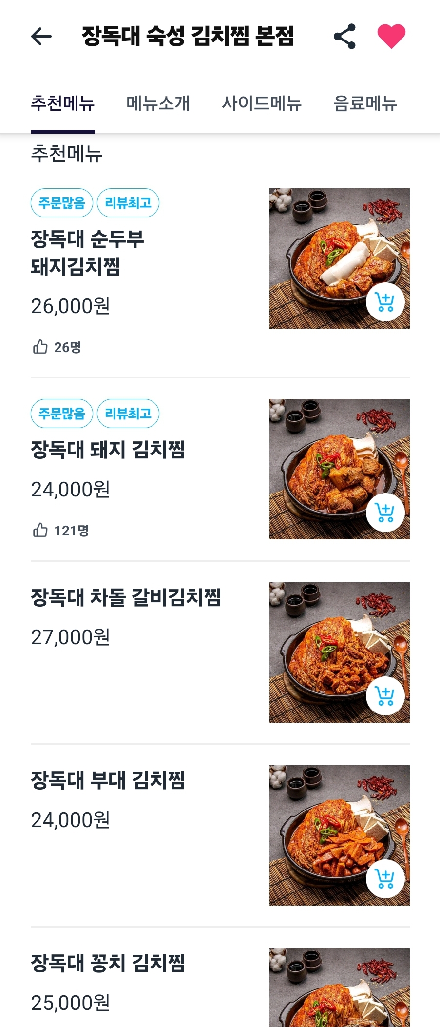 본점이 매교역, 수원시청역에서 가까운 편이라 배달 시간도 오래 걸리지 않을 것 같았고 메뉴는 장독대 순두부 돼지 김치찜, 돼지 김치찜, 차돌 갈비김치찜, 부대 김치찜, 꽁치 김치찜, 꼬꼬 김치찜 종류가 다양한 편이라 마음에 들었다.