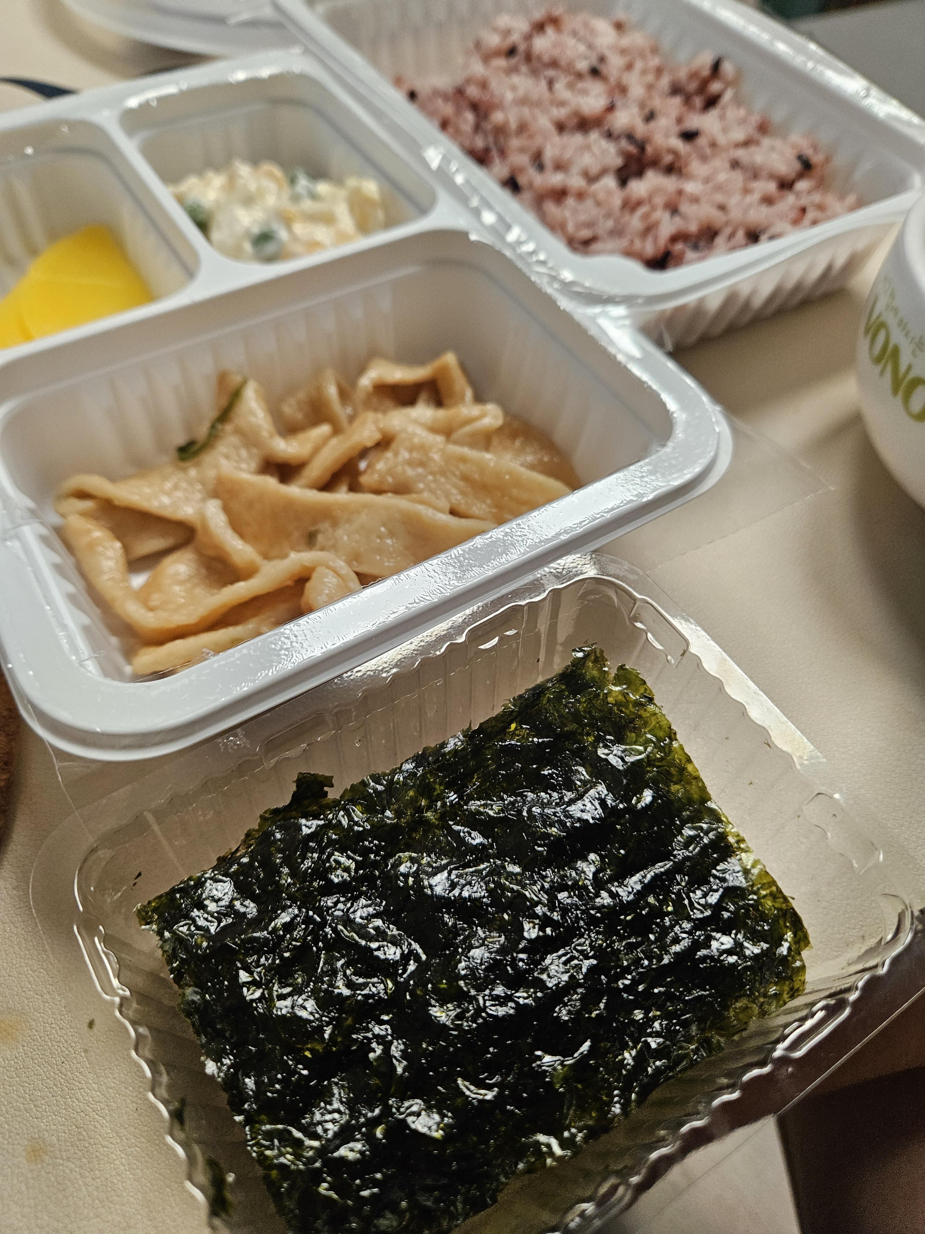반찬은 매운맛을 달래기 좋은 종류 위주에 김도 하나 주셨네.