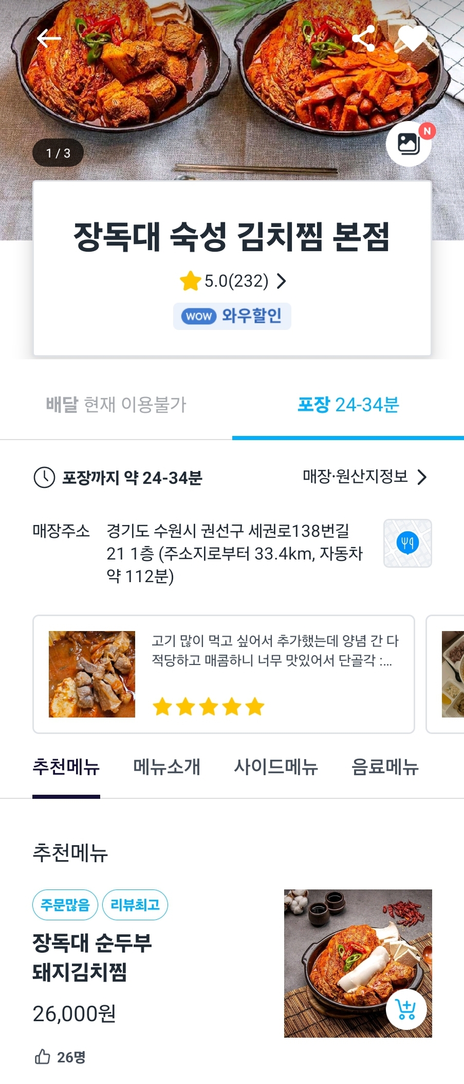 쿠팡와우회원이라 10% 할인받는 쿠팡이츠를 애용하는 편인데 수원 매운 음식 검색하다가 발견한 장독대 숙성 김치찜 본점.