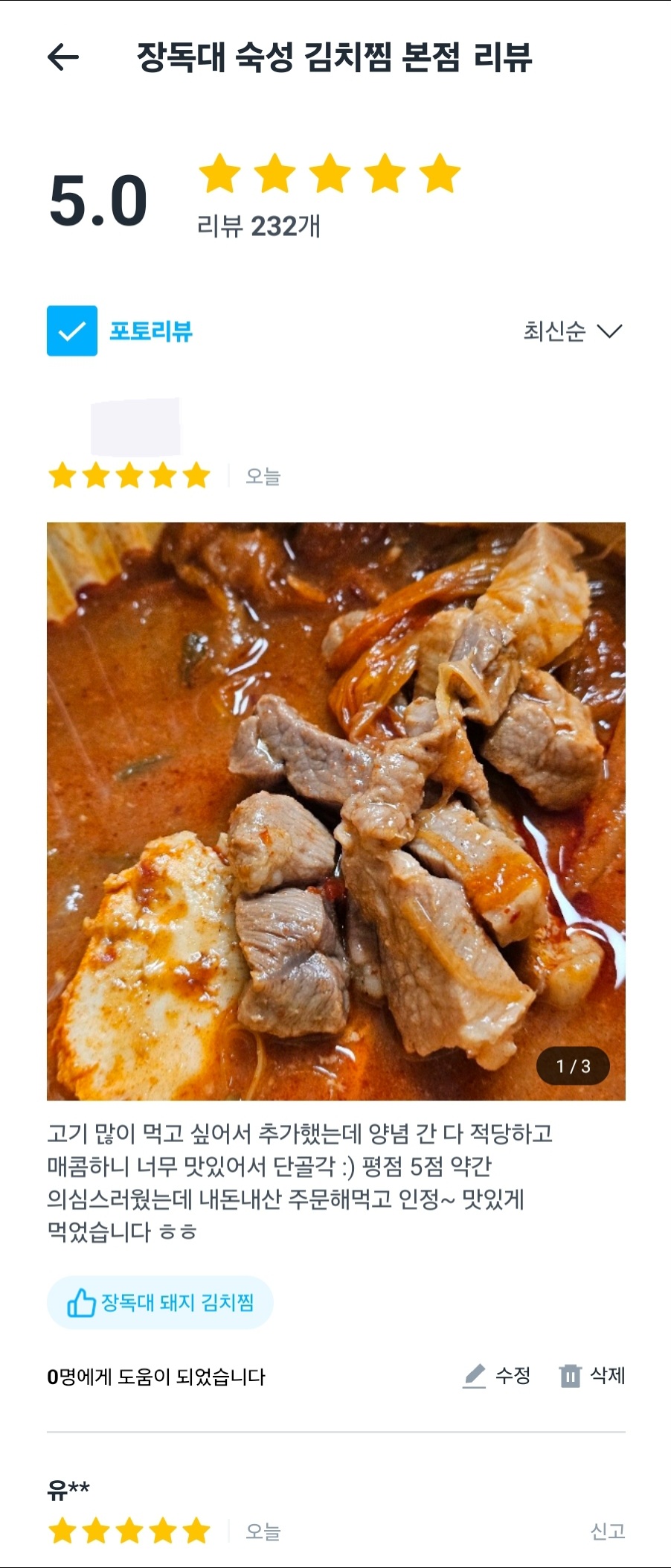 또 생각나는 김치찜~ 김치도 세로로 썰어서 쭉쭉 찢어 먹는 느낌도 나고 푹 익혀서 질기지 않고 여러모로 만족스러웠다. 별점리뷰 5개가 거짓이 아니었음 ㅎㅎ 김치찜 맛집 제대로 찾은 것 같아 흡족했다. 오늘 저녁 제대로 먹었음 🤤😋👍🍚🥄