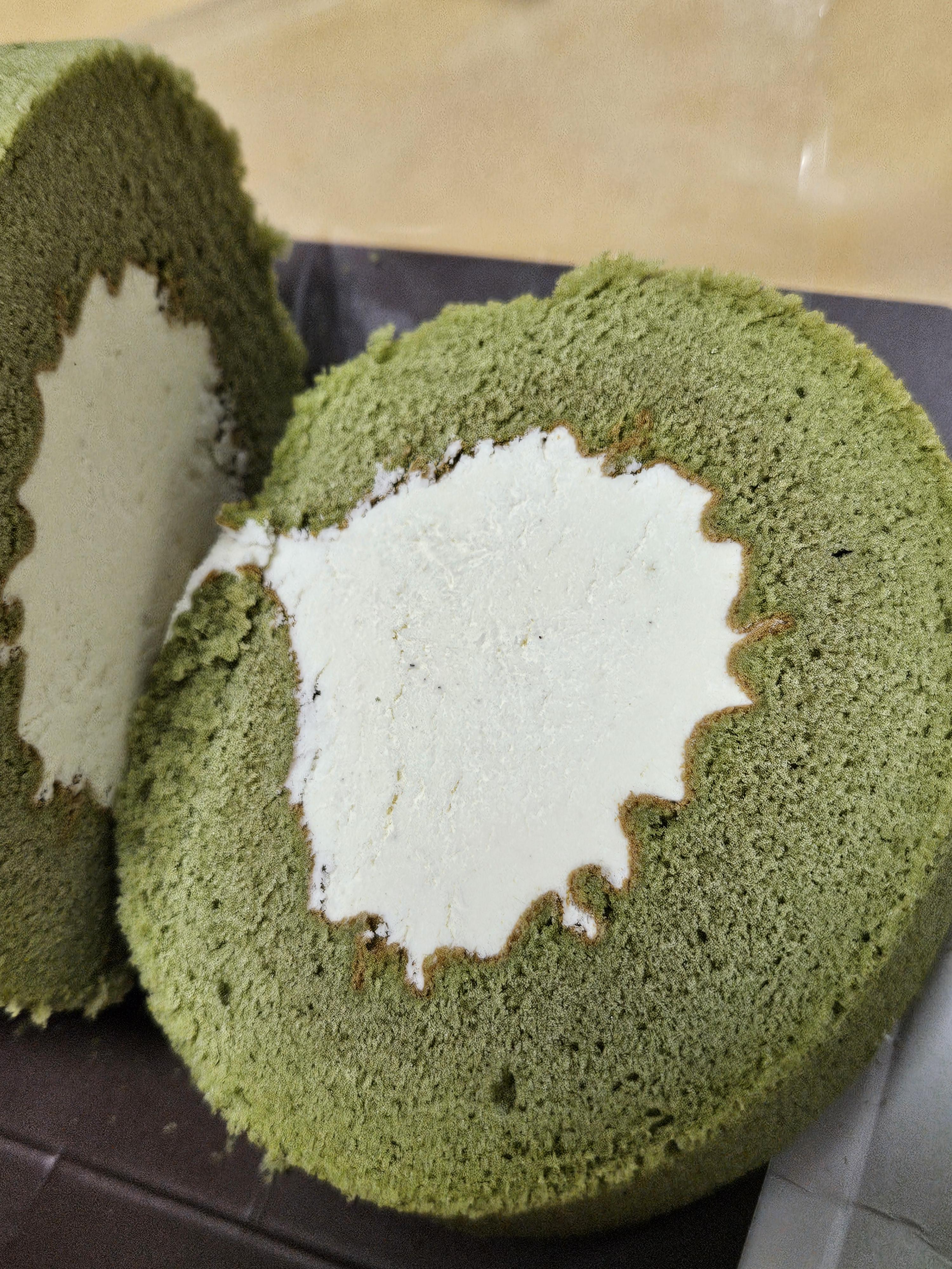 바로 잘라서 집에 있는 말차가루를 마스카포네 치즈 생크림에 톡톡뿌렸더니 시트보다 색이 진해졌다 ㅋㅋ 진해진 색 만큼이나 쌉싸름한 맛도 Up. 티푸드로 먹기 좋은 오설록 그린티 롤케이크.