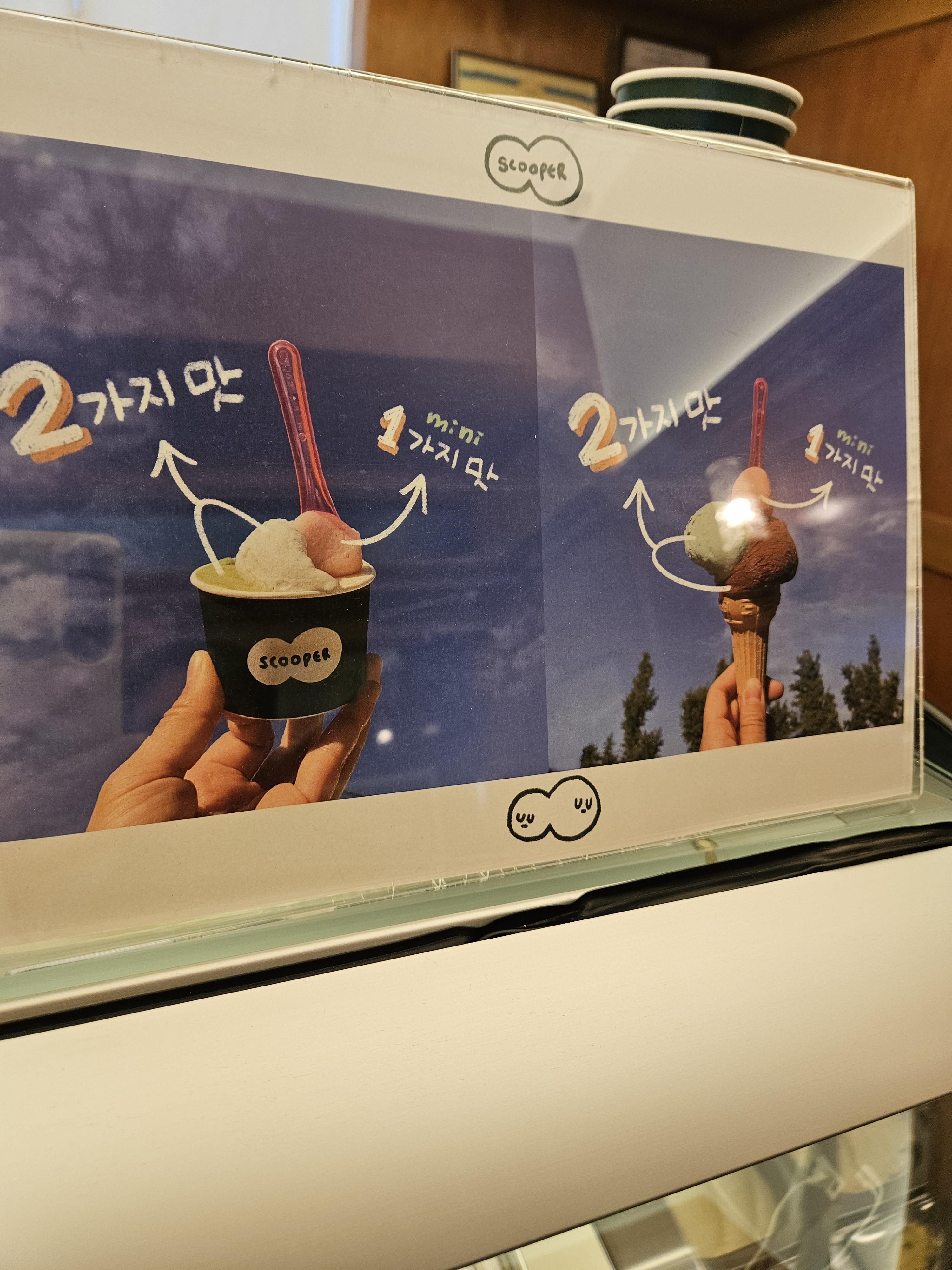 콘, 컵 선택하여 주문 가능하고 가격은 2가지 맛 + 1가지 미니(스푼 한 스쿱)가 5,5.