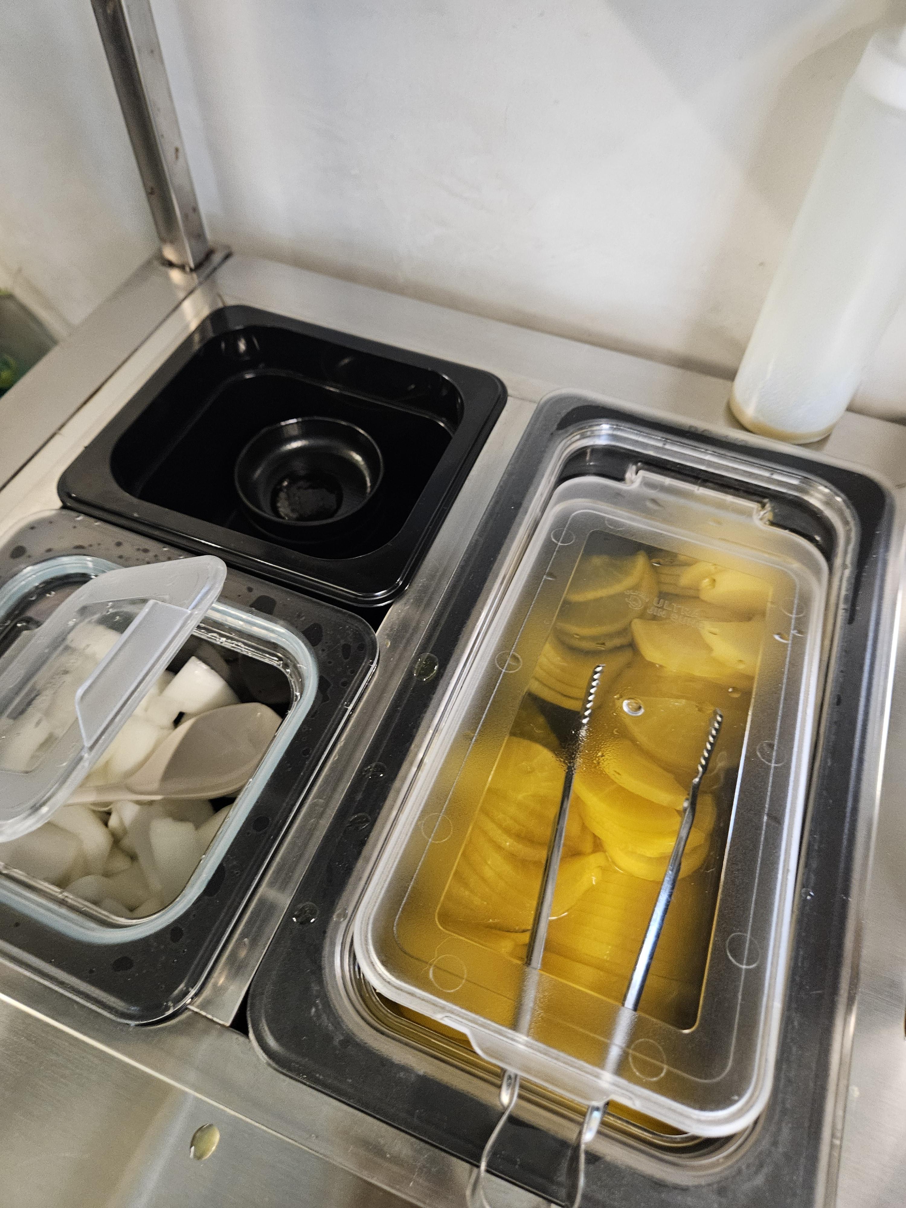 식사 공간은 3곳으로 나뉘어있고 각 룸마다 셀프바에 양파 단무지 앞치마 식기류가 비치되어 있는데 앞치마는 필수~ 뼈 바르고 짬뽕 면치기 하다 보면 사방에 빨간 육수 다 튐 주의 ⚠️