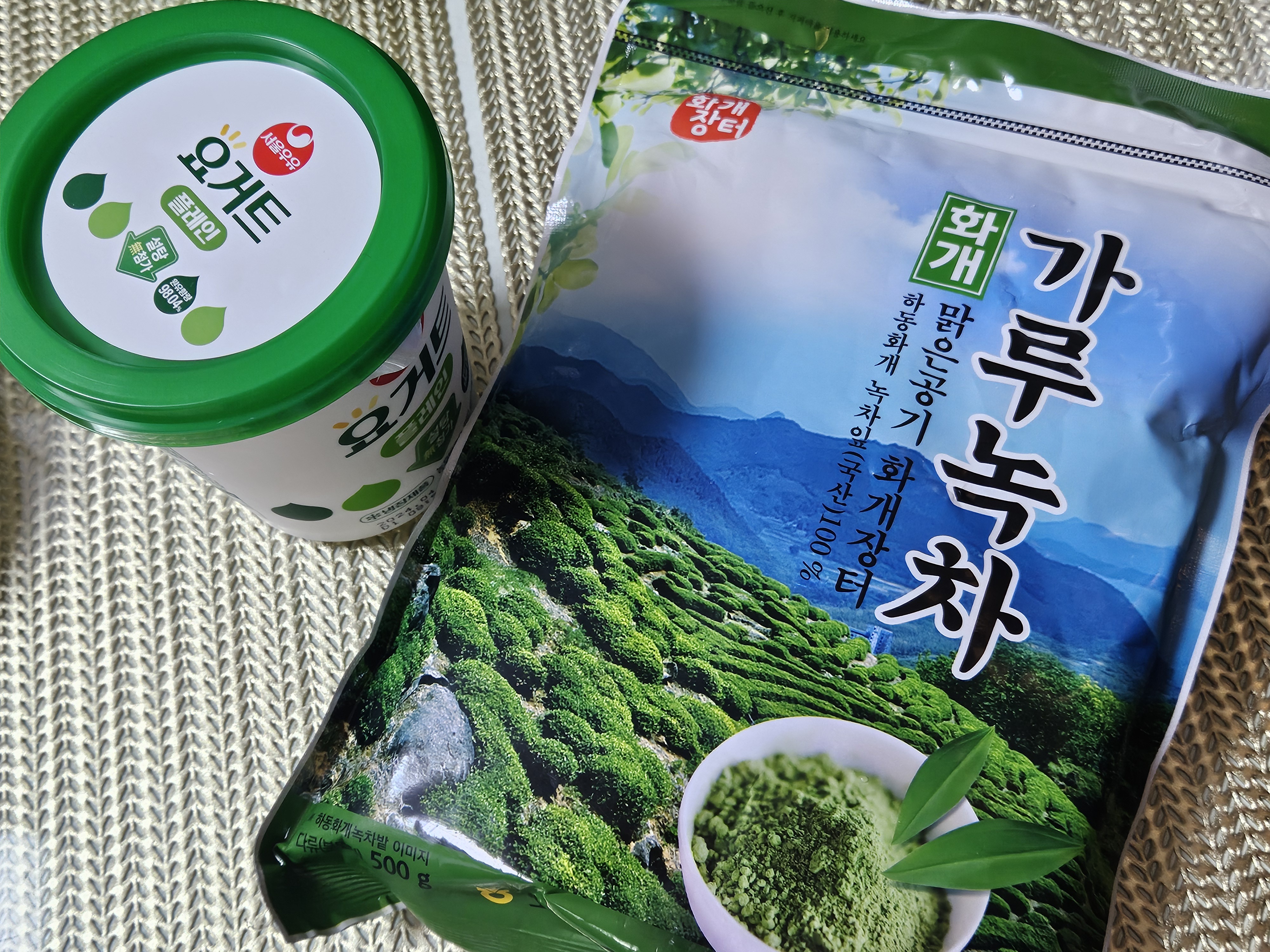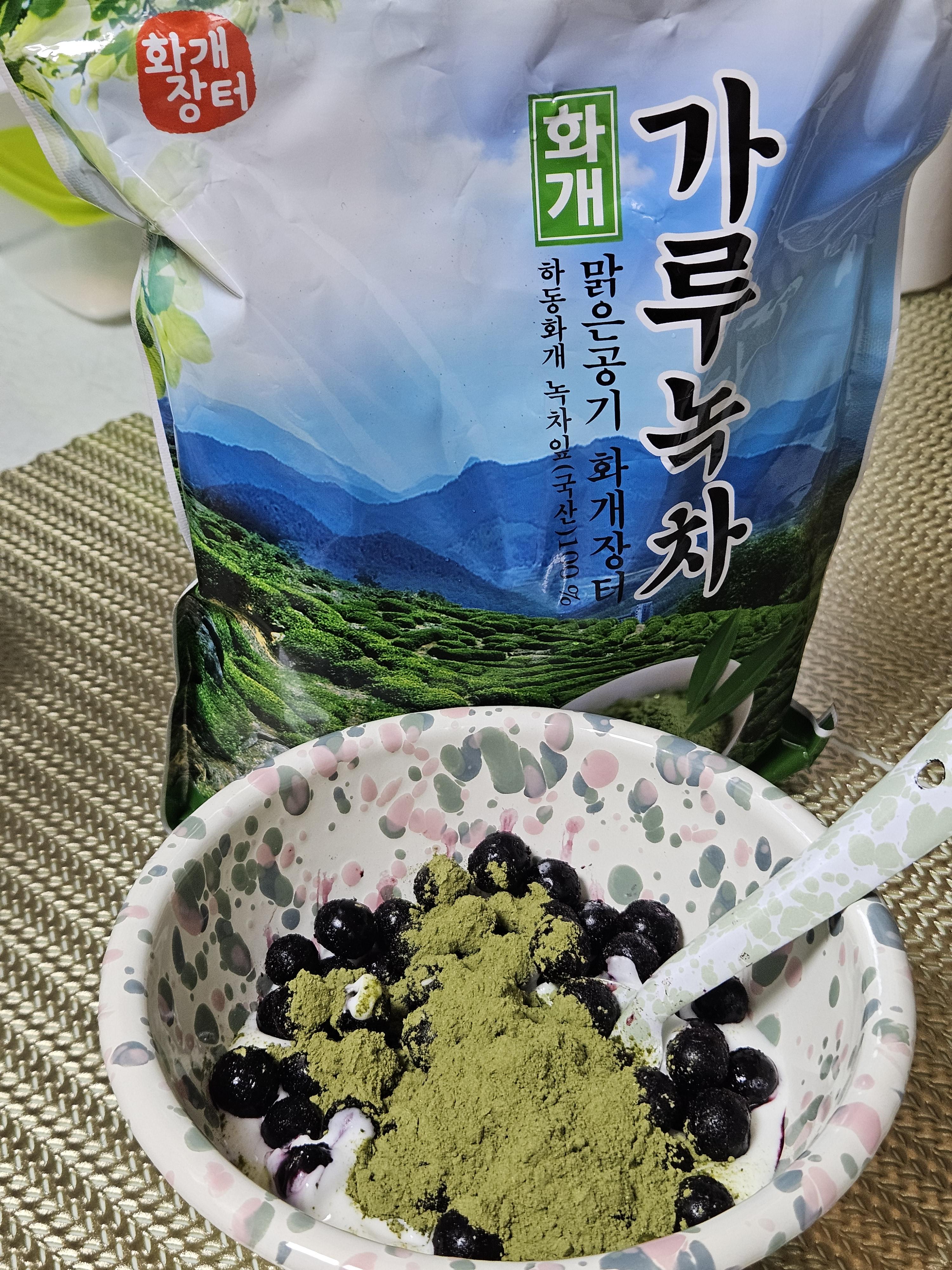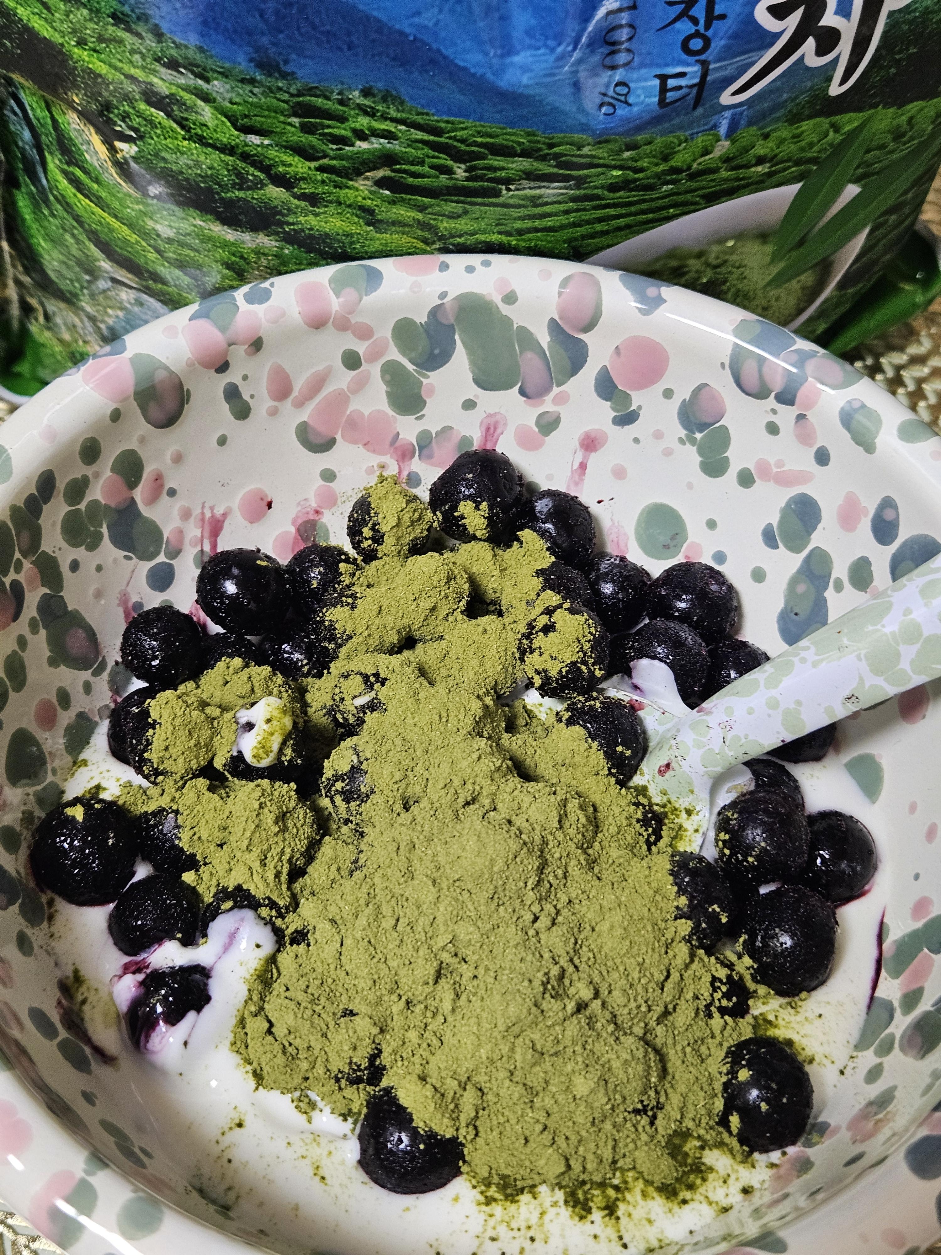 난 개봉하자마자 요거트에 섞어 먹으려고 지퍼백에 있는 가루 녹차 그대로 한 큰 술 떠서 무가당 플레인 요거트에 넣었음 ㅎㅎ