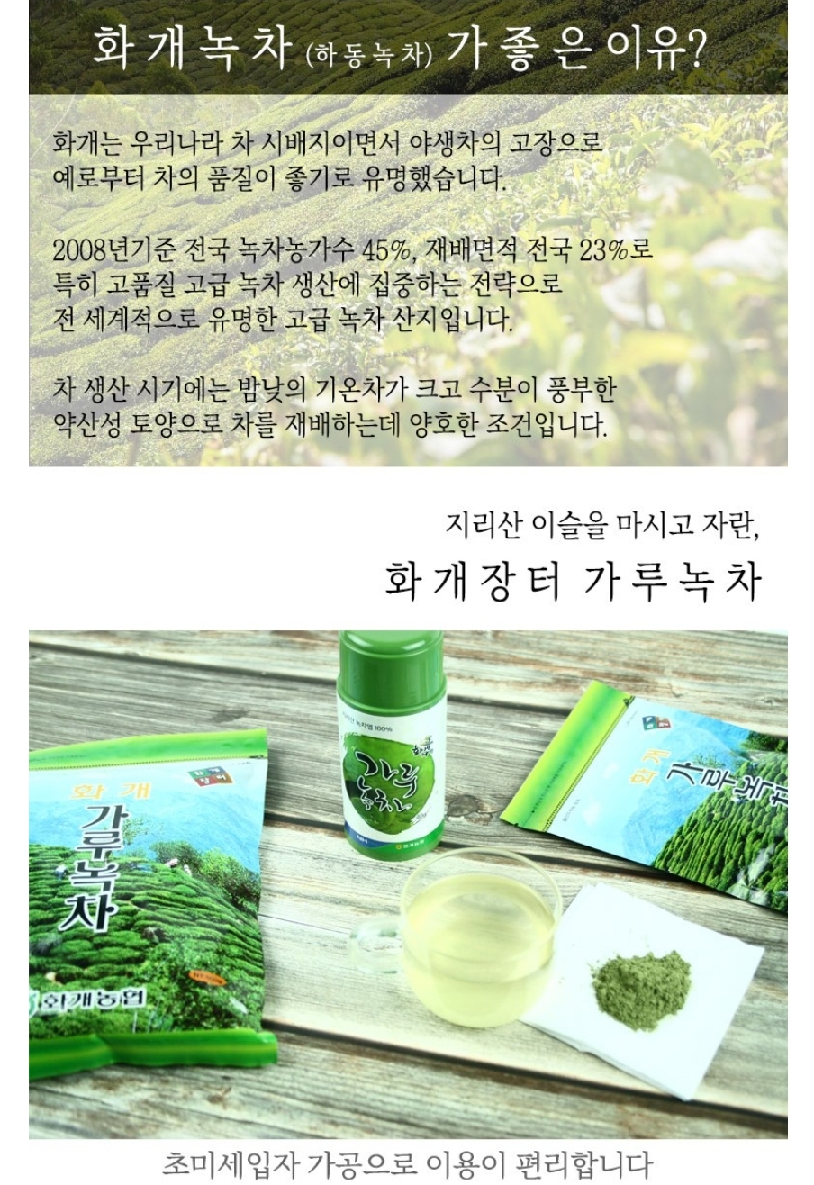 일단 지리산 이슬을 마시고 자란 화개장터의 가루녹차는 차 시배지 중 한 곳인 차의 고장 하동에서 농협이 엄선한 제품이라고 하니 믿고 먹을 수 있는 점이 만족스럽고 용량 대비 착한 가격은 두 말할 것도 없다.