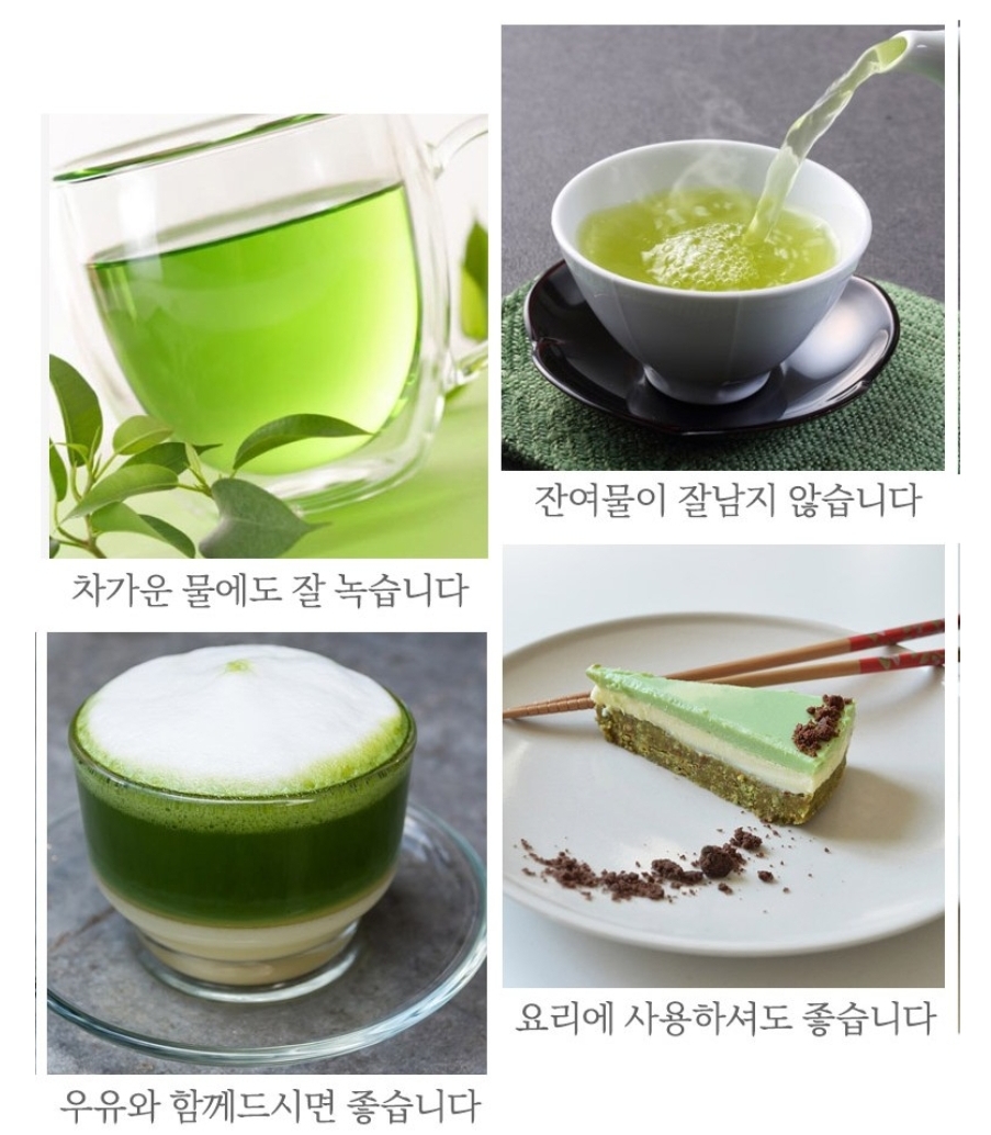 구매해서 꾸준히 먹고 있는데 식용으로 디저트, 베이킹 등 요리에 곁들이거나 라테 만들기 순수 녹차로 즐기기 혹은 미용(세안 마사지 등)으로 피부 관리, 천연 식용 색소 등으로 다양하게 활용할 수 있어 만능 가루다 🍵