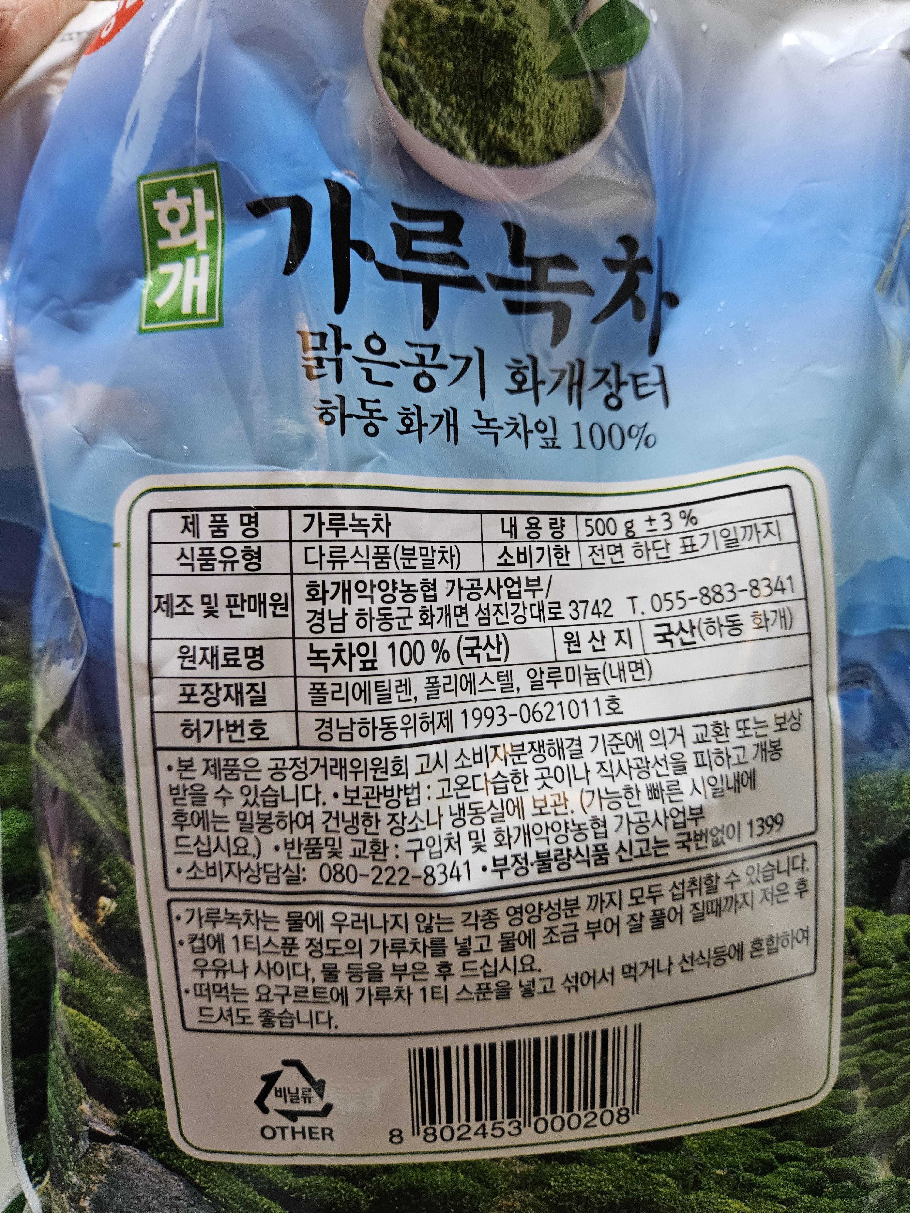 하동 화개농협 가루녹차로 1팩당 500g이라 40g짜리 오설록 가루녹차의 12배가 넘는 대용량이다.