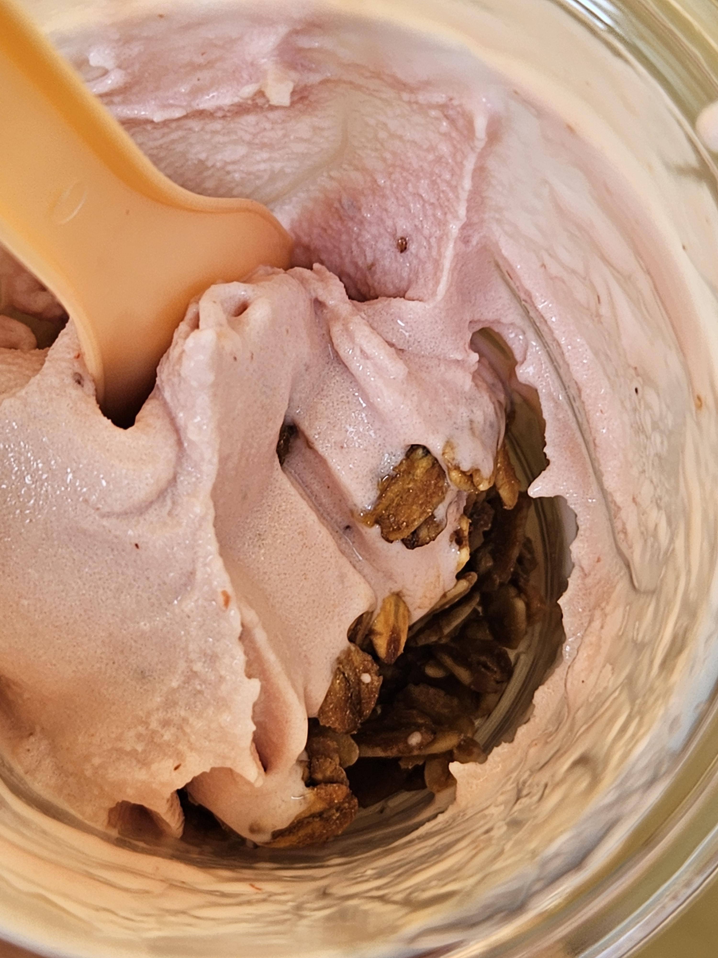 둘 다 아주 달지 않고 원재료의 맛도 잘 느껴지고 아이스크림 제일 밑에는 그래놀라 같은 걸 깔아줘서 심심하지 않은 아이스크림. 맛있다 🍓🍦😋