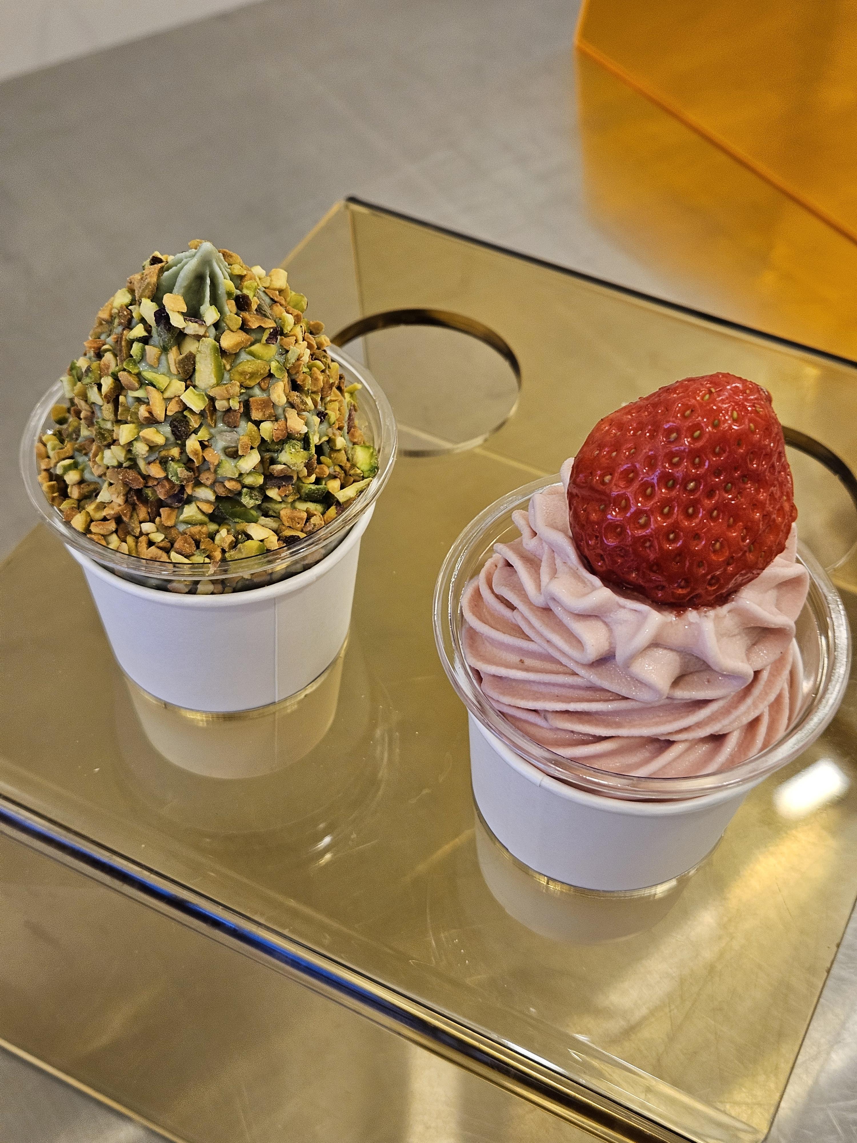 피스타치오(5,5)와 딸기 & 우유(5,6) 컵으로 골랐음. 메뉴명과 같은 원물을 그대로 올려주는 게 특징.