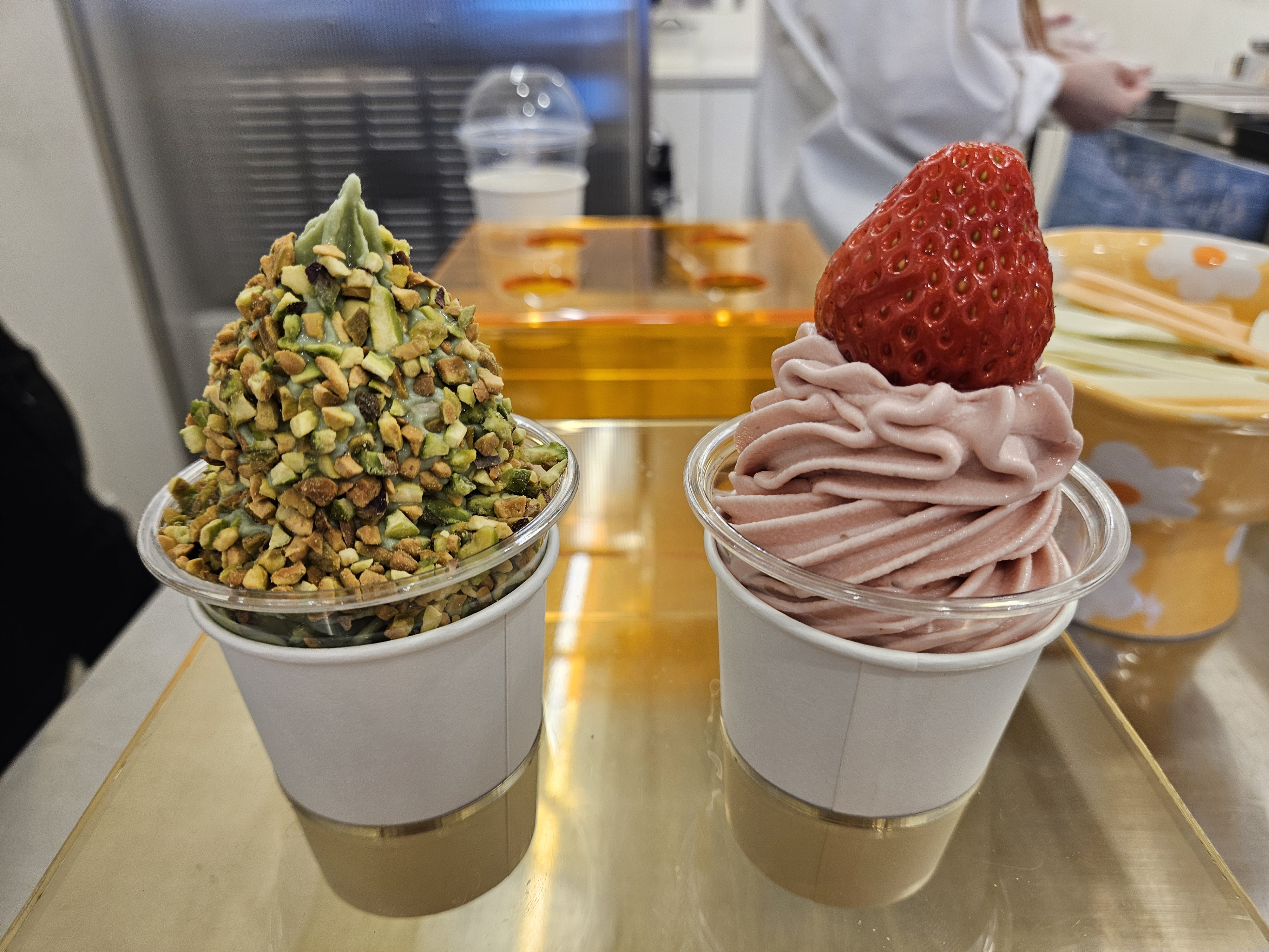 그때는 바질우유와 샤인머스켓을 먹었는데 이번에 갔더니 두 메뉴는 없고 우유 생크림, 피스타치오, 헤이즐넛 & 초콜릿, 딸기 & 우유 4가지 맛을 판매하고 있었다.