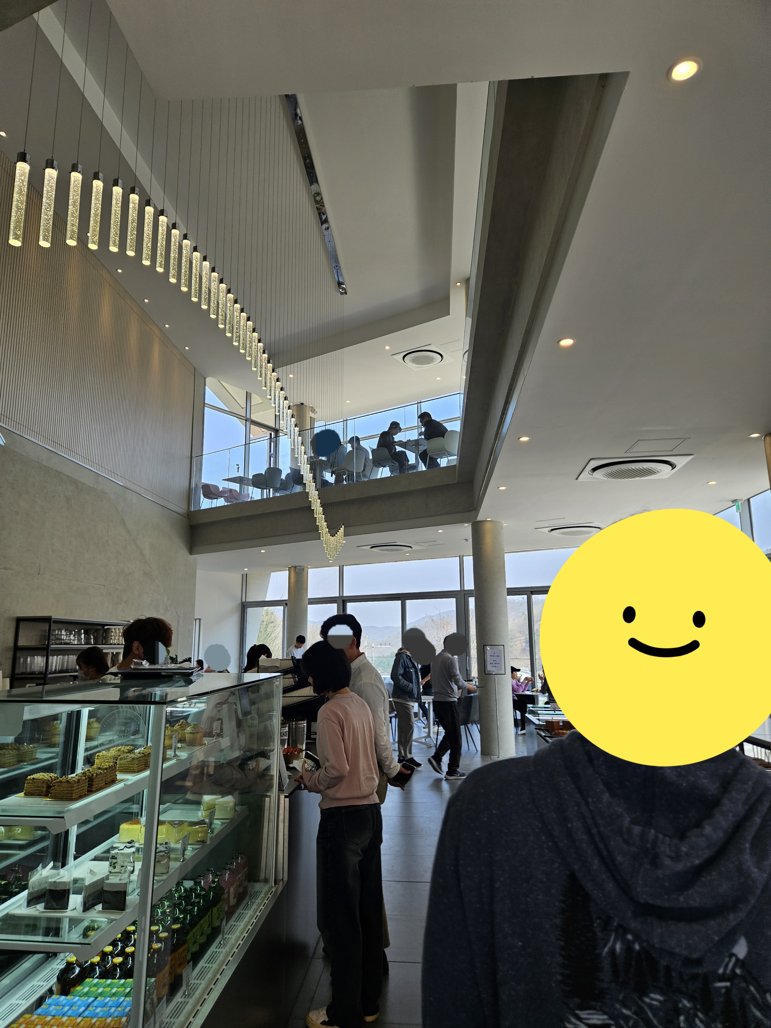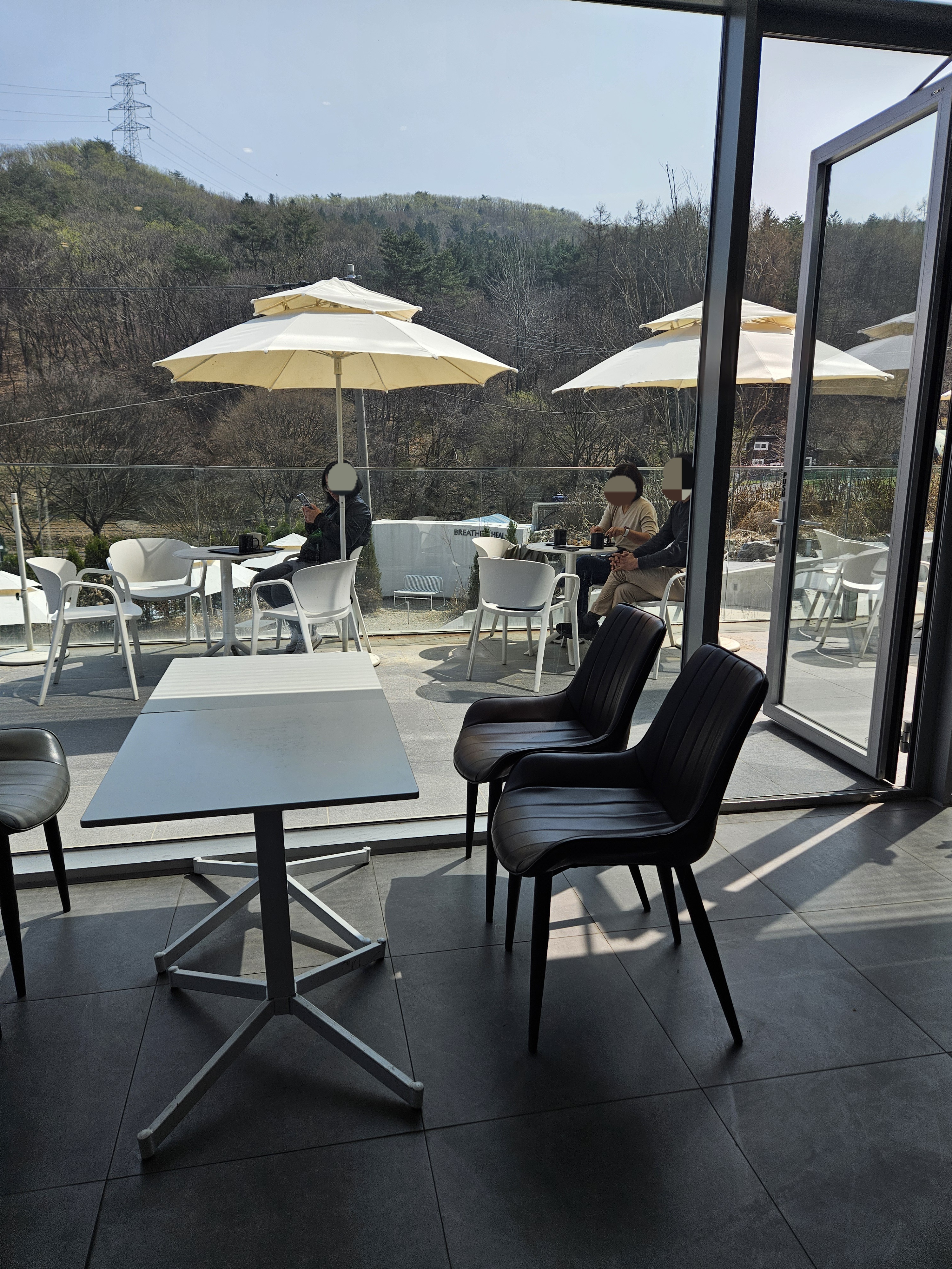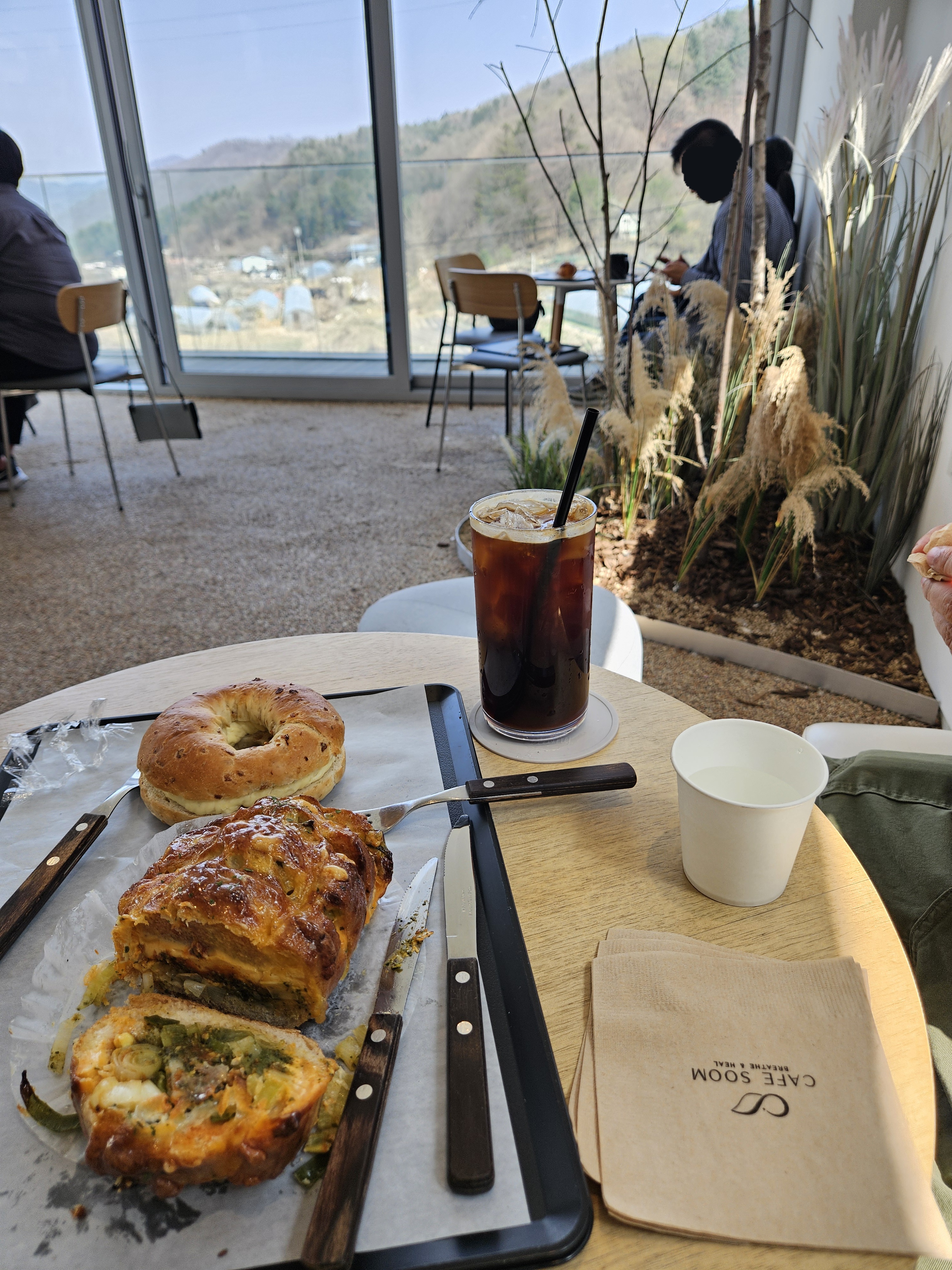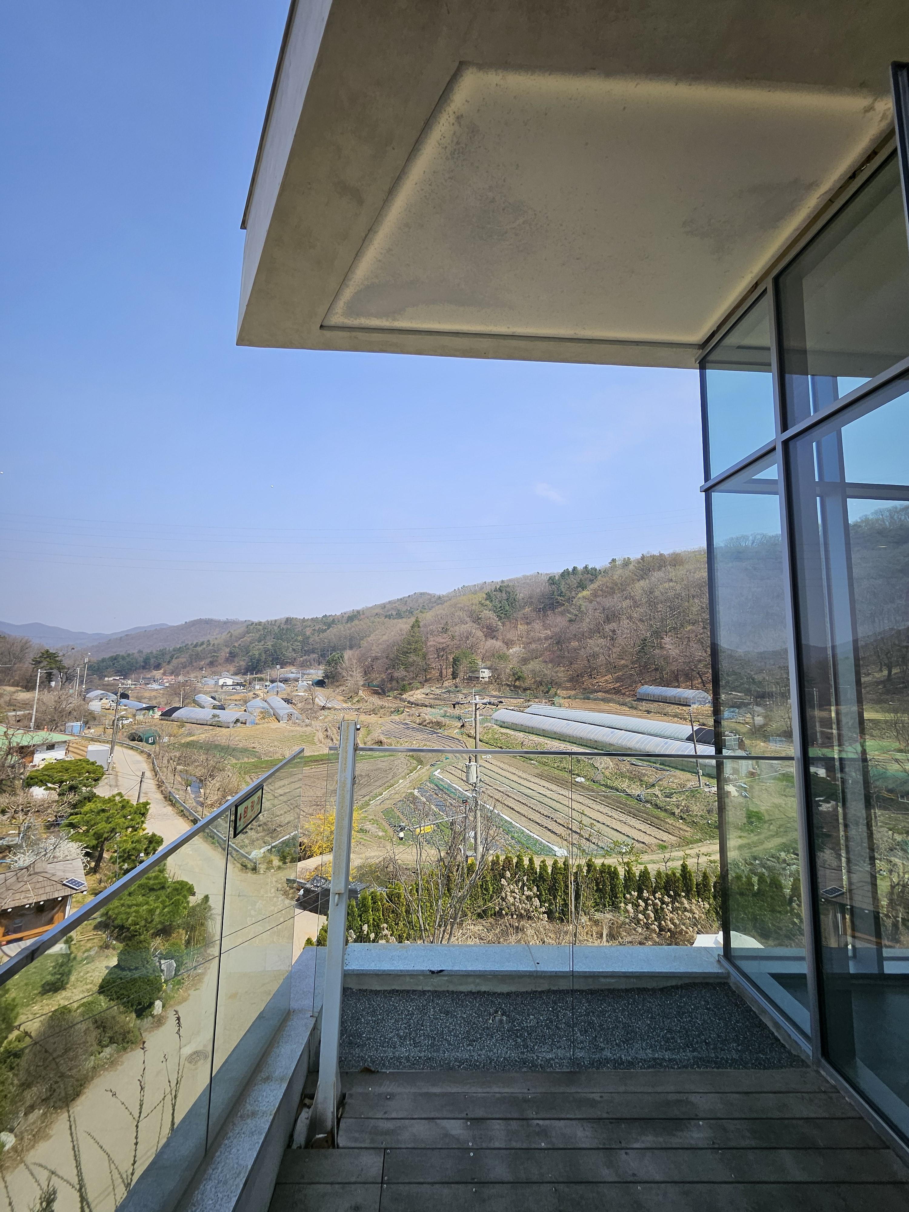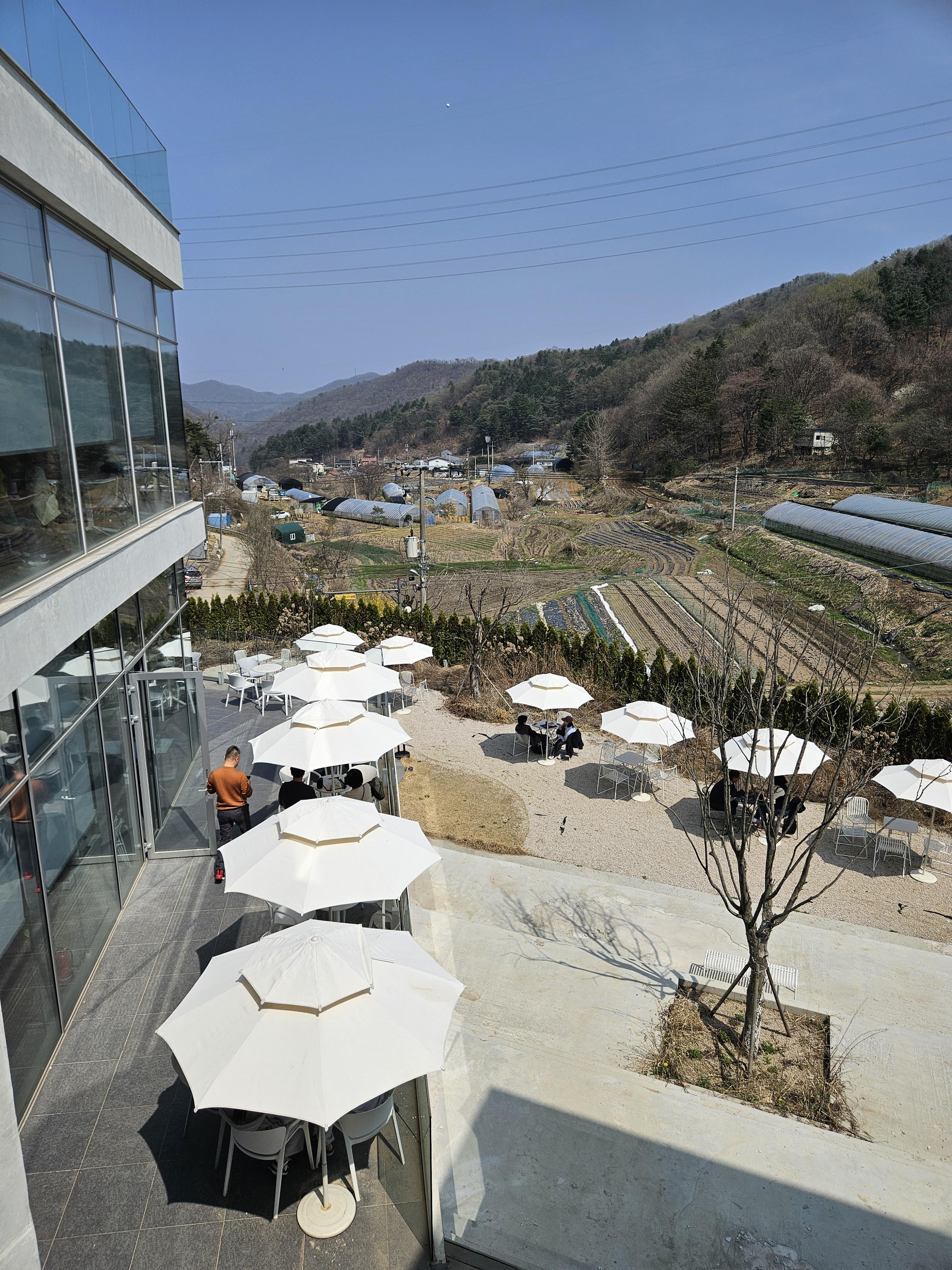 요즘은 논밭뷰도 힙하게 느끼는 사람이 많은지 비닐하우스와 산세가 보이는 창 측과 테라스에 사람들이 몰려 있었다.