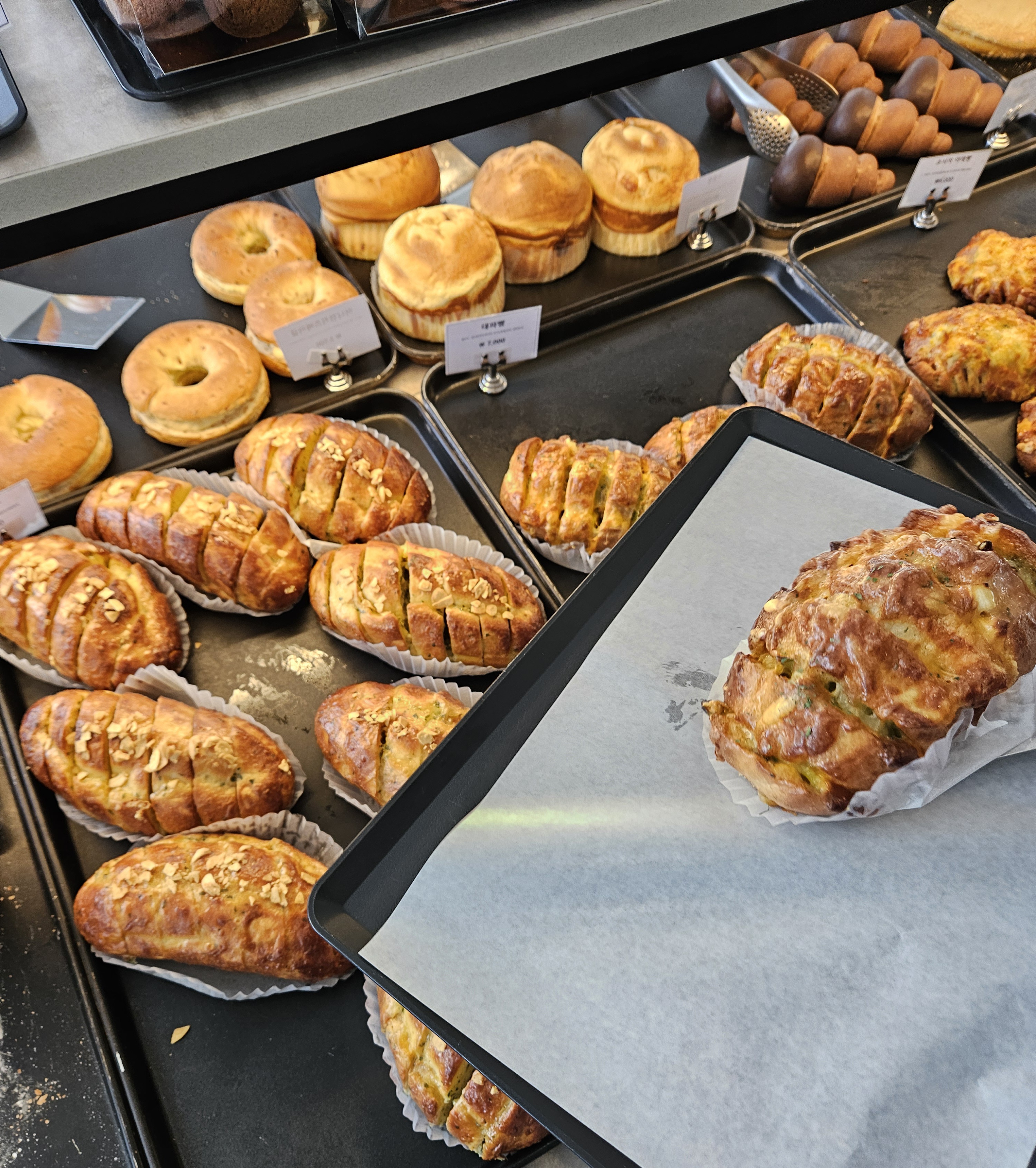 연탄빵 등을 비롯 수십 가지는 됐는데 마늘빵 대신 대파빵(7,0), 양파 크림치즈 베이글(5,5) 하나 고르고