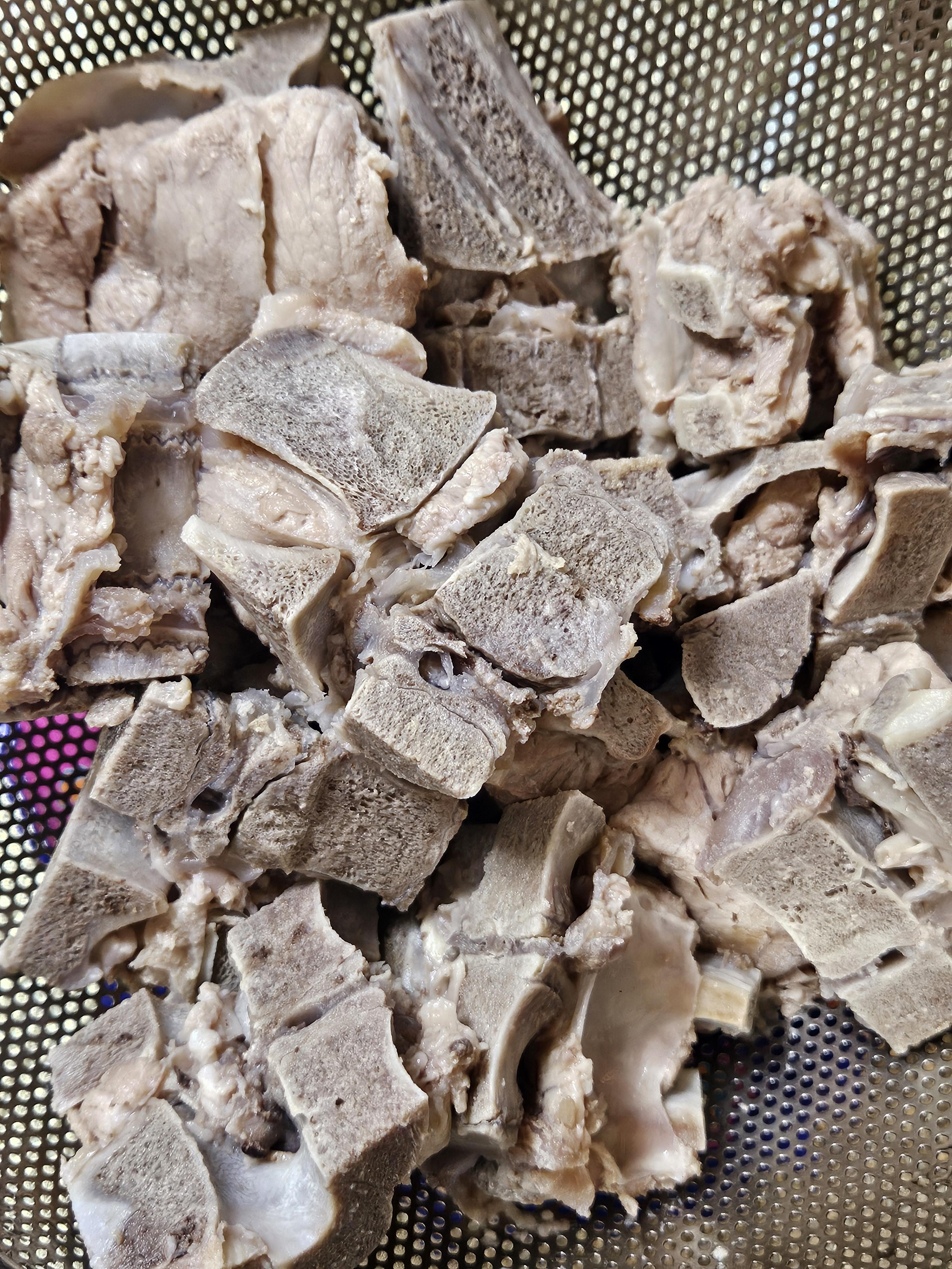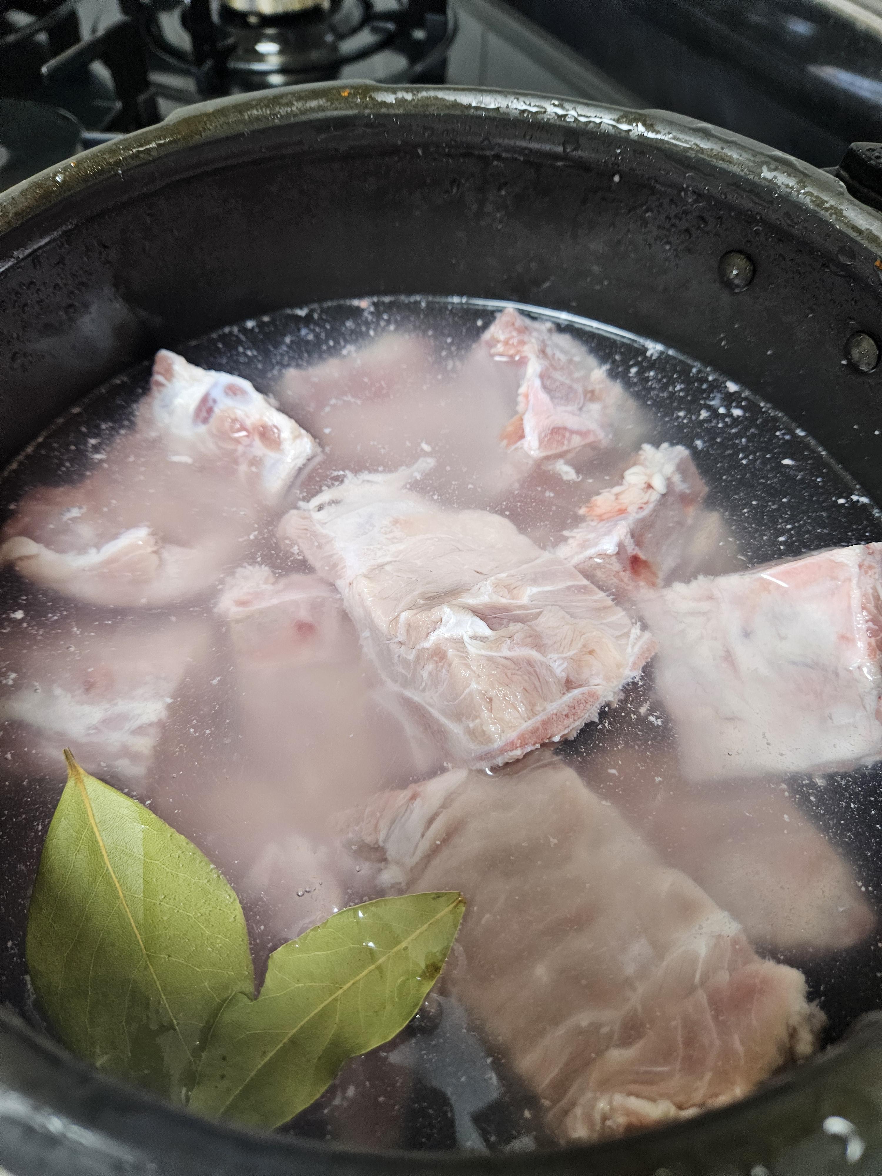 감자탕 해 먹고 나서 뜯지 않은 1팩도 밀키트처럼 쉽게 조리할 수 있도록 밑작업 하려고 핏물 제거하고 압력솥에 넣고 강불에 끓여 추가 돌아가기 시작하면 약불로 줄이고 20분 정도 끓인 후 불 끄고 어느 정도 식은 후 김을 빼니 발골하기 괜찮은 부드러운 식감의 등뼈로 완성된다.