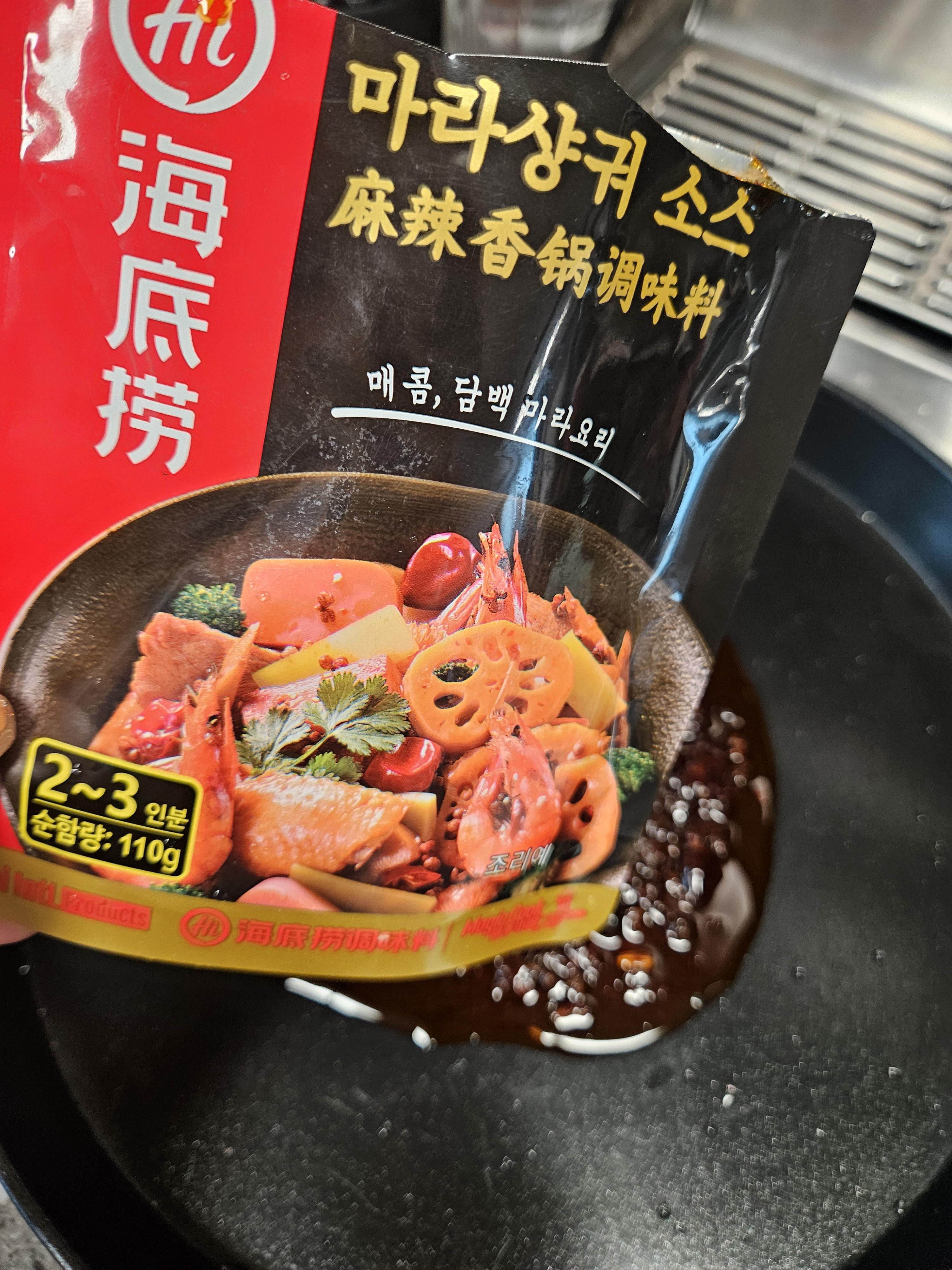 소스를 한국식으로 고춧가루랑 고추장을 넣어 만들지 간단하게 시판하는 소스를 사용할지 고민하다가 예전에 사 둔 하이디라오 마라샹궈 소스를 활용해 보려고 꺼냈음.