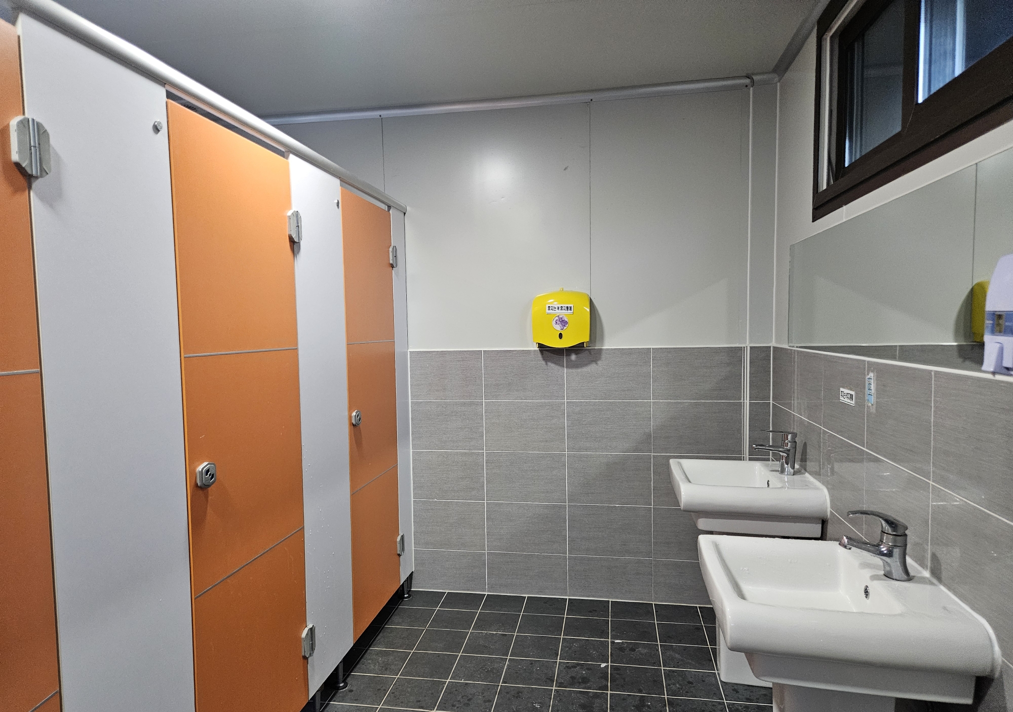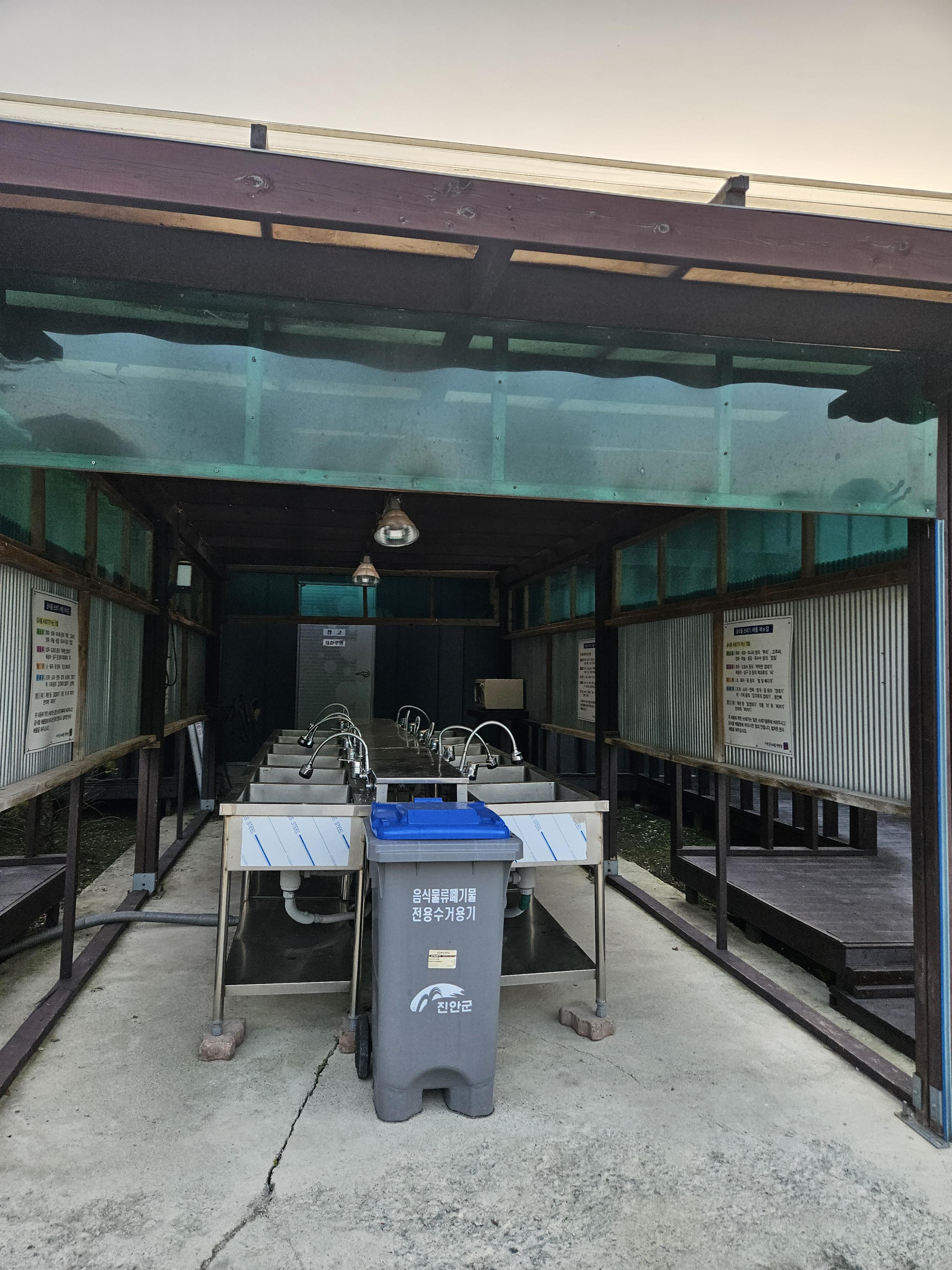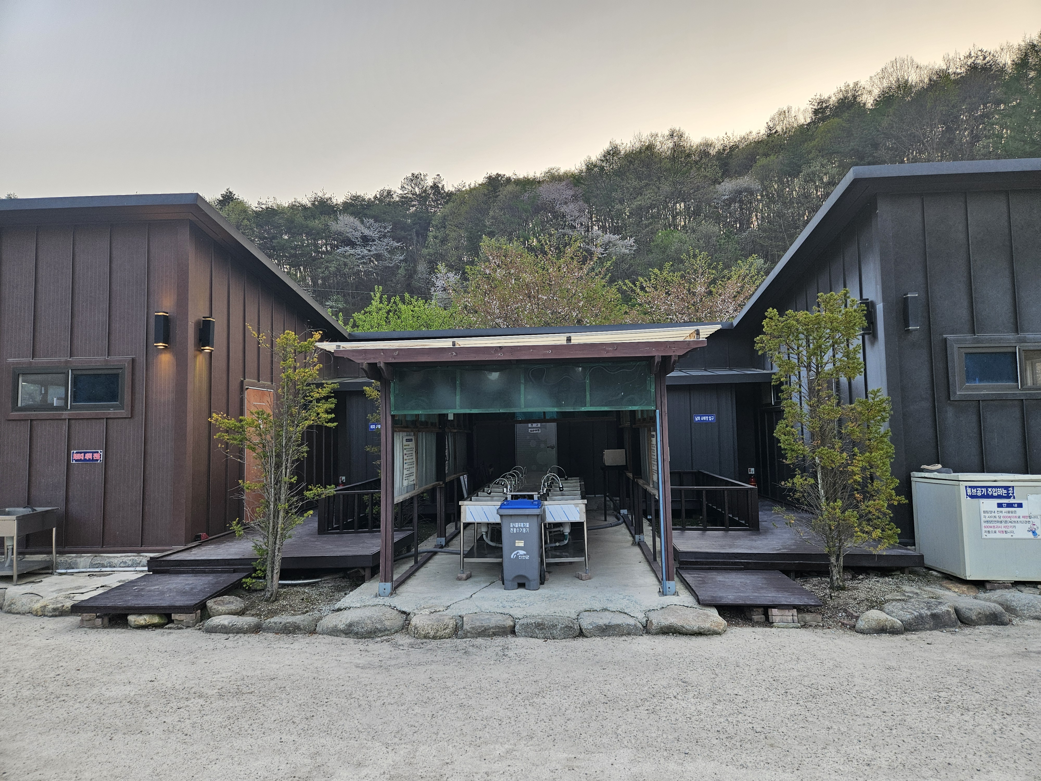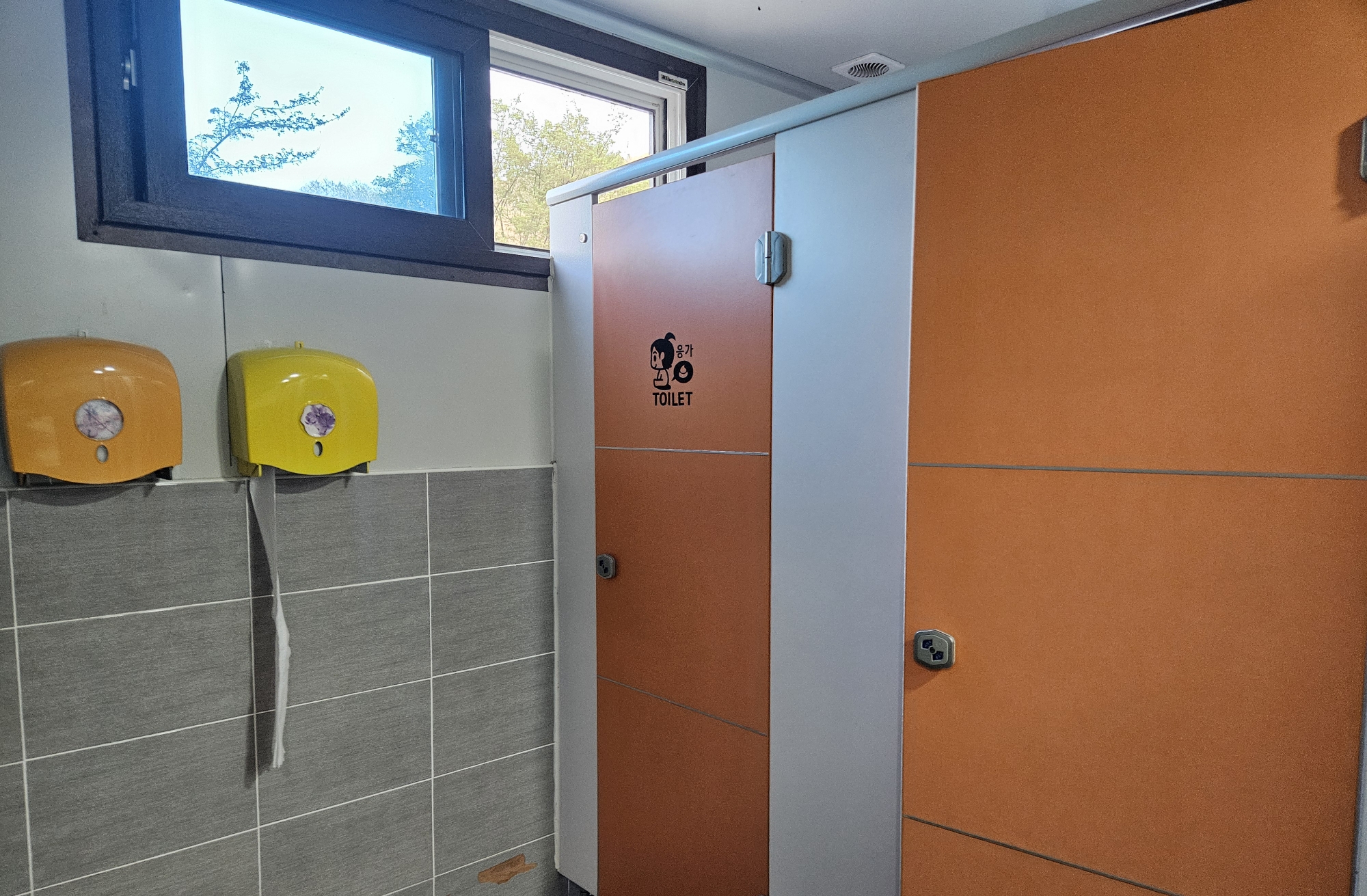 글램핑장 1-5 사이에 남녀공용 화장실과 샤워실이 2개 있었는데 글램핑장이 우리 근처는 다 비어있어 잠겨있었던 것 같은데 저녁에 캠지기가 오픈해 주셔서 밤에 화장실 가기 편했다.