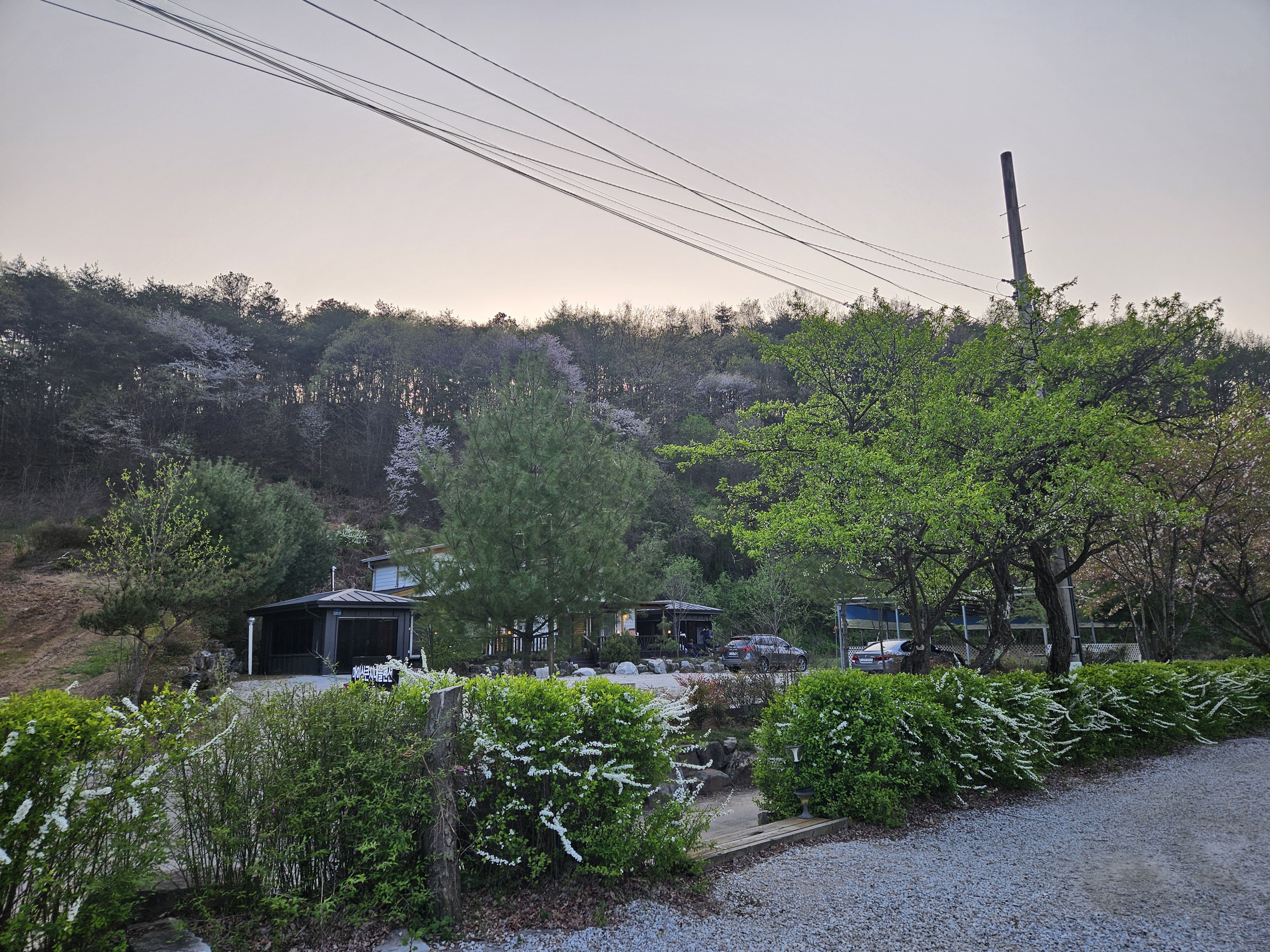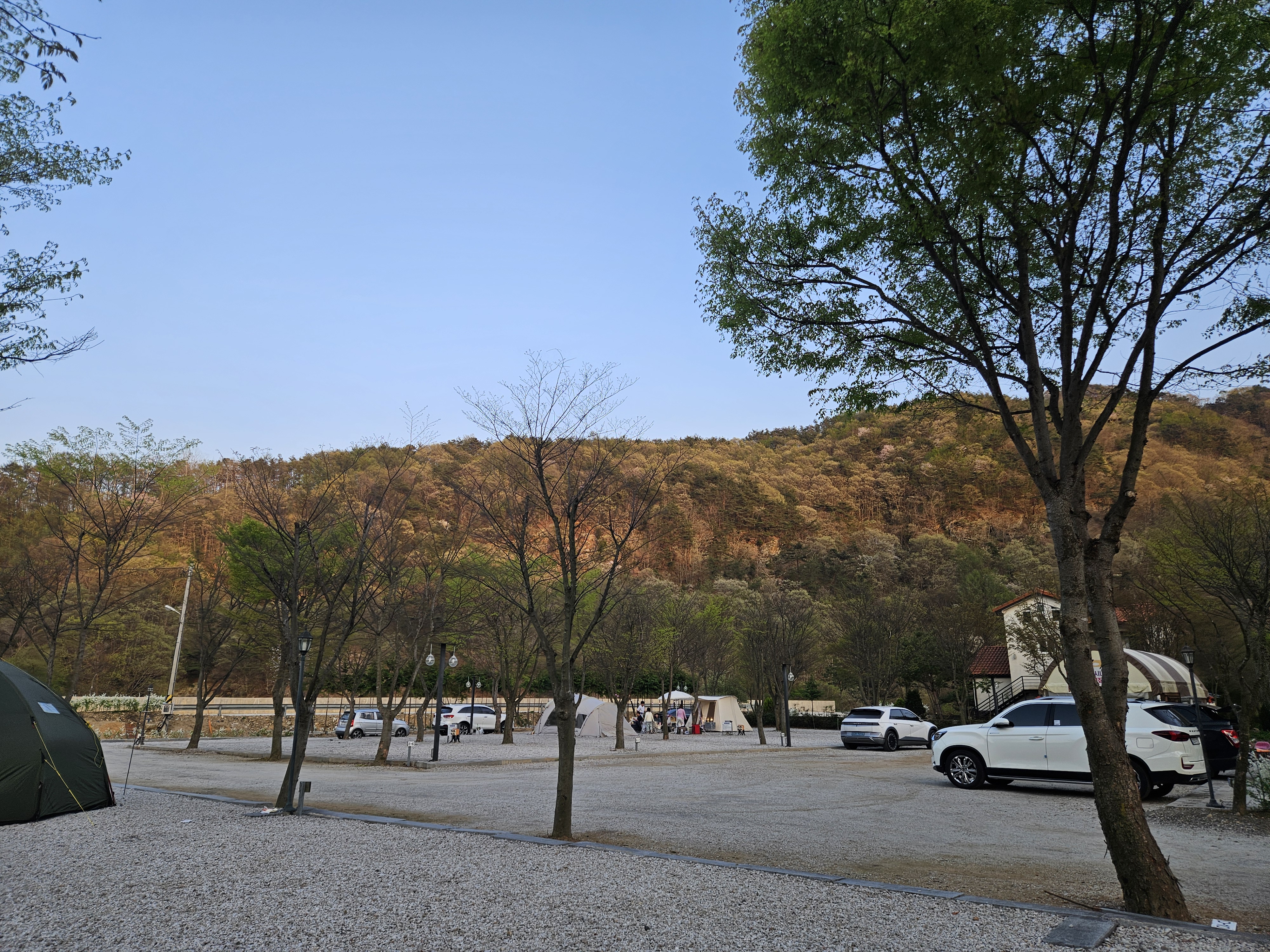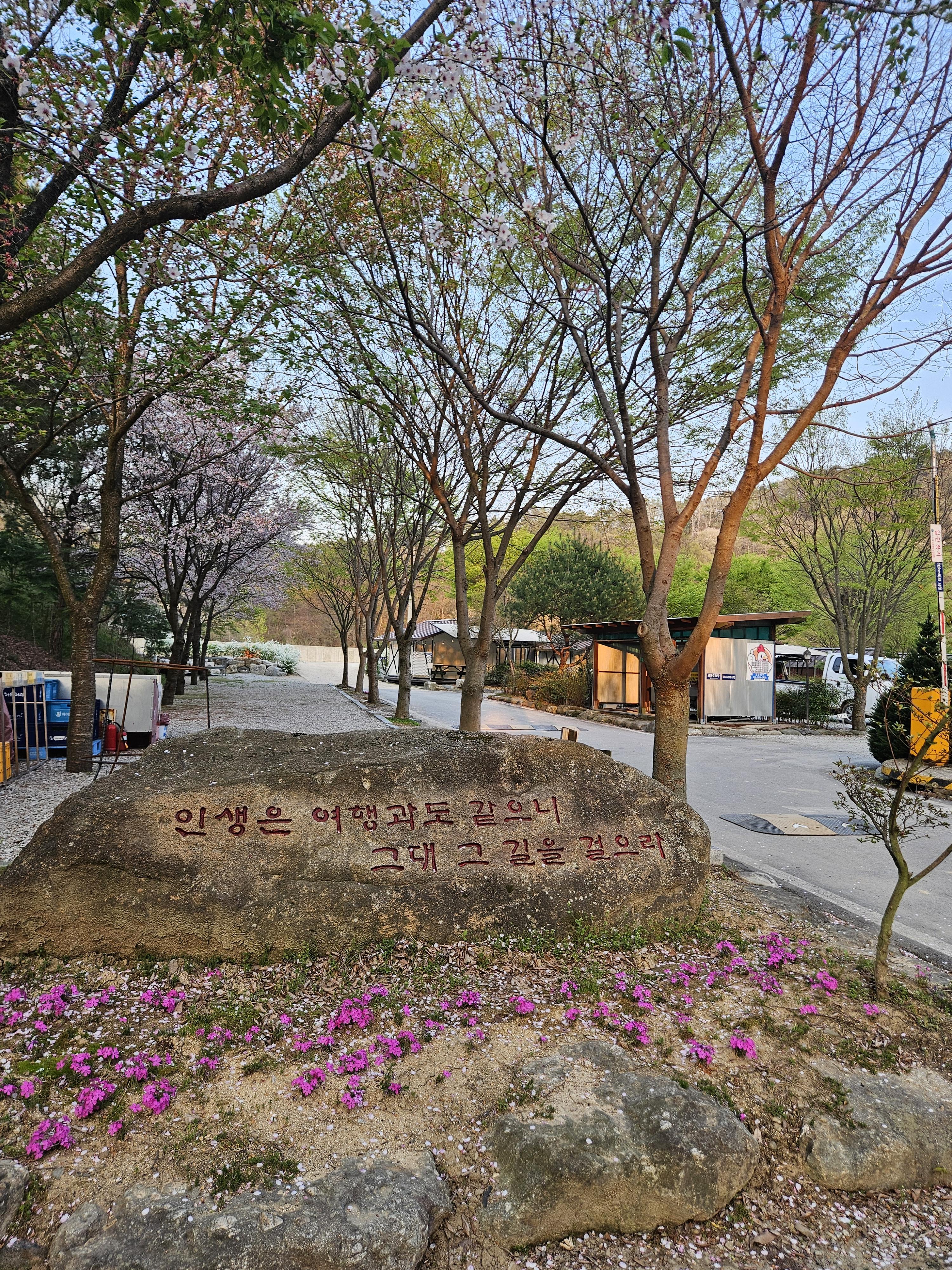캠핑장 한 바퀴 돌며 구역마다 다 가봤는데 산뷰라 마음에 들고 곳곳에 꽃잔디나 벚꽃 등 꽃이 피어 있어 경관이 괜찮았다.
