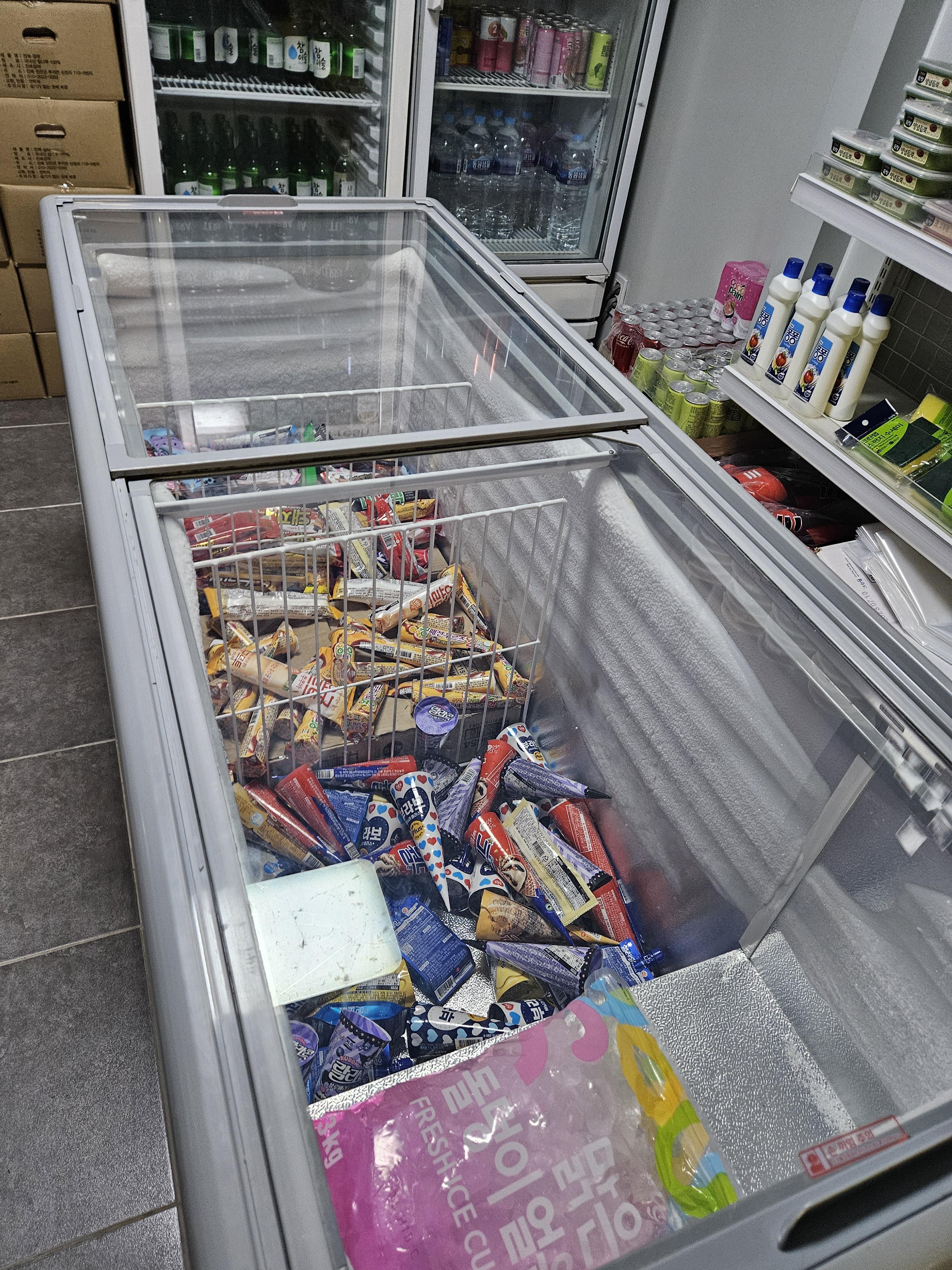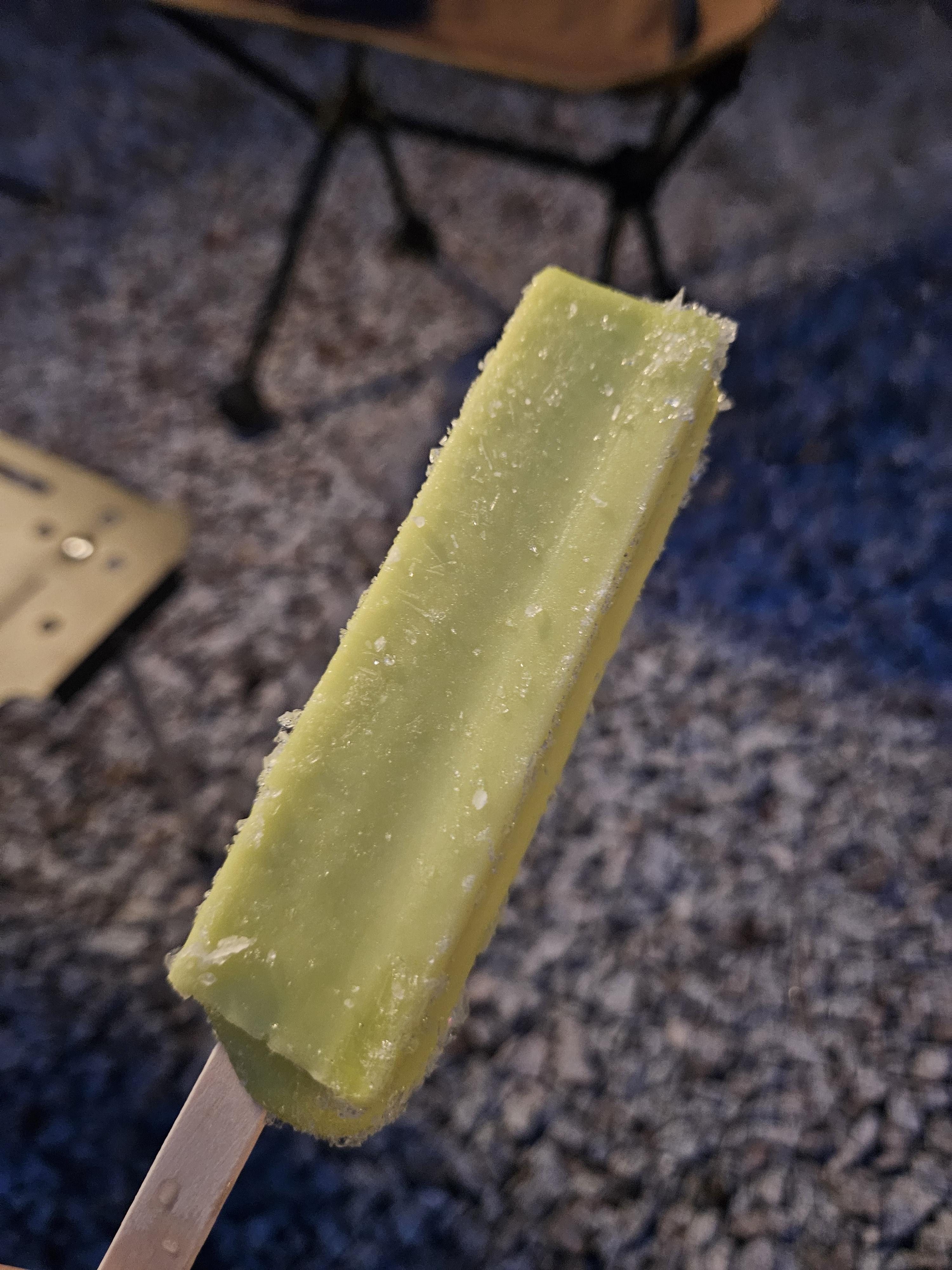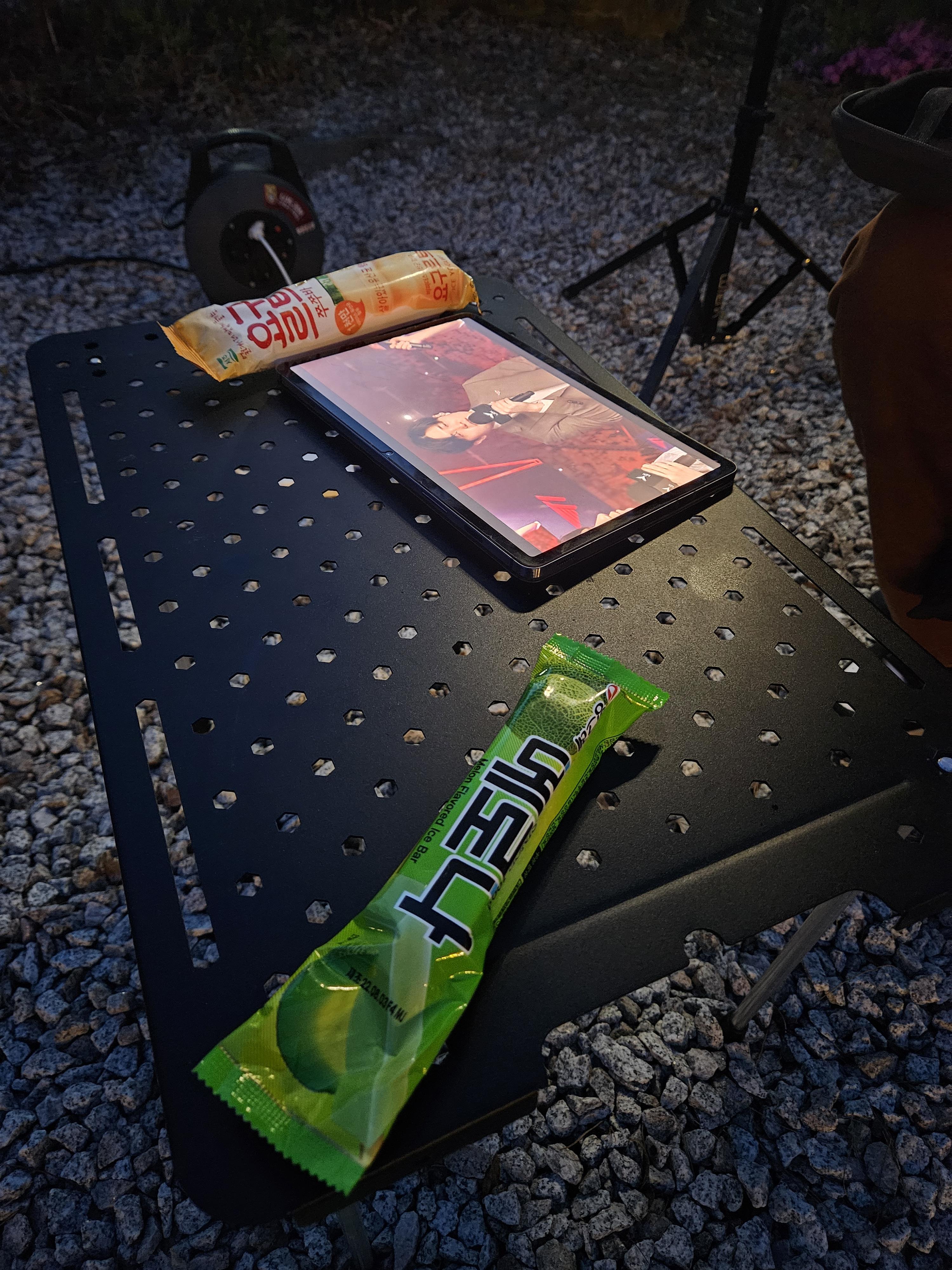 좀 놀다 보니 어두워졌는데 캠핑의자와 테이블 설치해 줘서 나는 매점에 가서 쭈쭈바랑 메로나 하나사왔다. 근데 메로나 제조일이 2년 전이라 당황 😢 최근 생산된 제품 구비해 주세요 ㅎㅎ