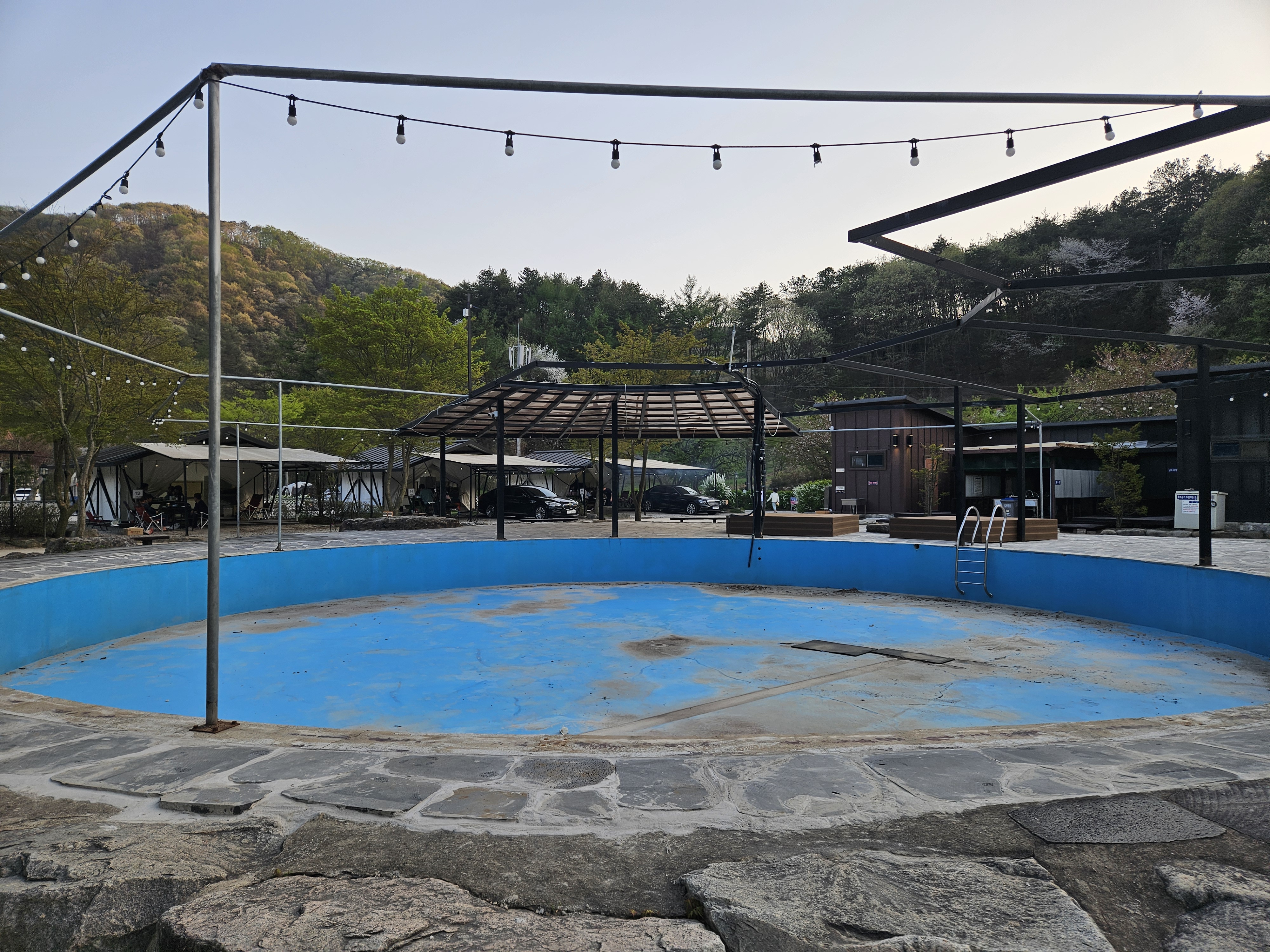 캠핑장은 오토캠핑과 글램핑, 펜션이 혼합된 곳인데 캠핑장 중안에 큰 수영장도 있었다. 현재는 운영하고 있지 않지만 여름에 개장하면 물놀이하기에도 좋아 보이고 트램펄린도 있어서 아이들 동반한 가족단위 캠퍼들이 방문하면 좋을 듯.