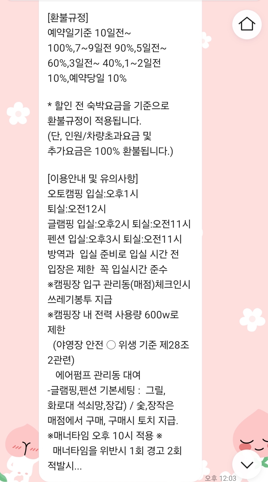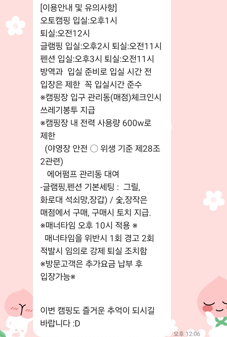 캠핑이 아닌 땡큐 캠핑이란 사이트를 통해 예약 신청했는데 카드 결제는 안 됐고 계좌이체만 가능하더라. 계좌이체 하니 예약 확정문자가 발송돼서 보니 오토캠핑 입실은 오후 1시부터 퇴실은 오후 12시.