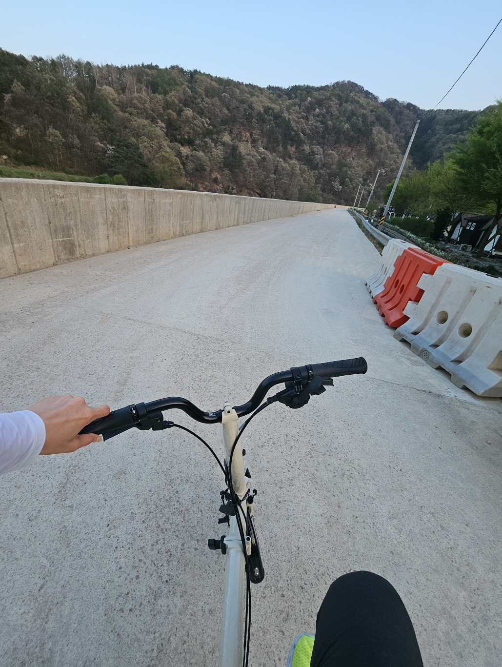 자전거 타고 놀고 있으라고 해서 ㅎㅎ 자전거 펴서 글램핑장 뒷길이 포장된 길이라 자전거 몇 번 타긴 했는데 자갈 모래가 더러 깔려있어 타이어 컨디션이 좋지 않을 거 같아 몇 번 타고 접었네 ㅎㅎ 캠핑 와서 자전거 타니까 신나긴 하더라.