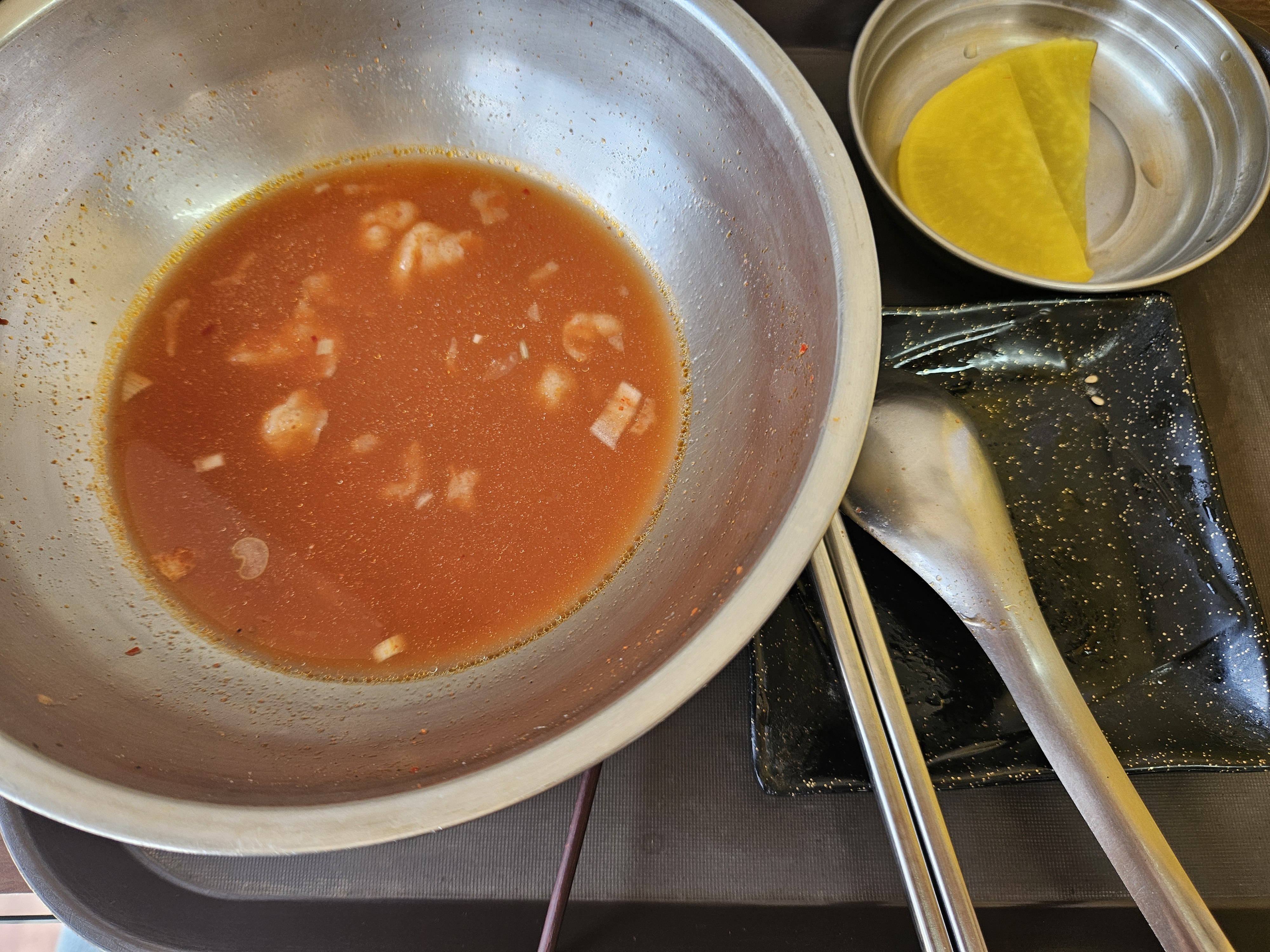 기본은 맵지 않고 시원한 맛이라 테이블에 있는 고춧가루와 식초 한 방울 넣고