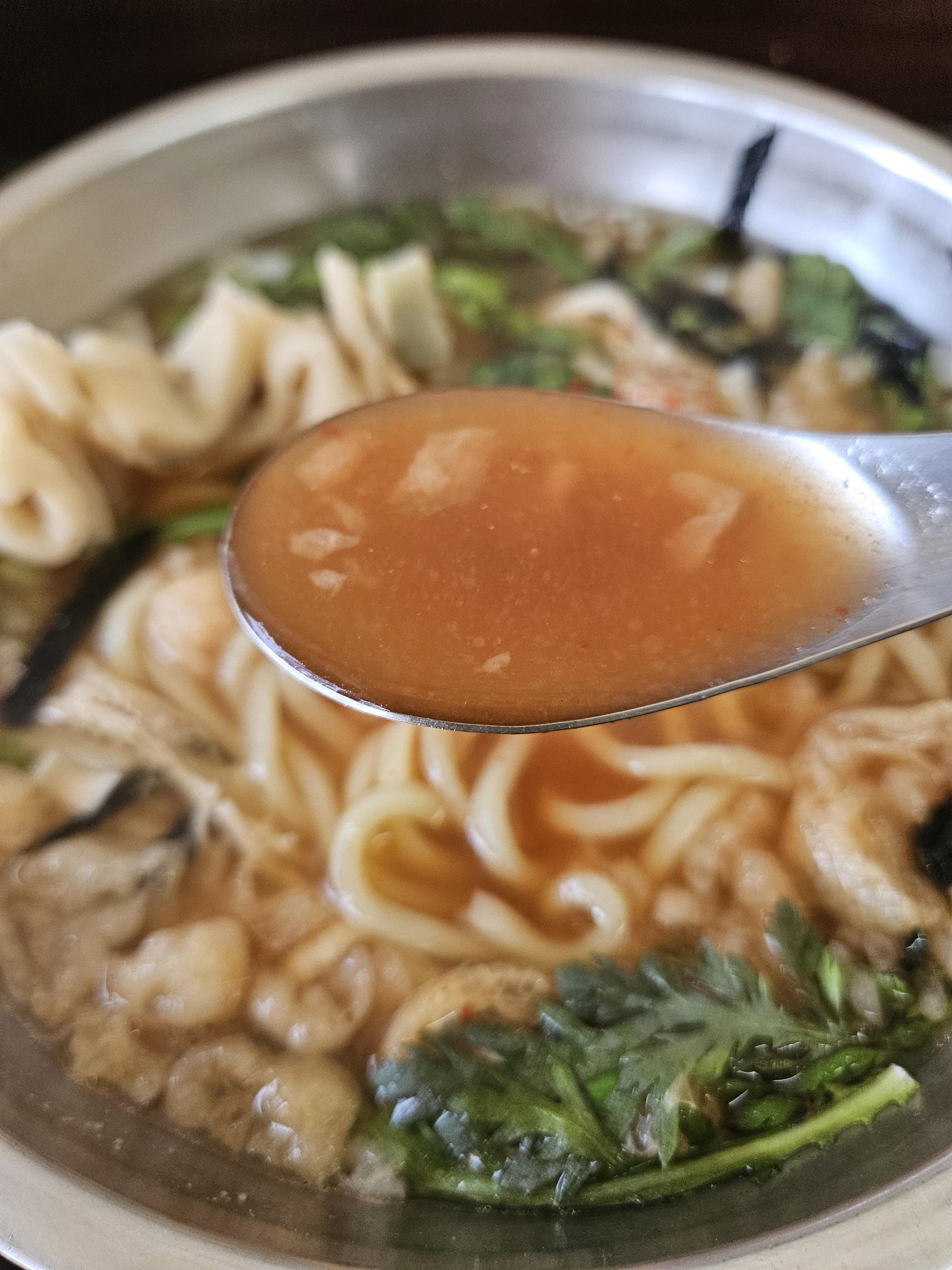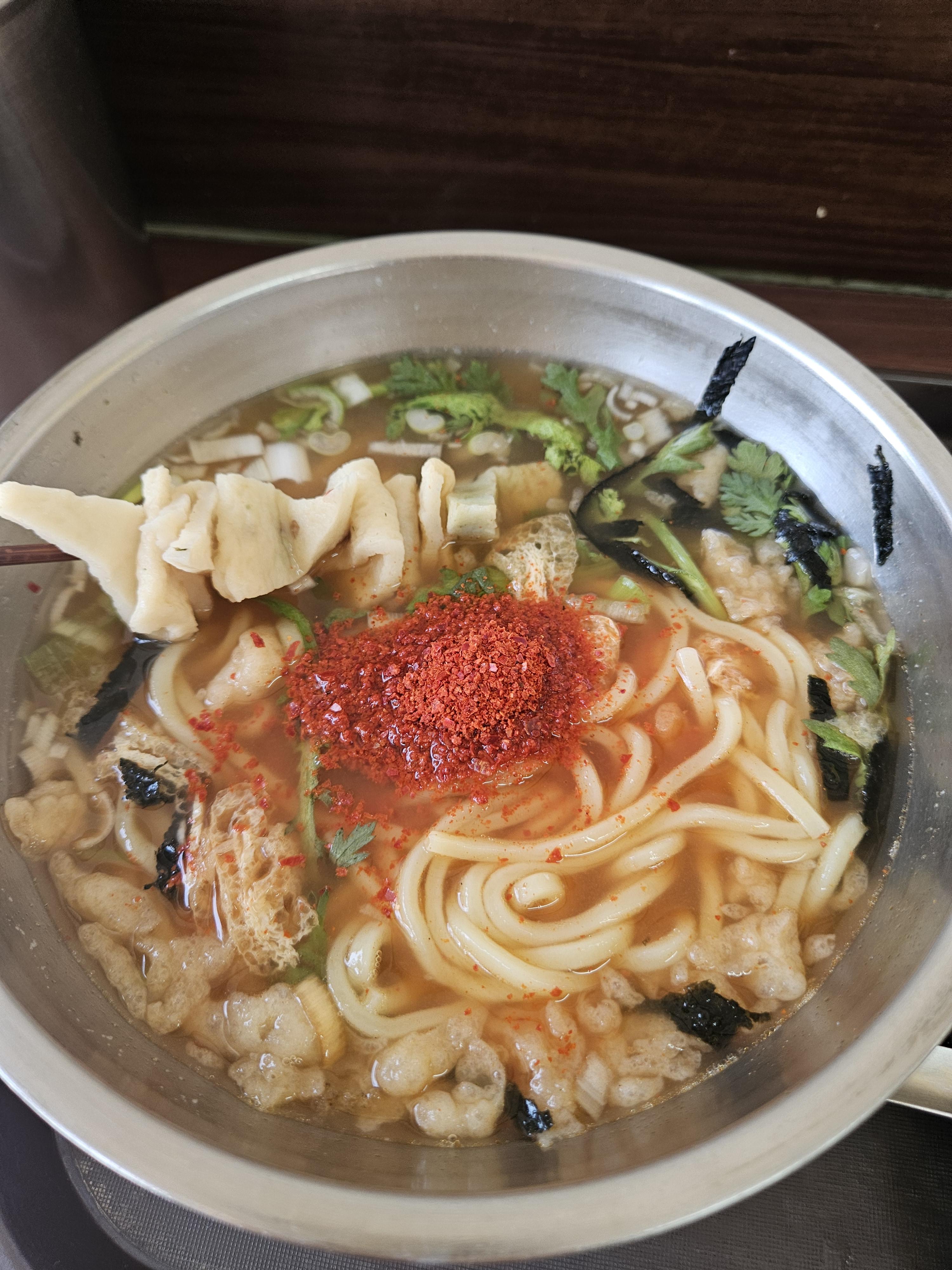 어릴 때 한강에서 사 먹던 우동맛이 떠오르는 추억의 맛. 육수를 직접 내서 사용하시는 것 같고 다대기 양념장이 좀 들어있어 풀면 국물이 매콤한 색으로 변한다.