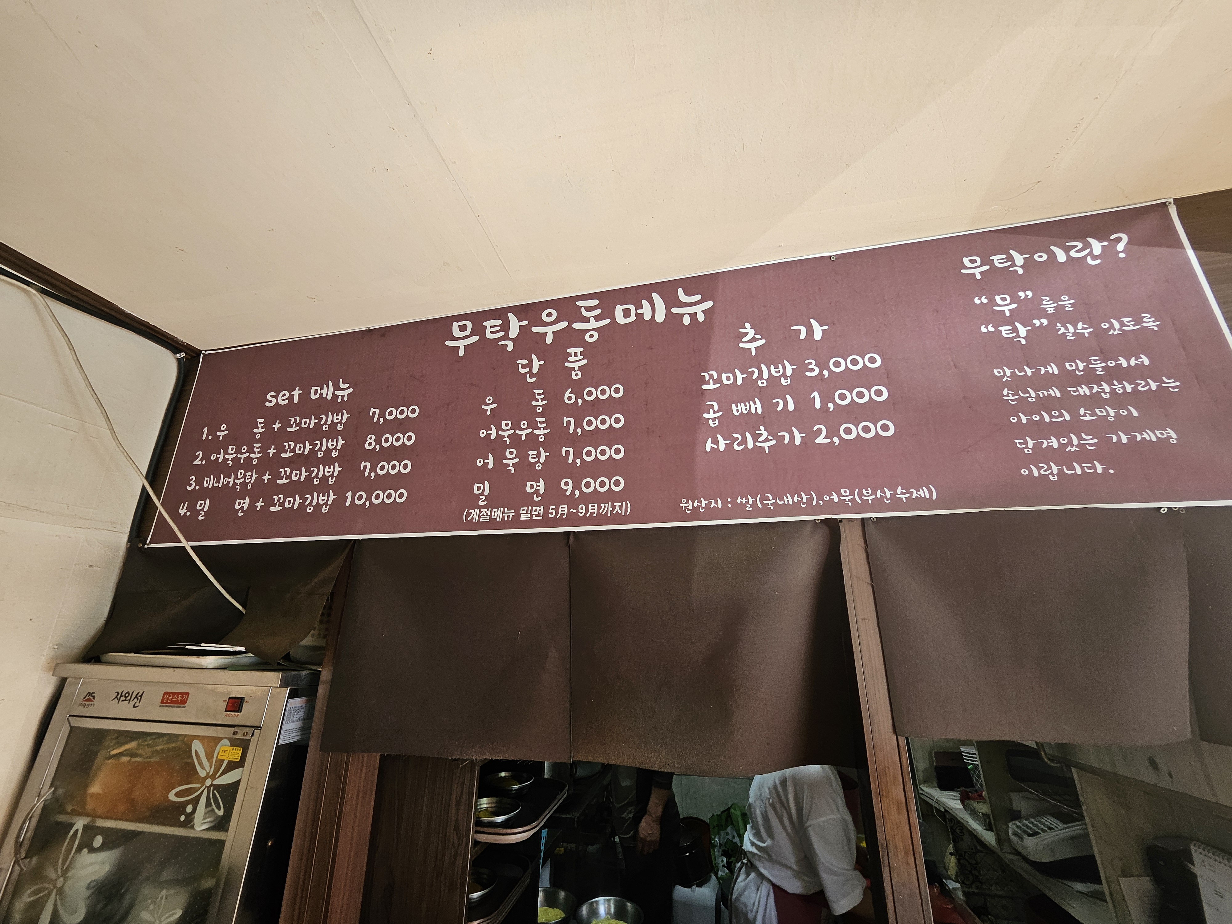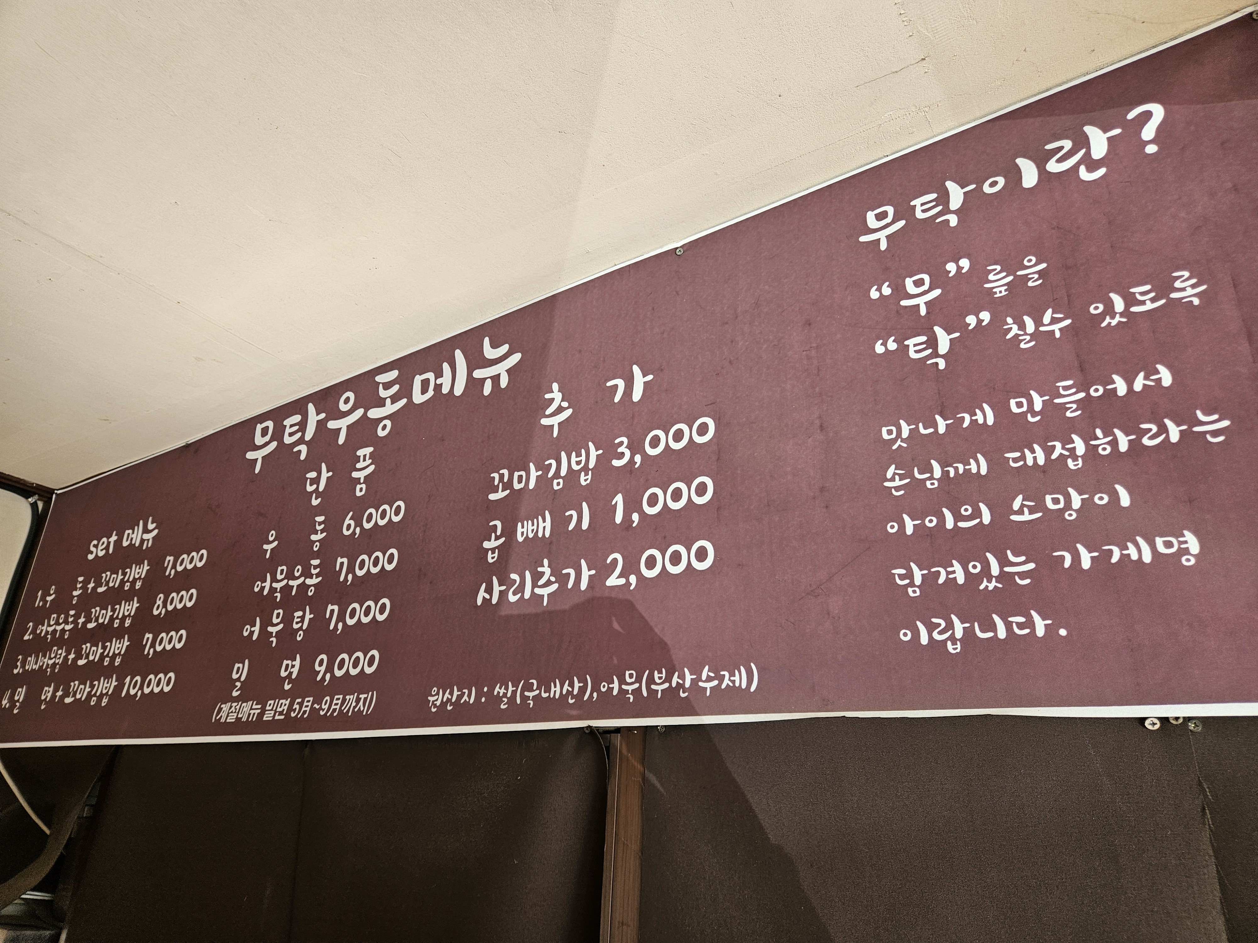 메뉴는 우동과 어묵탕, 밀면 + 꼬마김밥 세트와 단품 메뉴, 추가(꼬마김밥, 곱빼기, 사리) 메뉴가 있었다. 어묵은 부산 수제 어묵이라고 하며 쌀은 국내산을 사용한다고 한다.