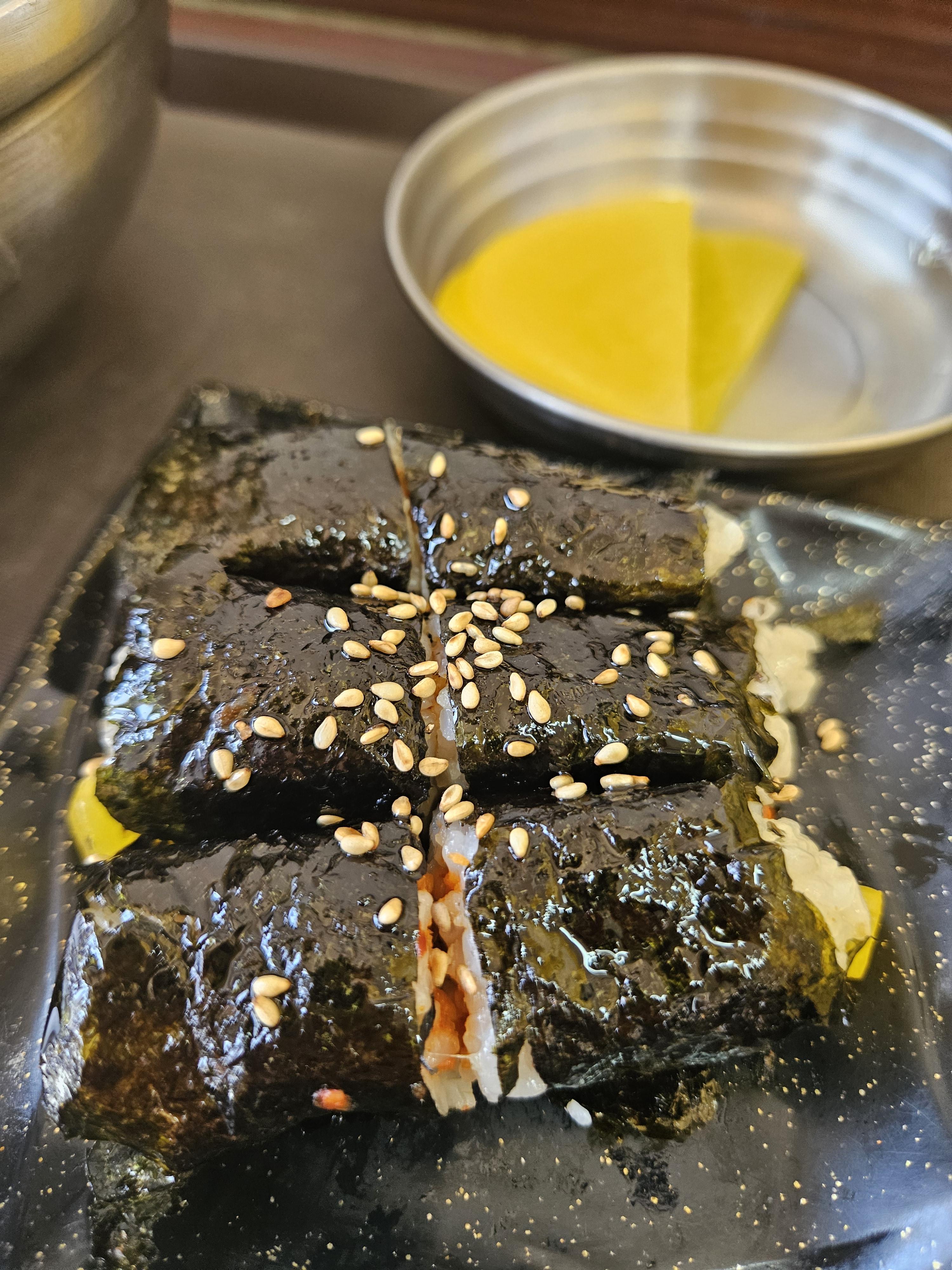 꼬마김밥은 단무지와 홍어무침인건가? 삭힌 가오리인가 ㅎㅎ 충무김밥 스타일로 요즘 파는 꼬마김밥집의 꼬마김밥 사이즈보다 더 앙증맞은 크기 같았는데 쌀도 찰지도 김밥재료도 별게 없는데 중독성 있는 꼬마김밥 어묵우동과 함께 먹으니 찰떡궁합.