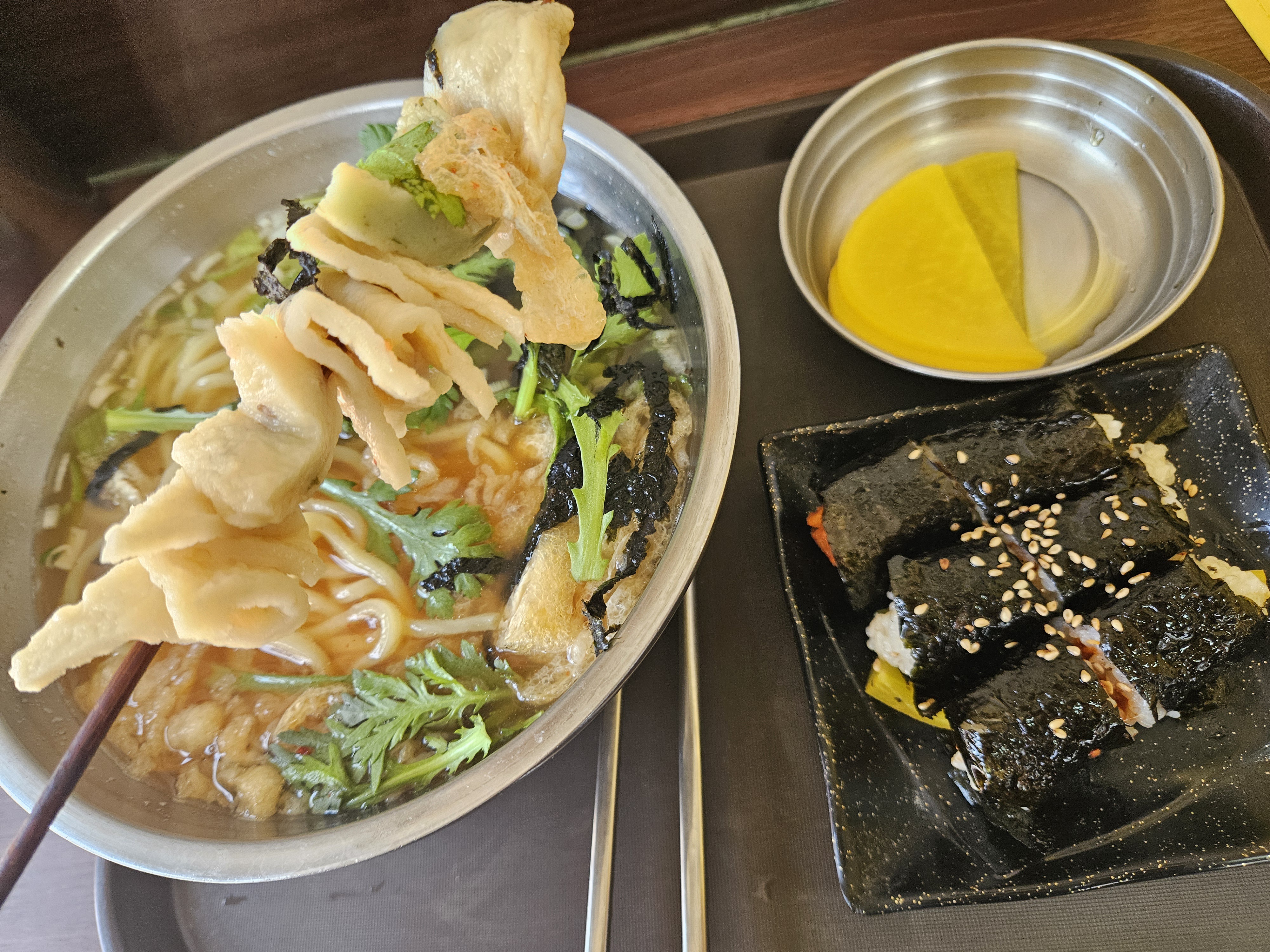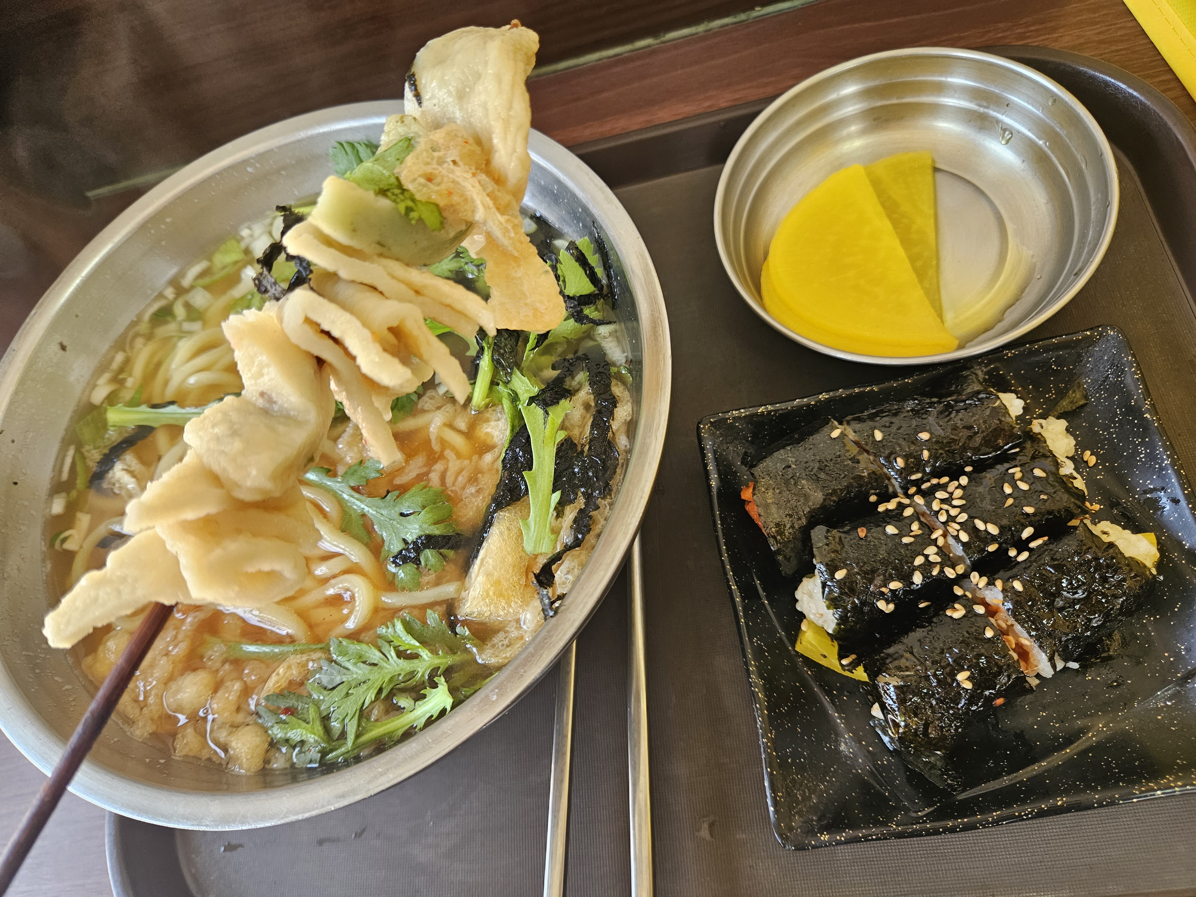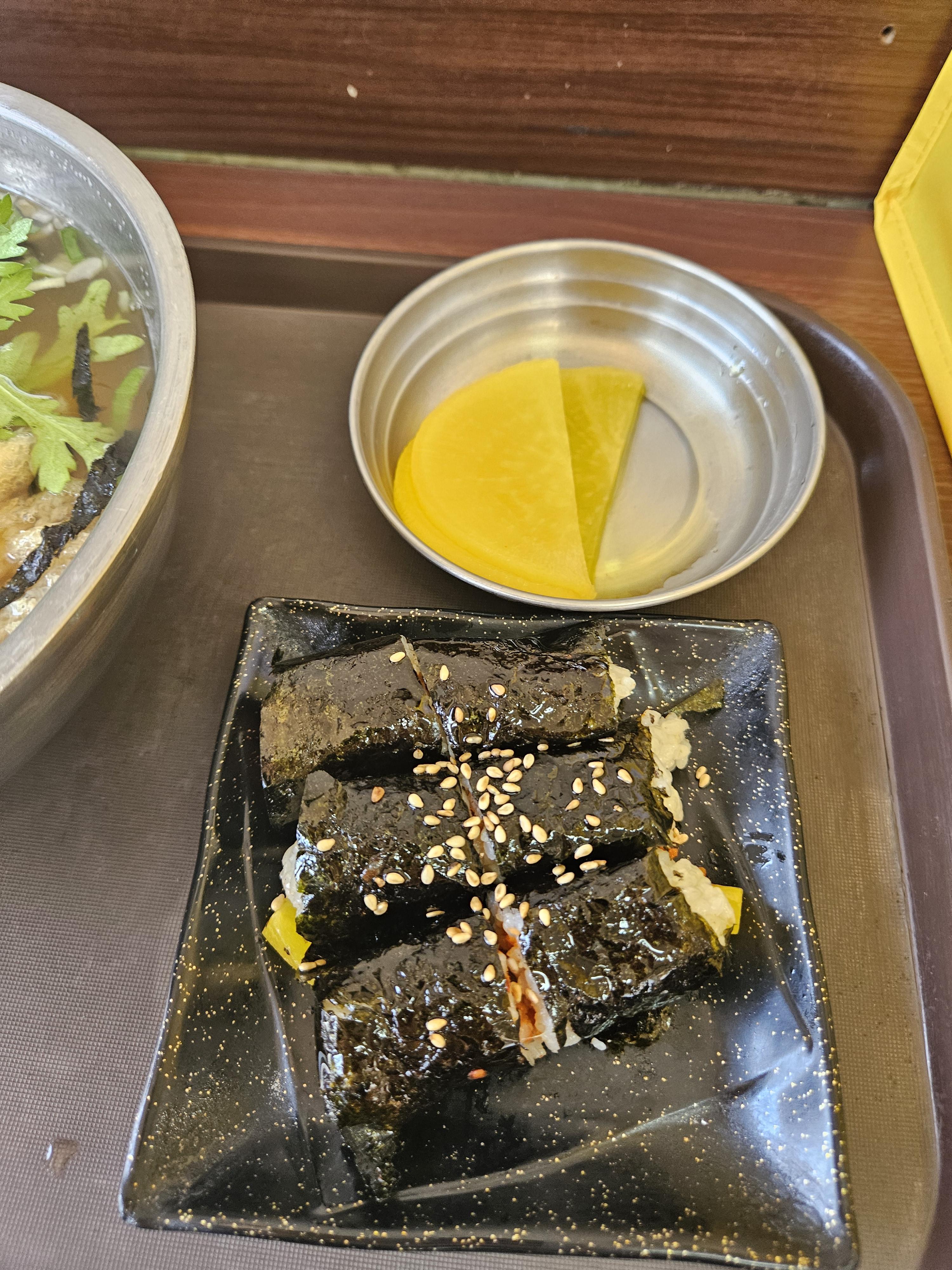 어묵우동 + 꼬마김밥(8,0) 주문하고 금세 식사할 수 있게 음식 가져다주셨다. 반찬은 단무지 하나가 전부.