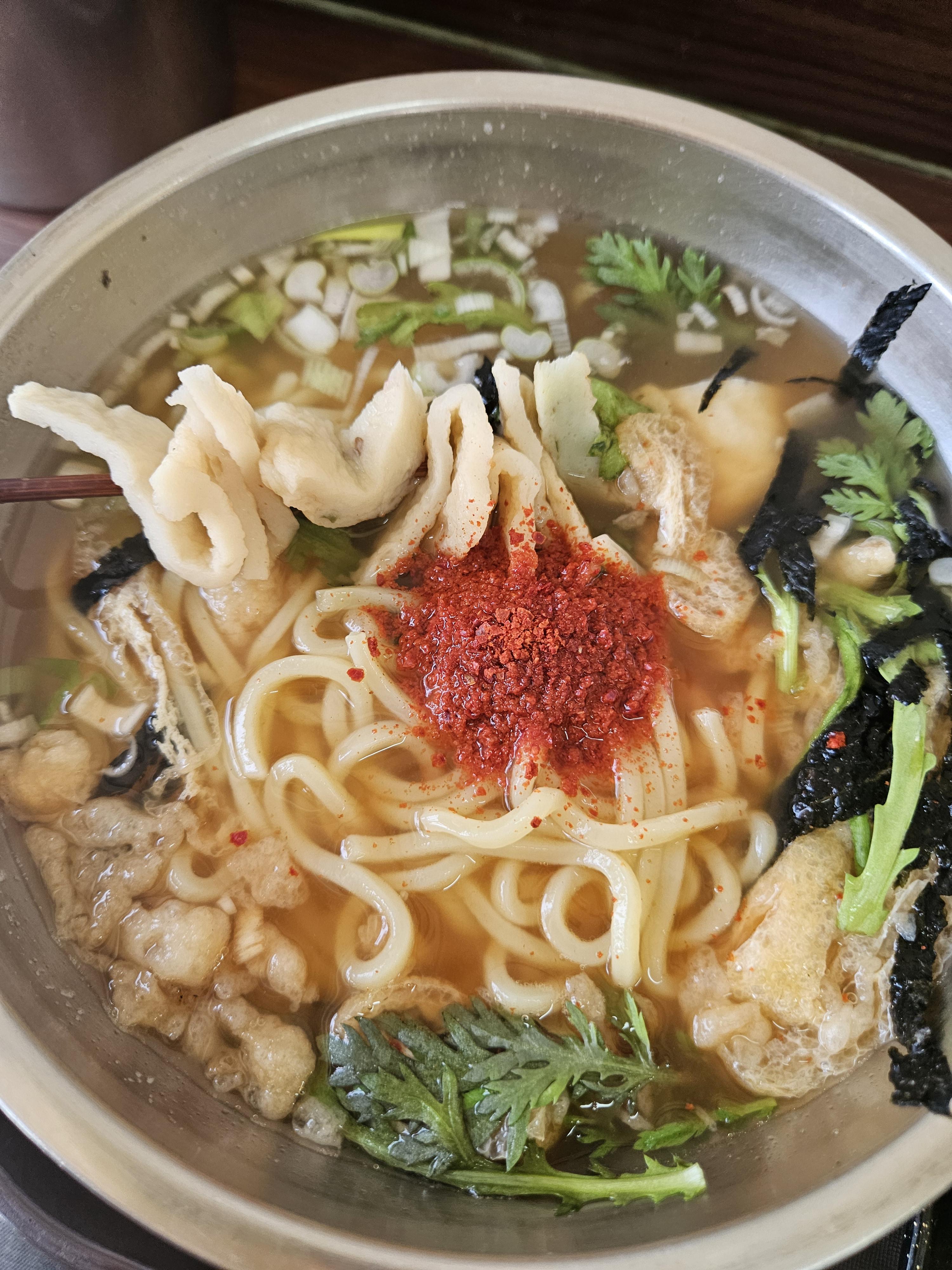 어묵우동은 꼬치에 꿴 🍢 어묵 한 꼬치가 들어가 있고 수북이 얹은 쑥갓과 김가루 유부와 튀김가루를 넣어 고소하게 먹을 수 있겠더라.