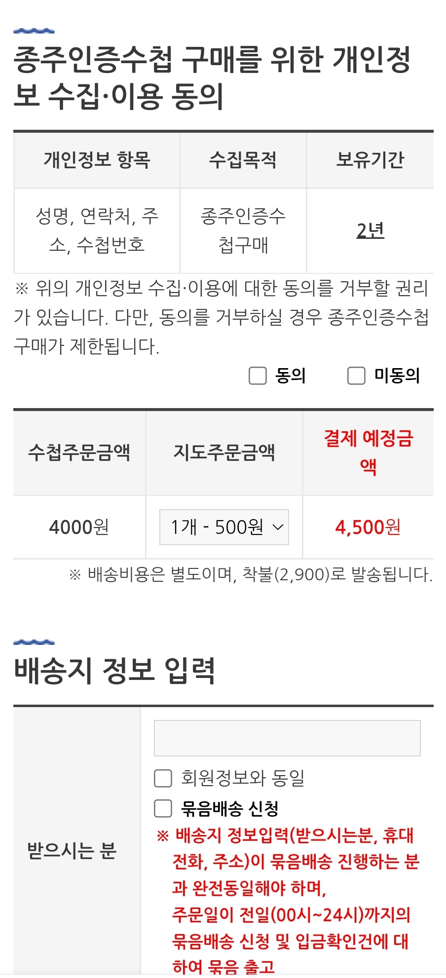 회원 가입 후 인당 1개만 주문 가입한데 카드 구입 불가, 무통장 입금만 가능하고 배송요금은 착불 2,900원이다.
