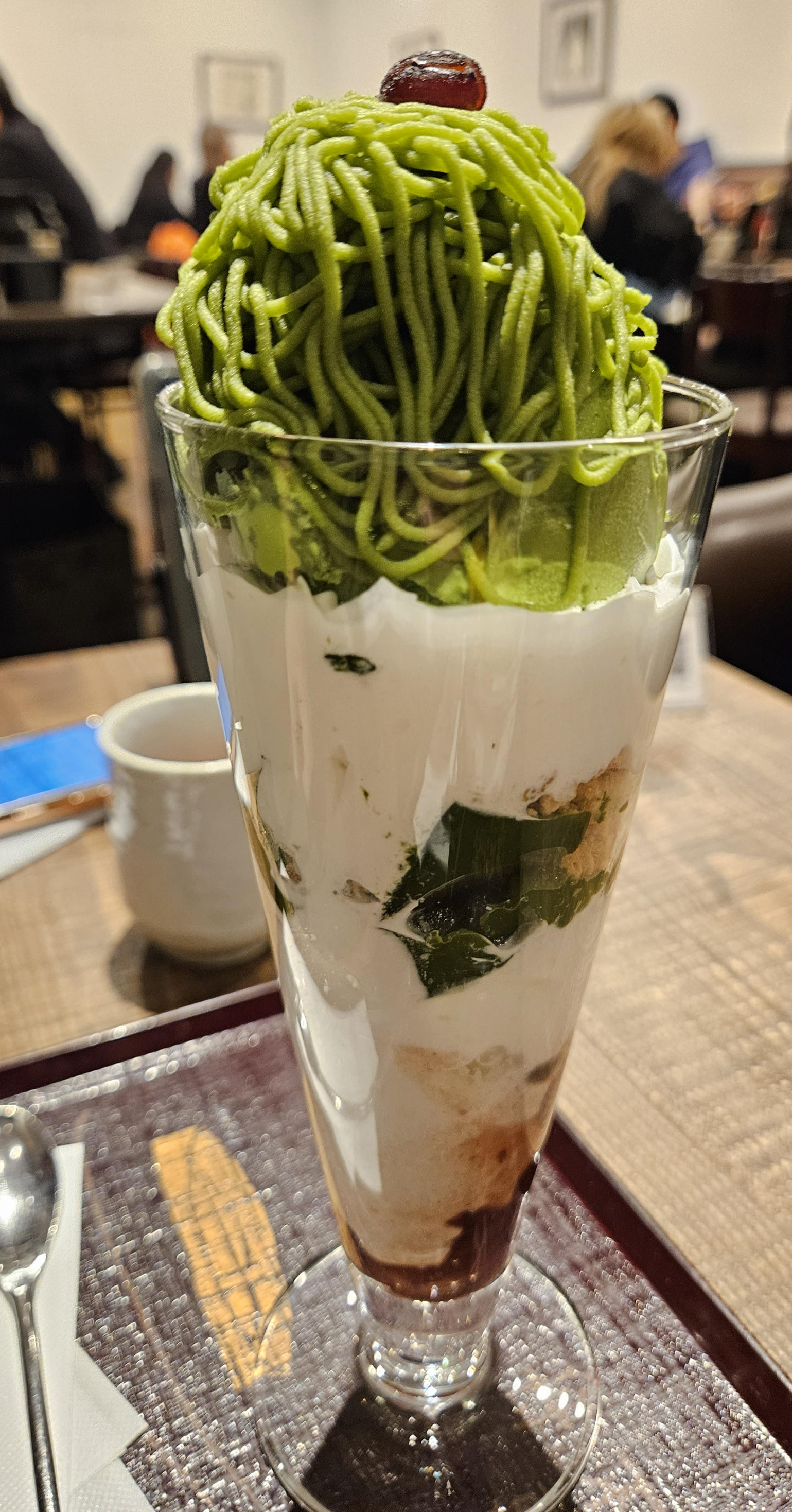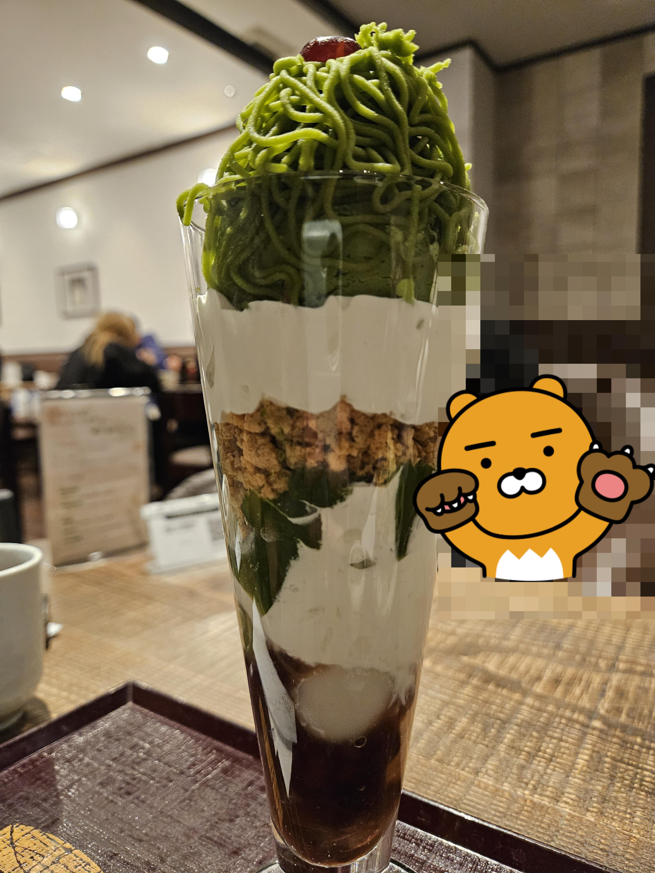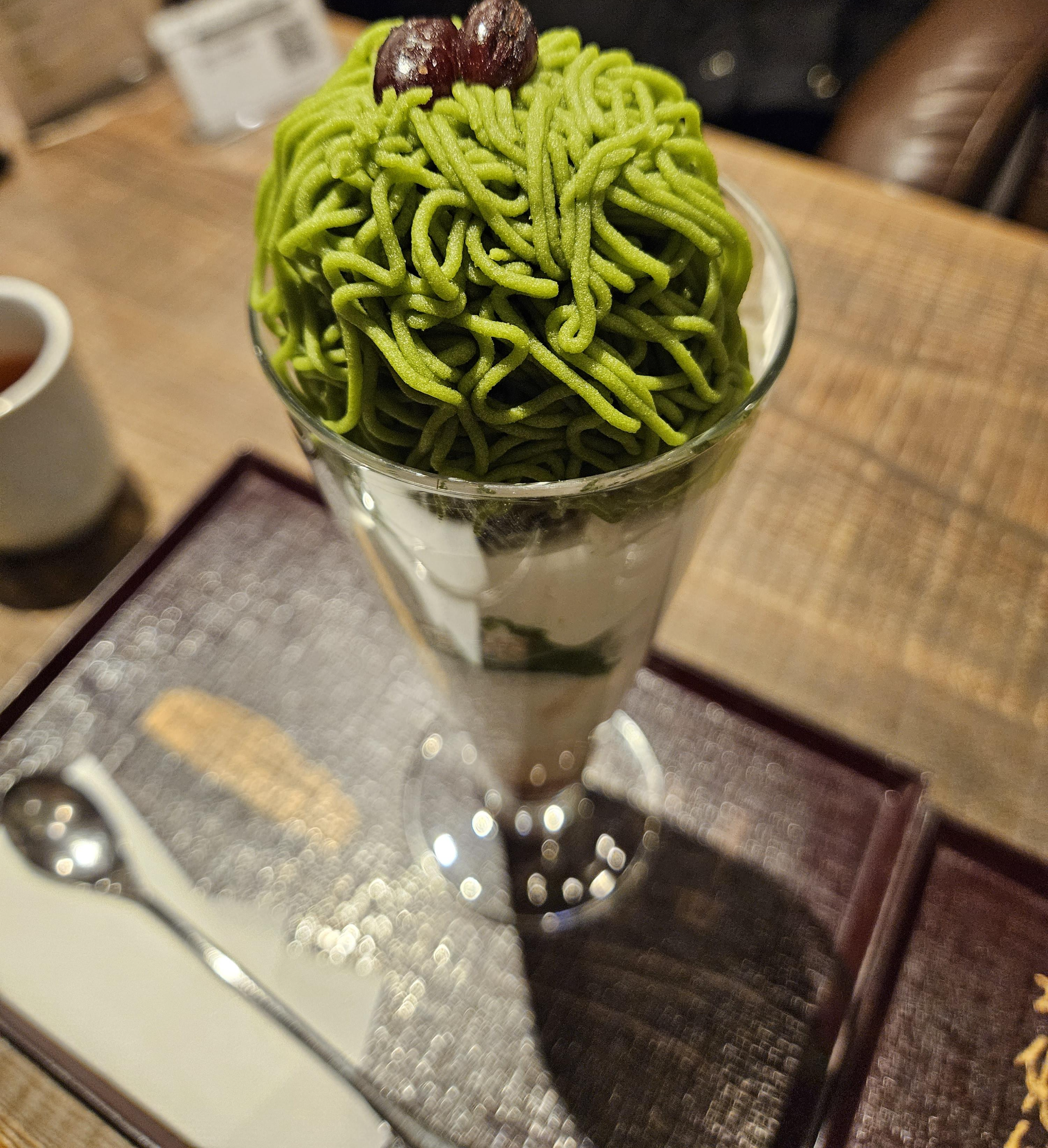 파르페는 강낭콩 앙금에 말차를 섞어 국수처럼 가늘게 올려놨는데 그 아래 말차 아이스크림과 생크림, 그래놀라, 말차 젤리, 생크림, 단팥 등의 재료로 층을 쌓아 완성한 디저트.