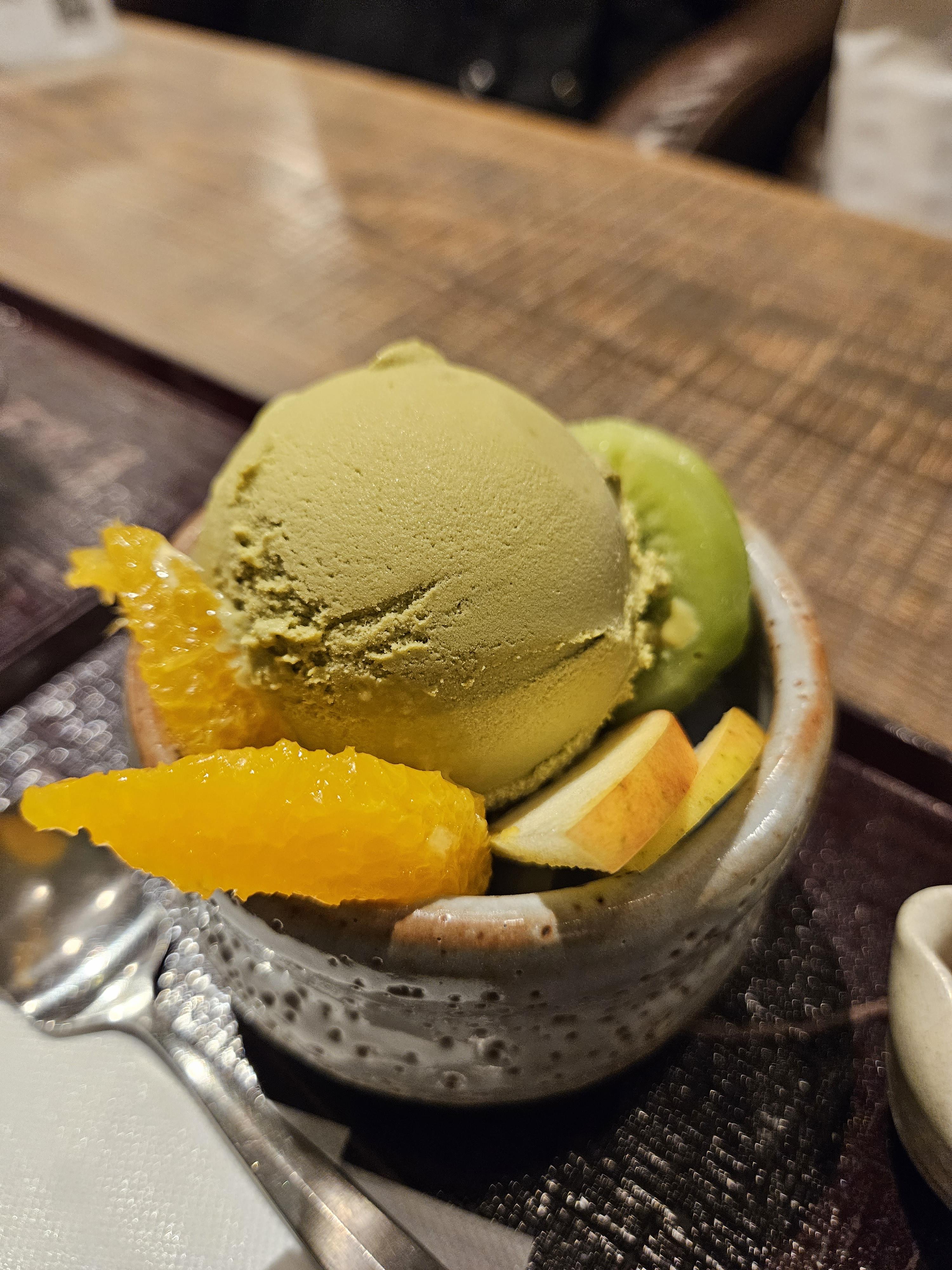 안미츠 아이스크림이 호지차 베이스라 말차 아이스크림보다 구수하고 키위, 사과, 오렌지랑 팥, 찹쌀 경단, 시럽이 함께 제공되는 디저트.