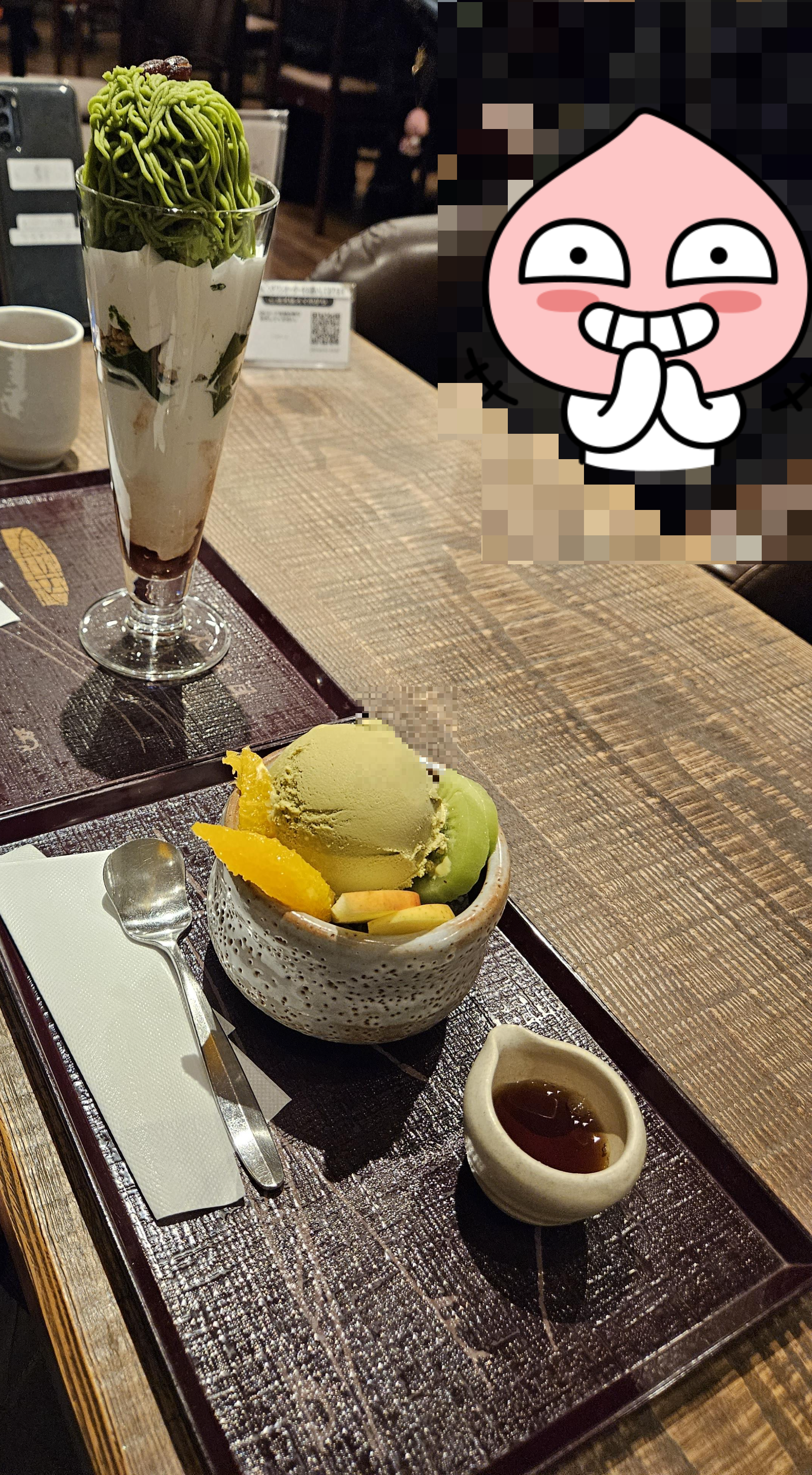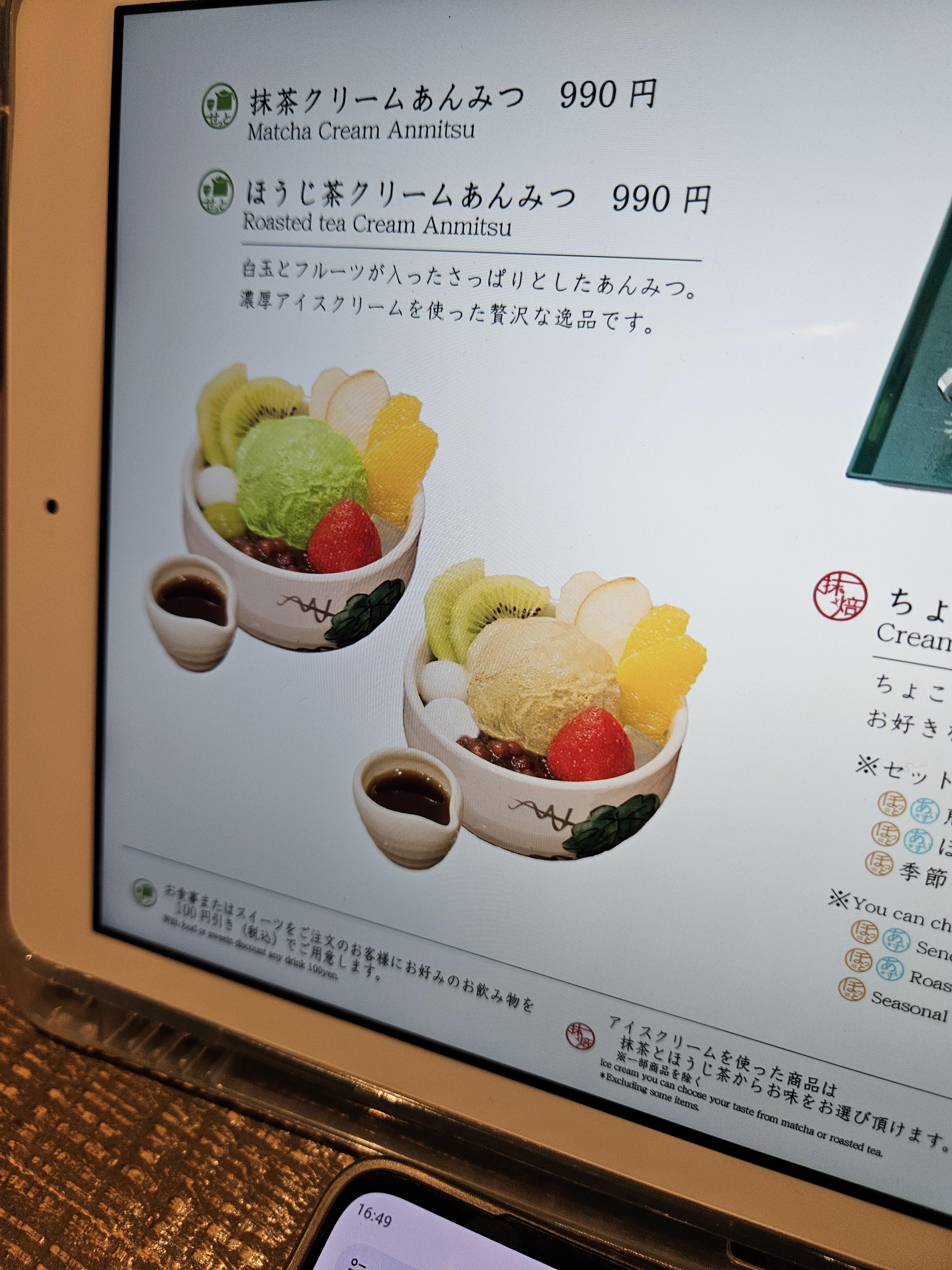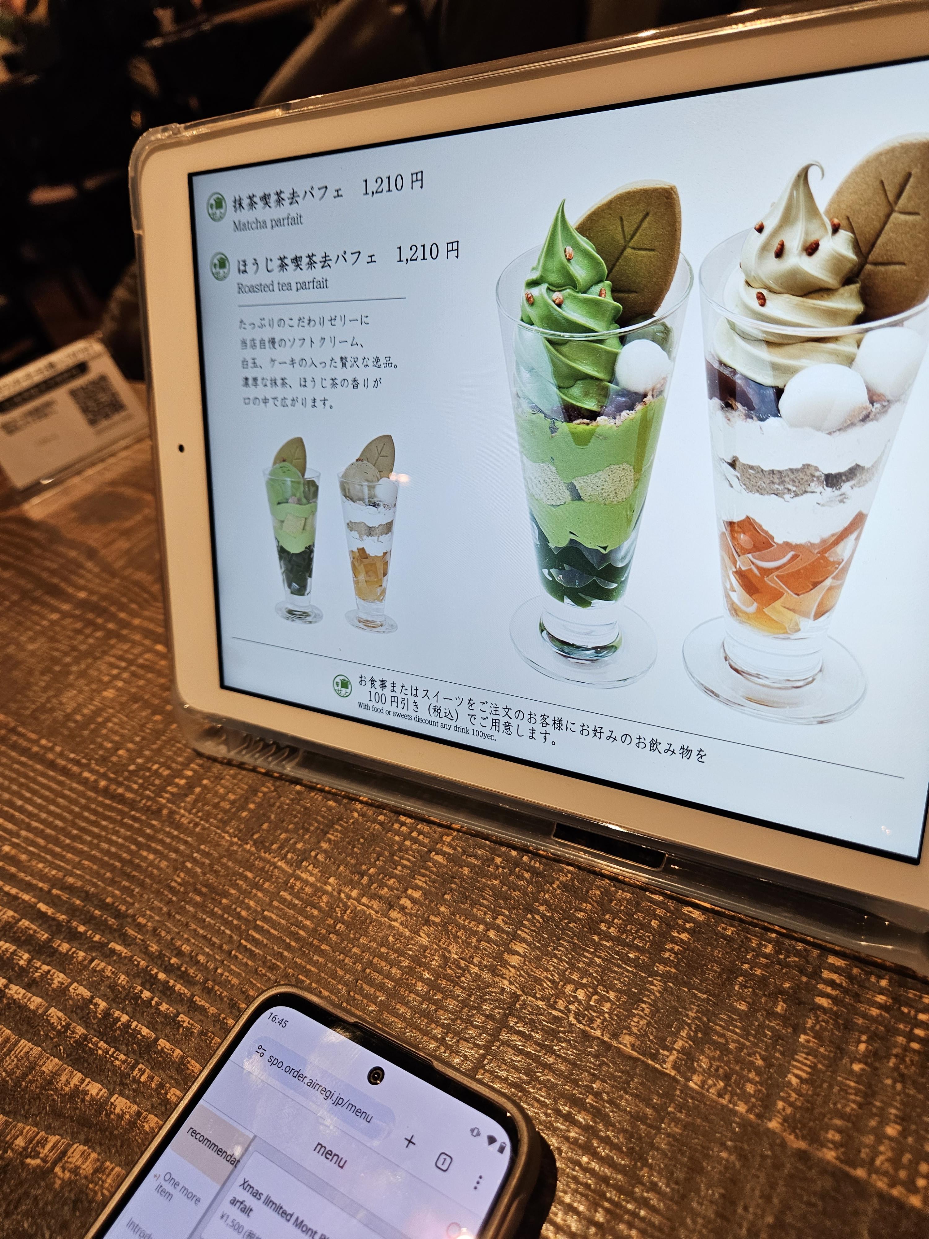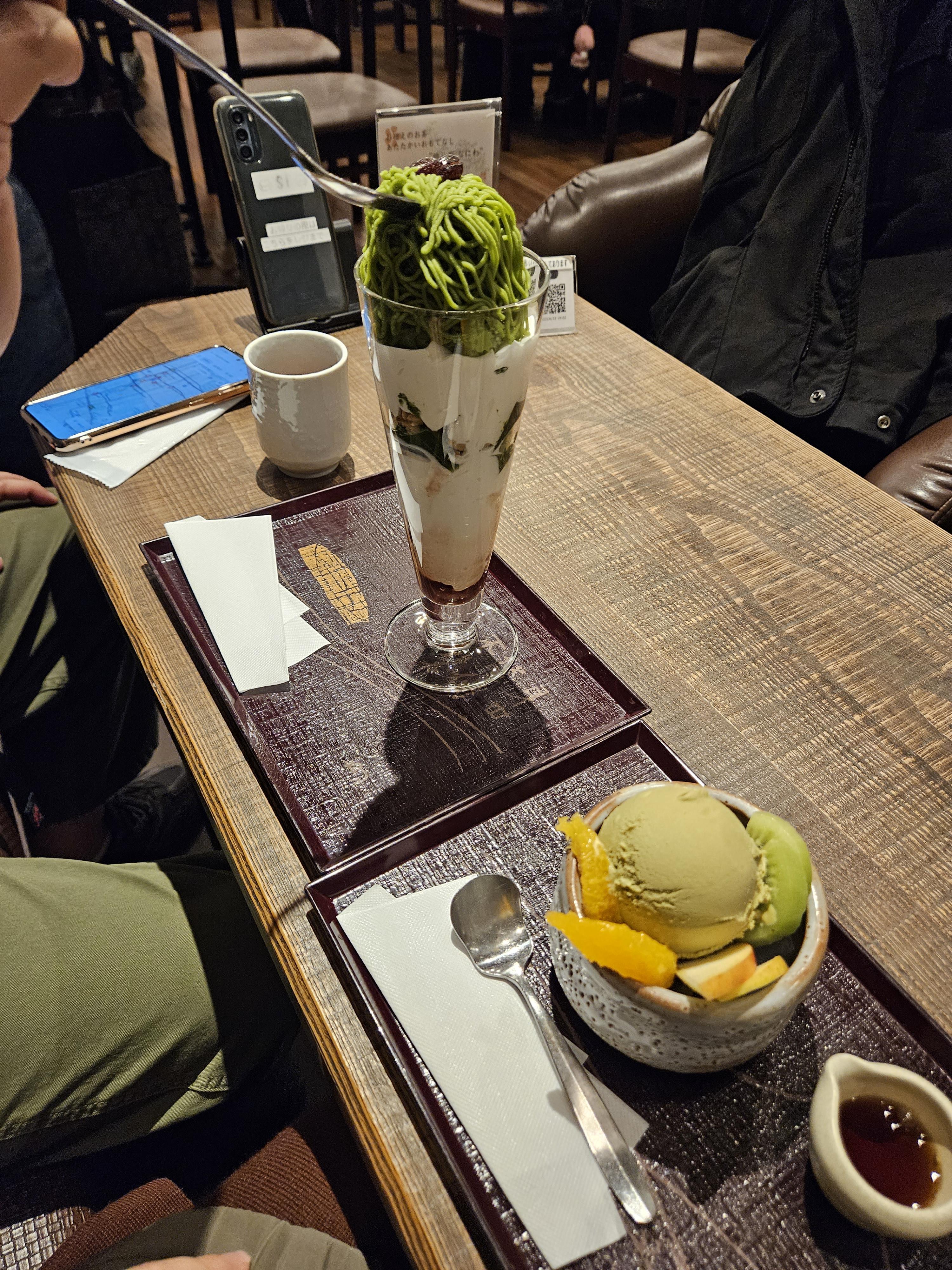 고민끝에 말차 몽블랑 파르페(1,430엔)와 크림 호지차 안미츠(990엔) 하나 2,420엔 주문했음.