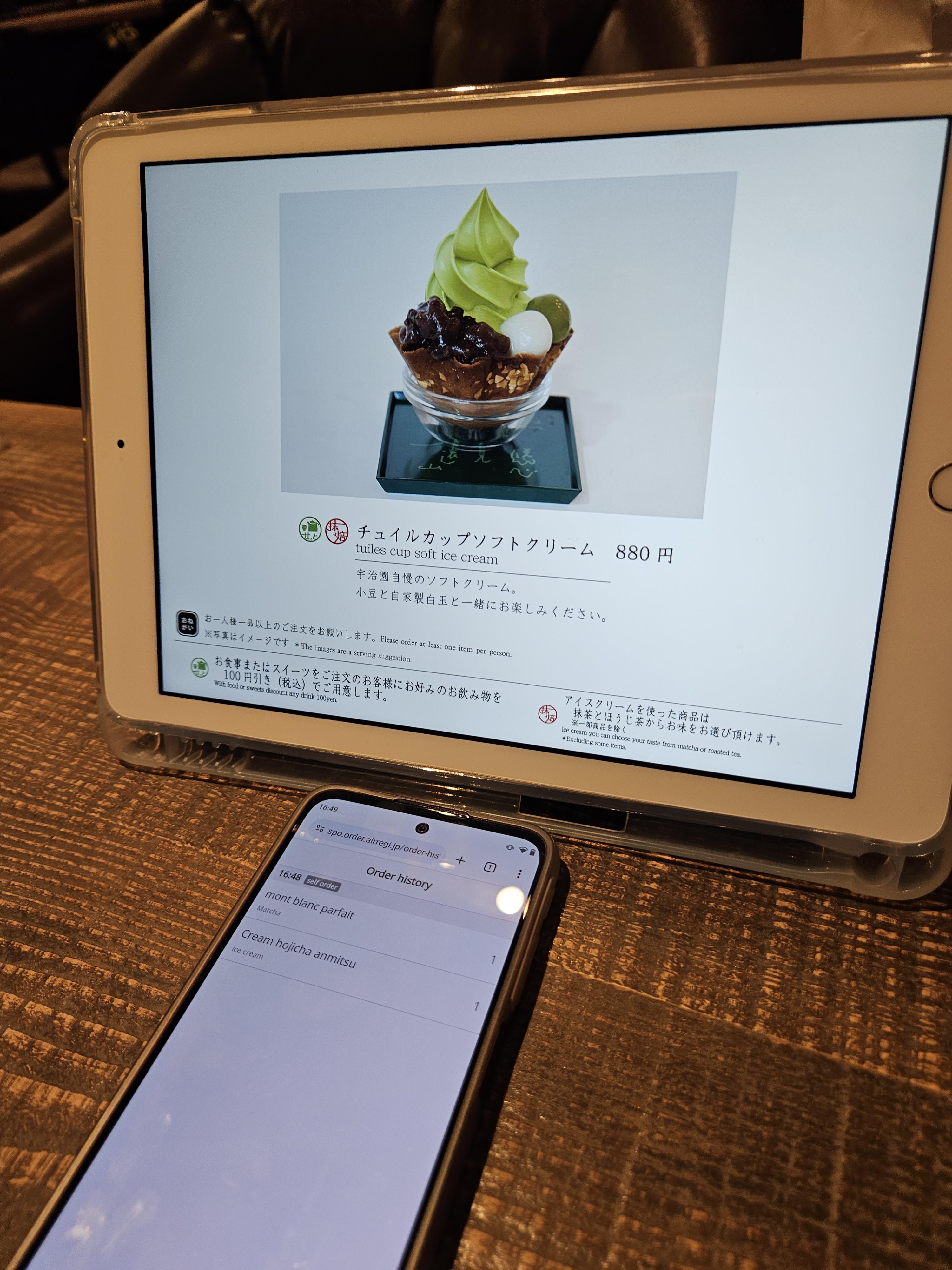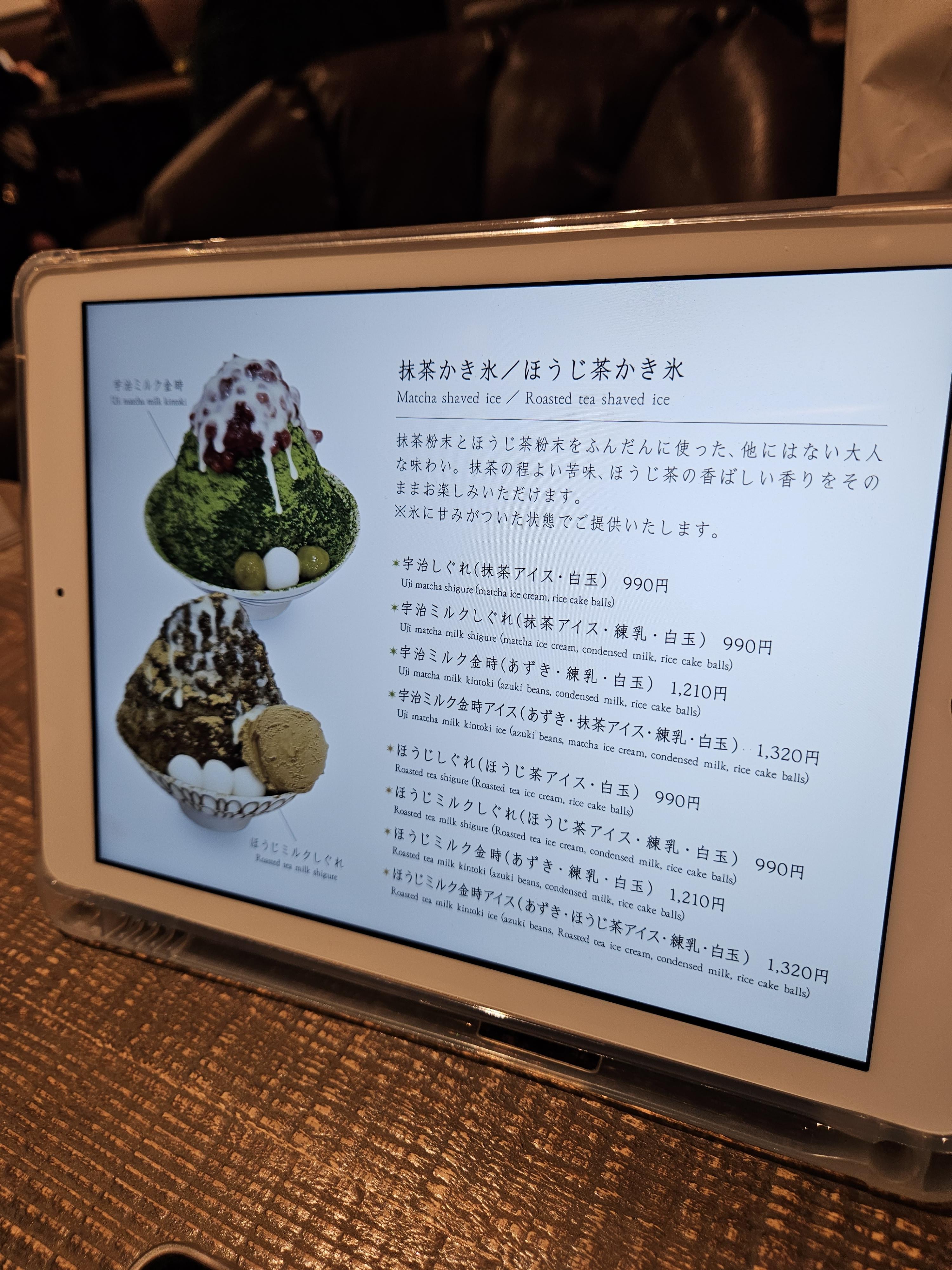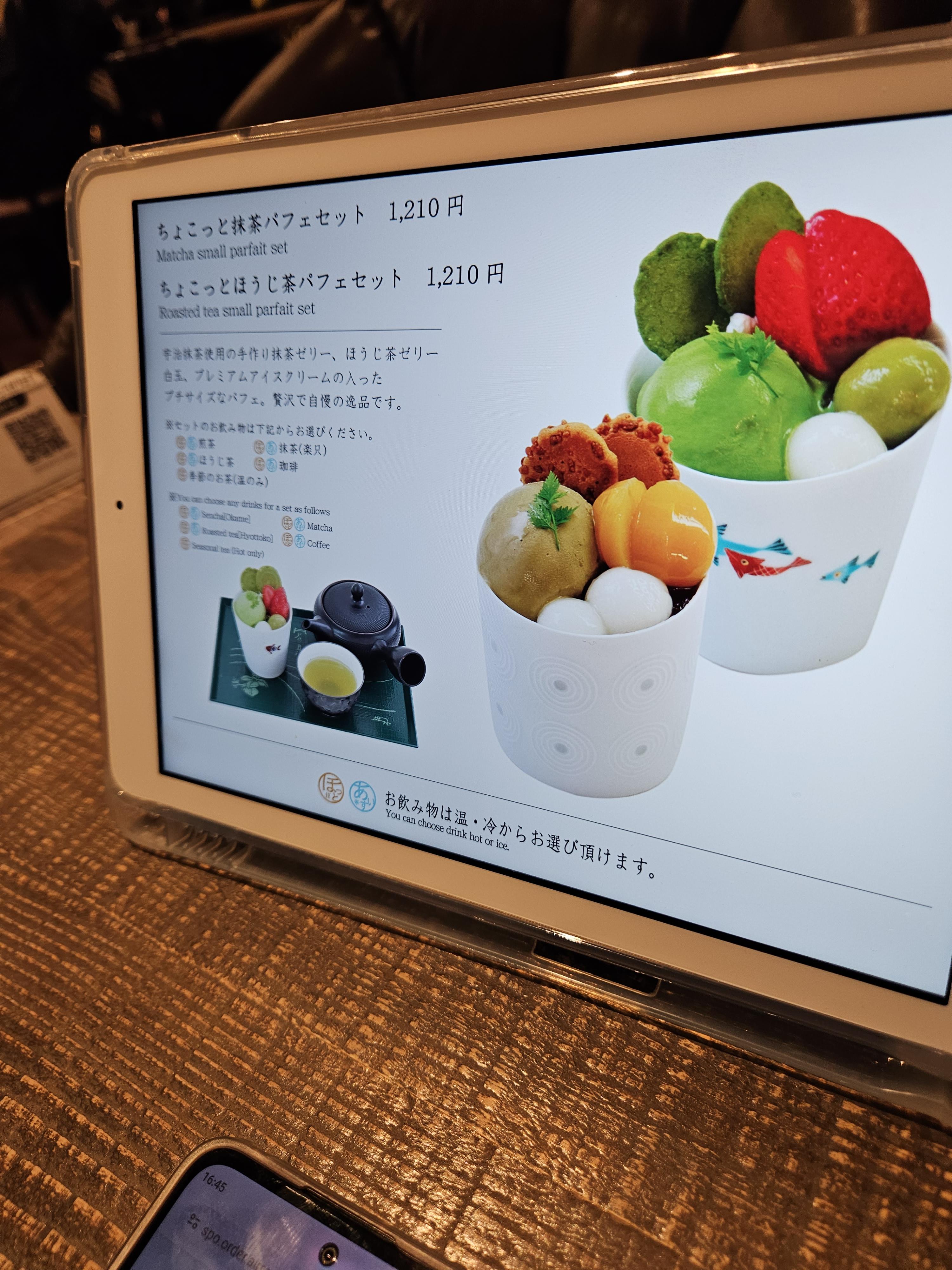 고민끝에 말차 몽블랑 파르페(1,430엔)와 크림 호지차 안미츠(990엔) 하나 2,420엔 주문했음.