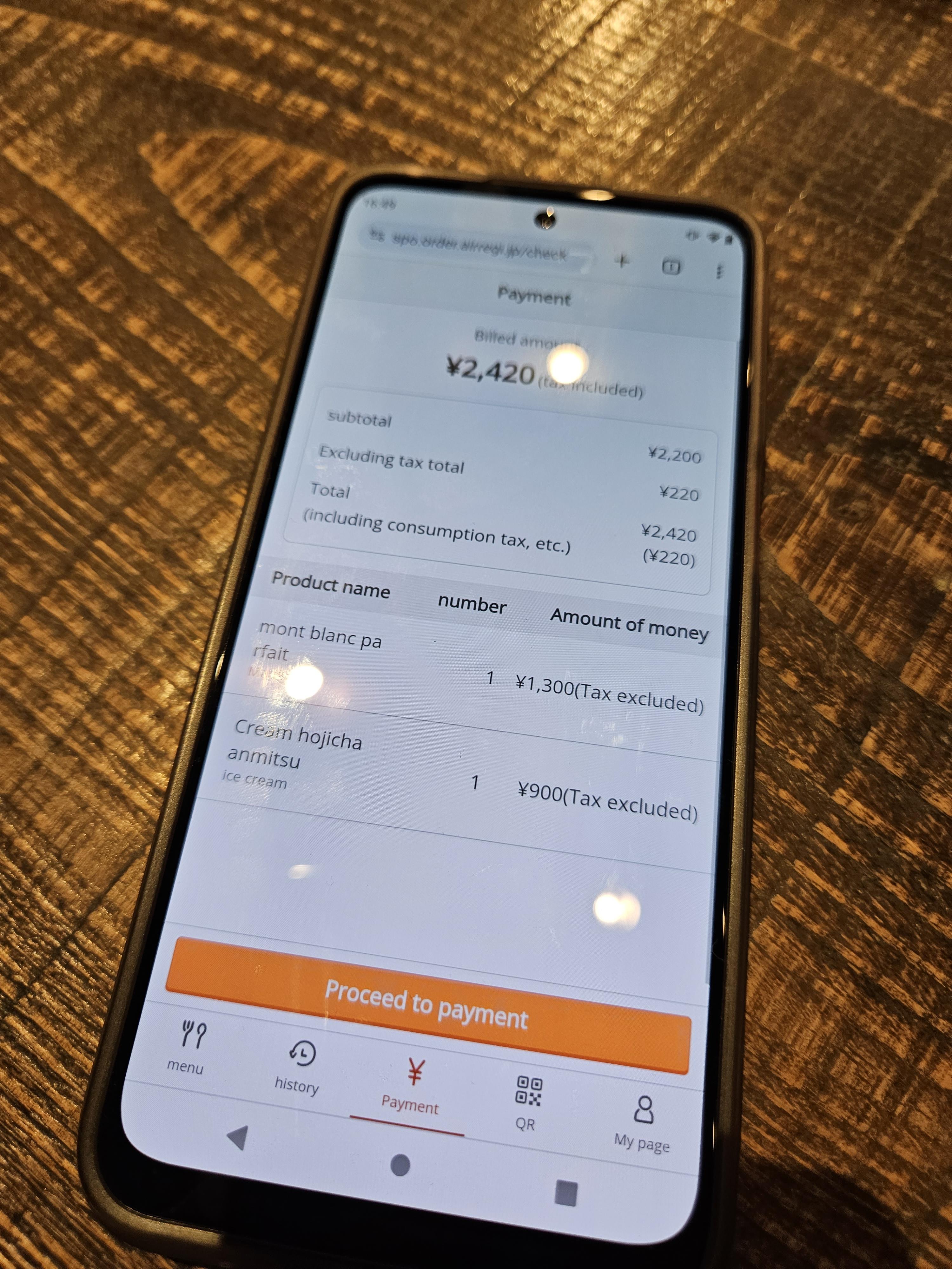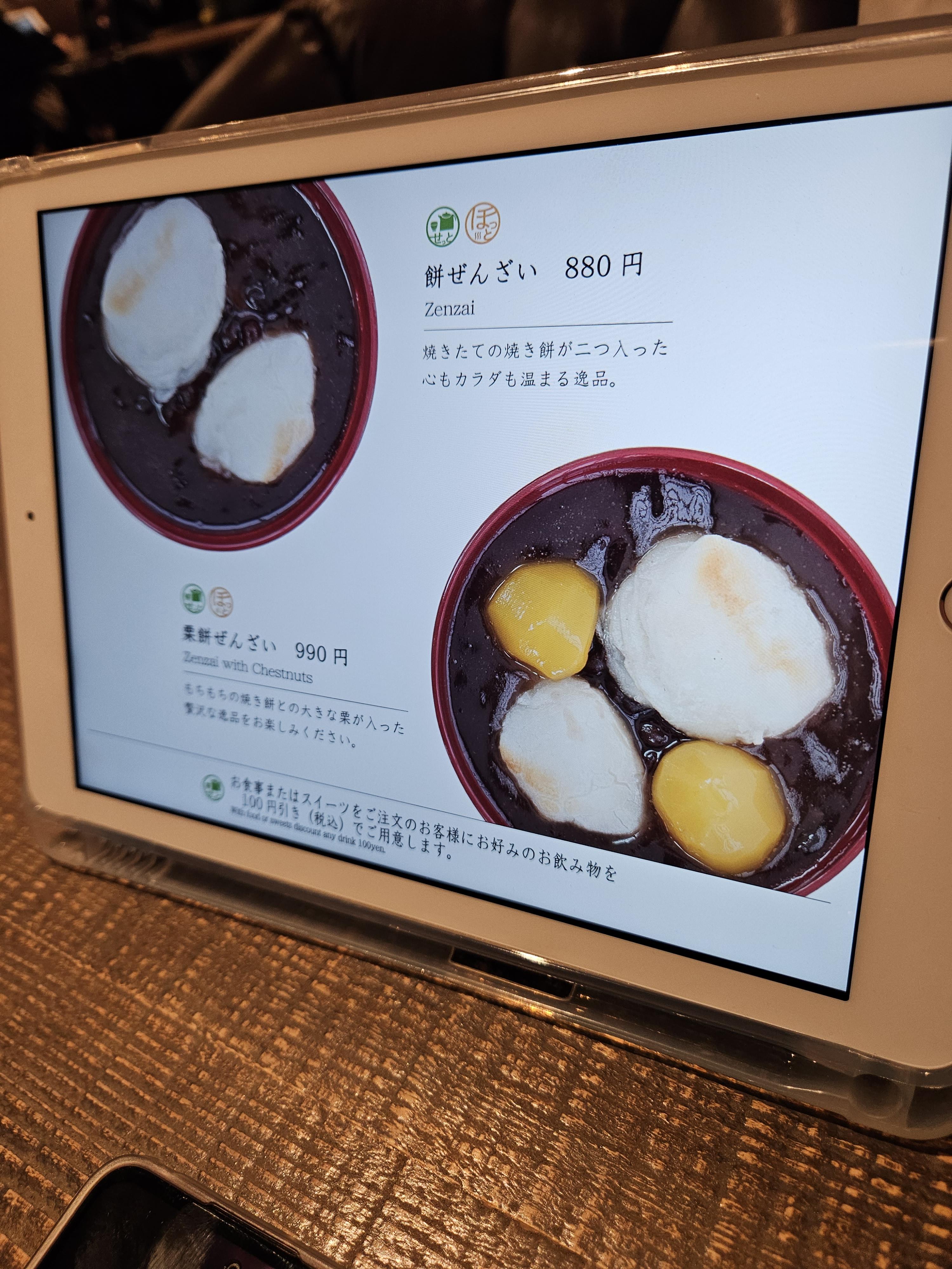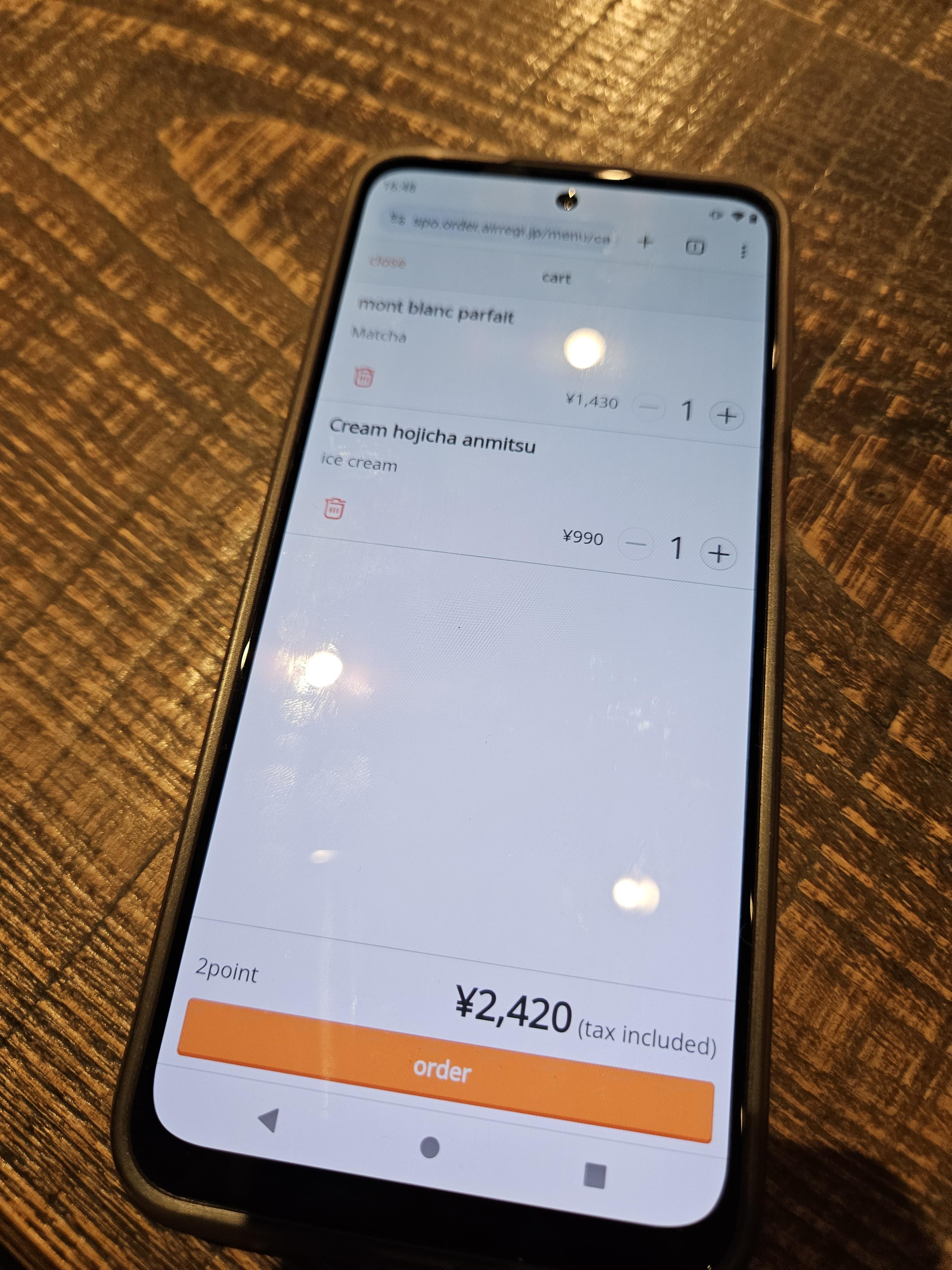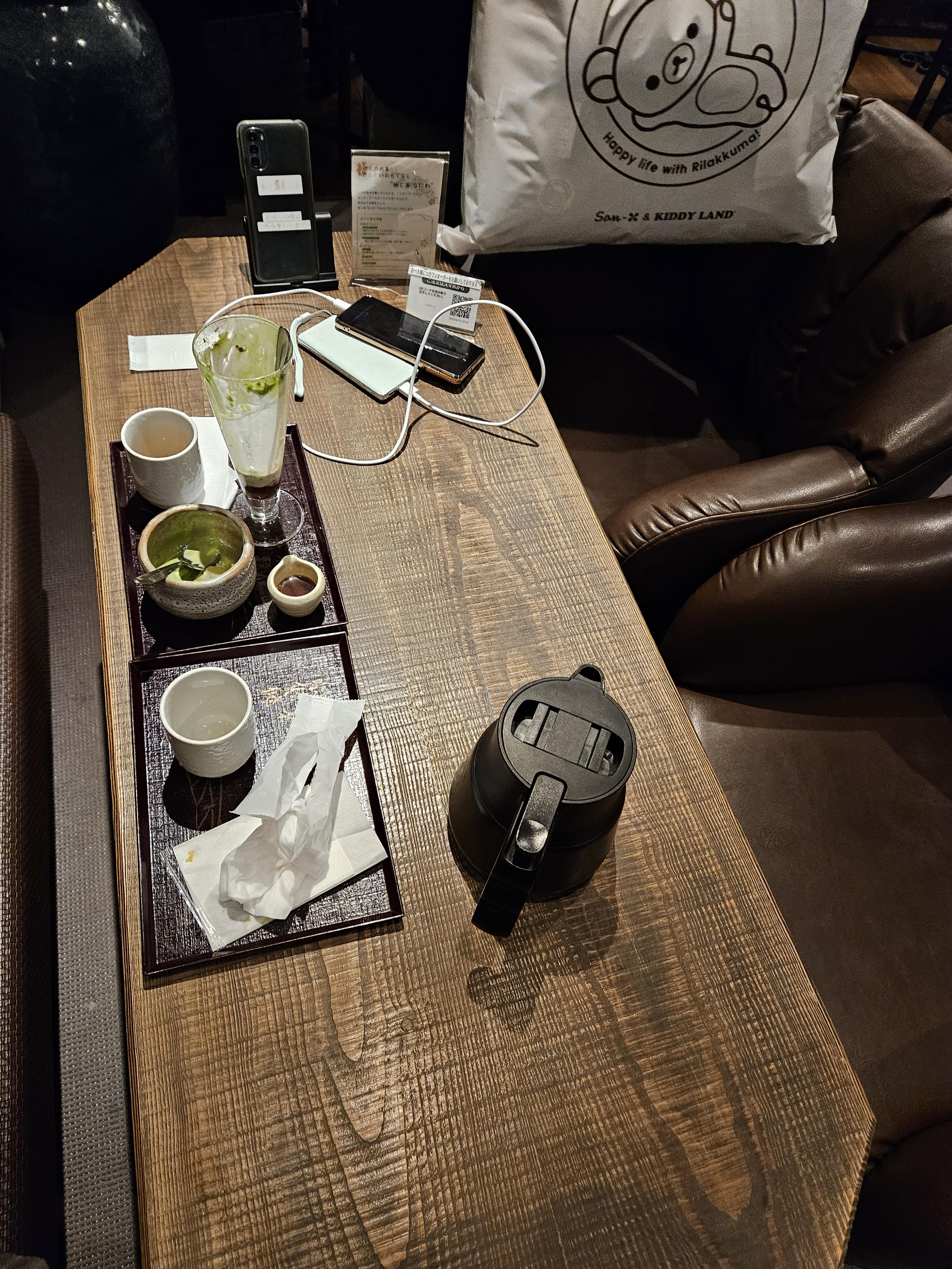 고민끝에 말차 몽블랑 파르페(1,430엔)와 크림 호지차 안미츠(990엔) 하나 2,420엔 주문했음.
