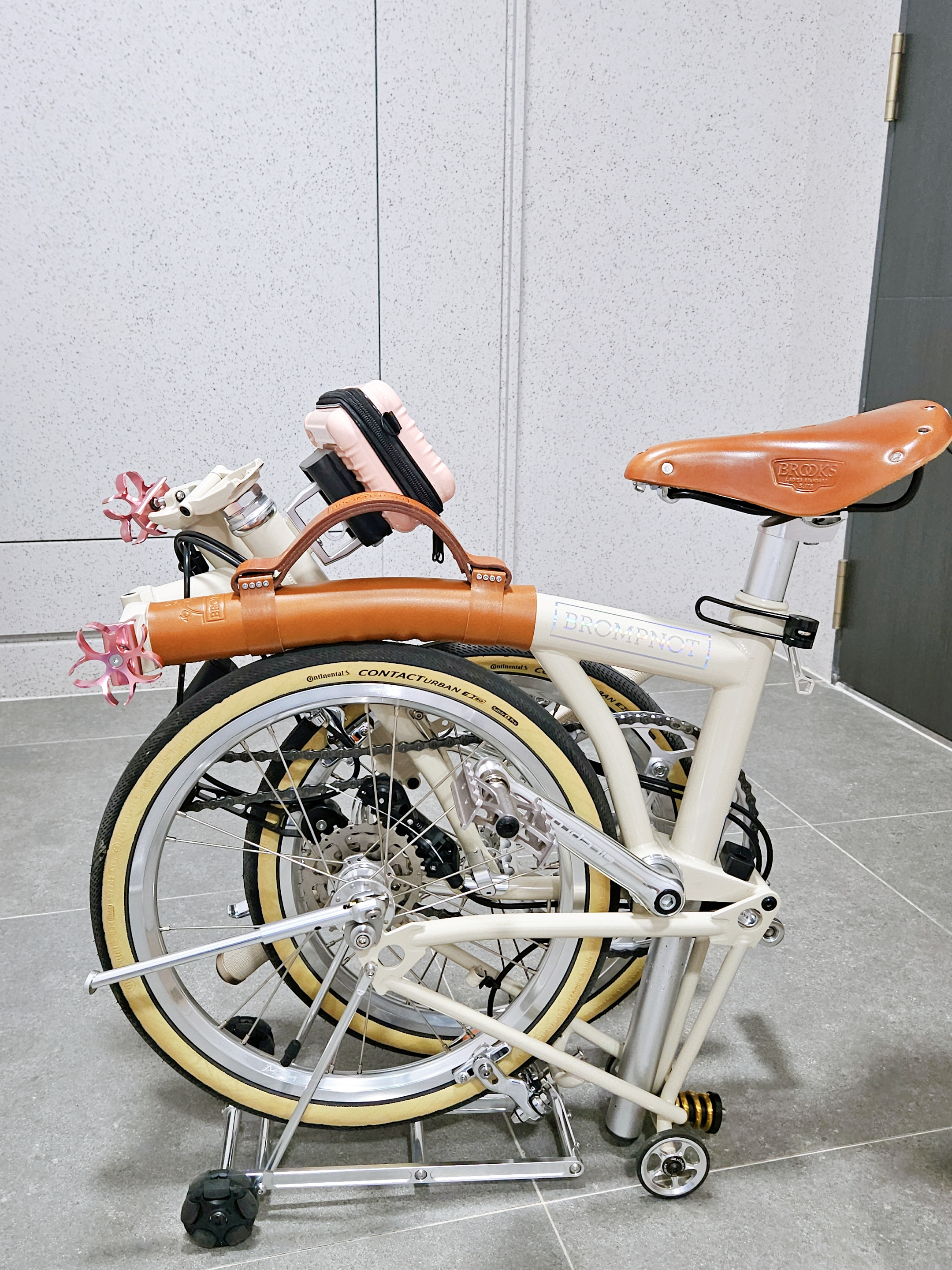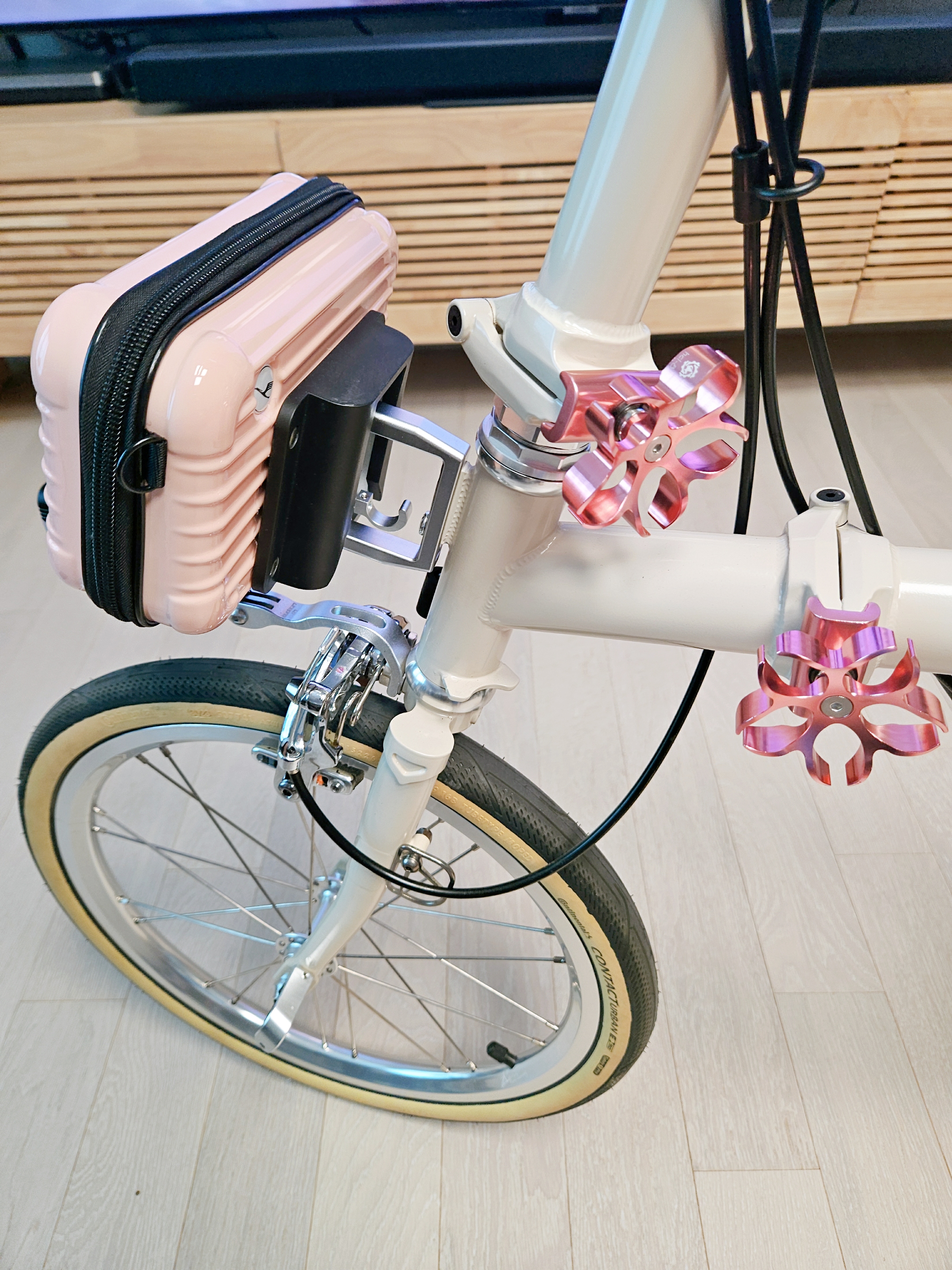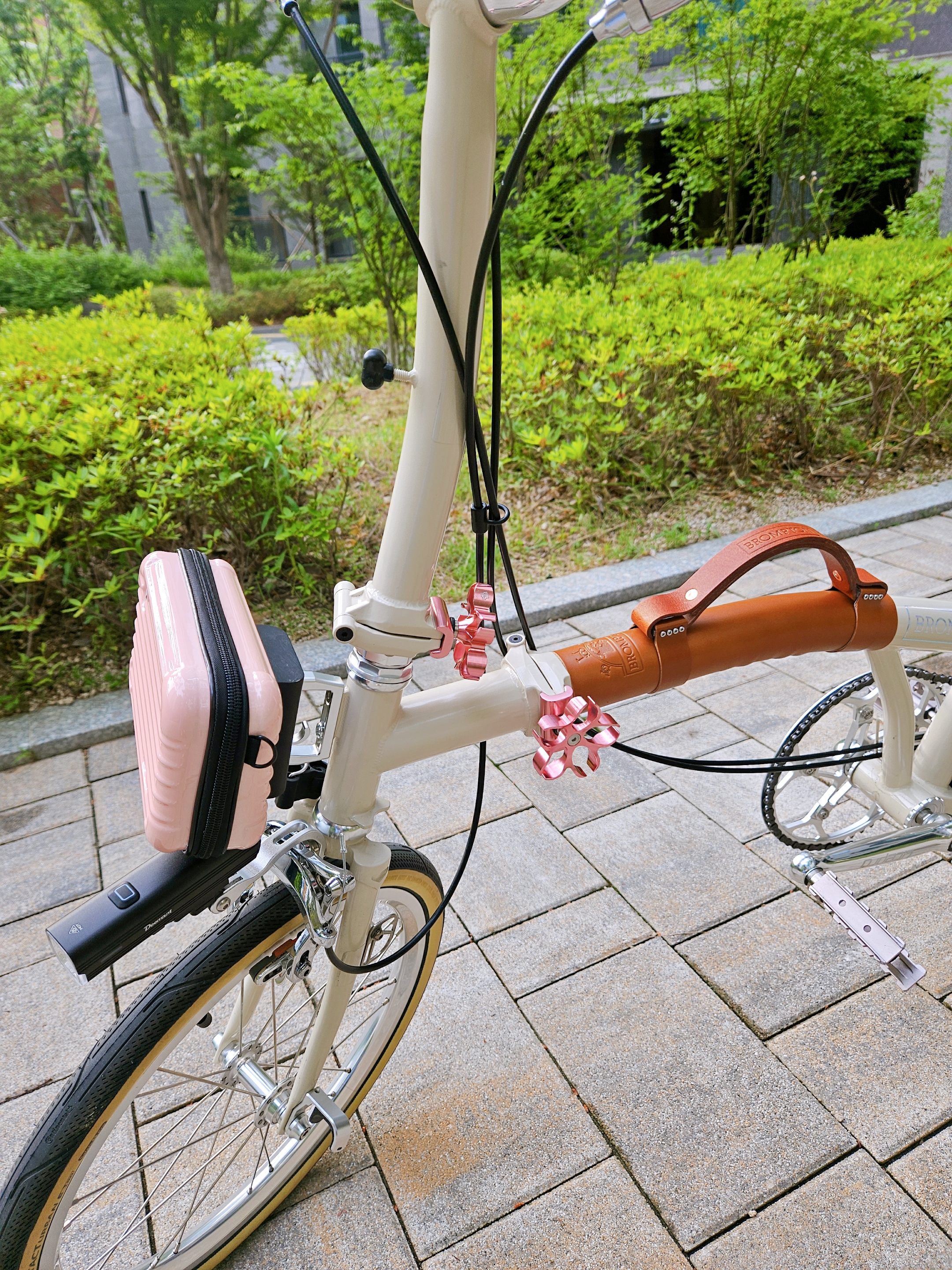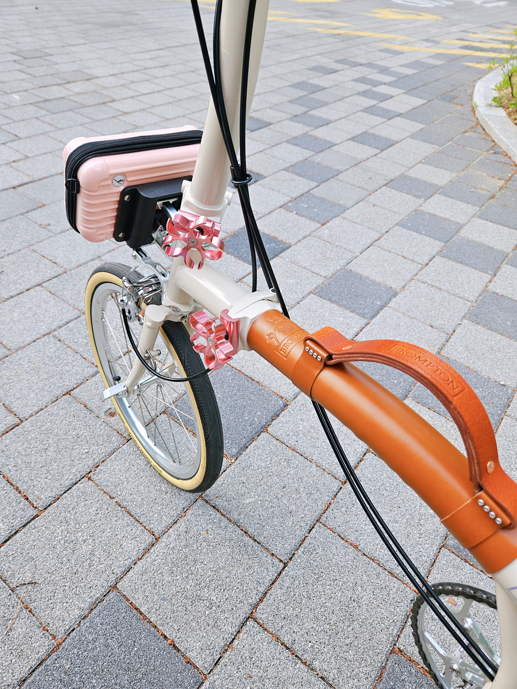 핑크색 벚꽃 모양 레버와 핑크색 프론트백도 세트처럼 잘 어울리고 포인트 되니 만족. 자전거 접고 펴는데 잘 되는지 테스트해보니 이상 없어서 다행이다.