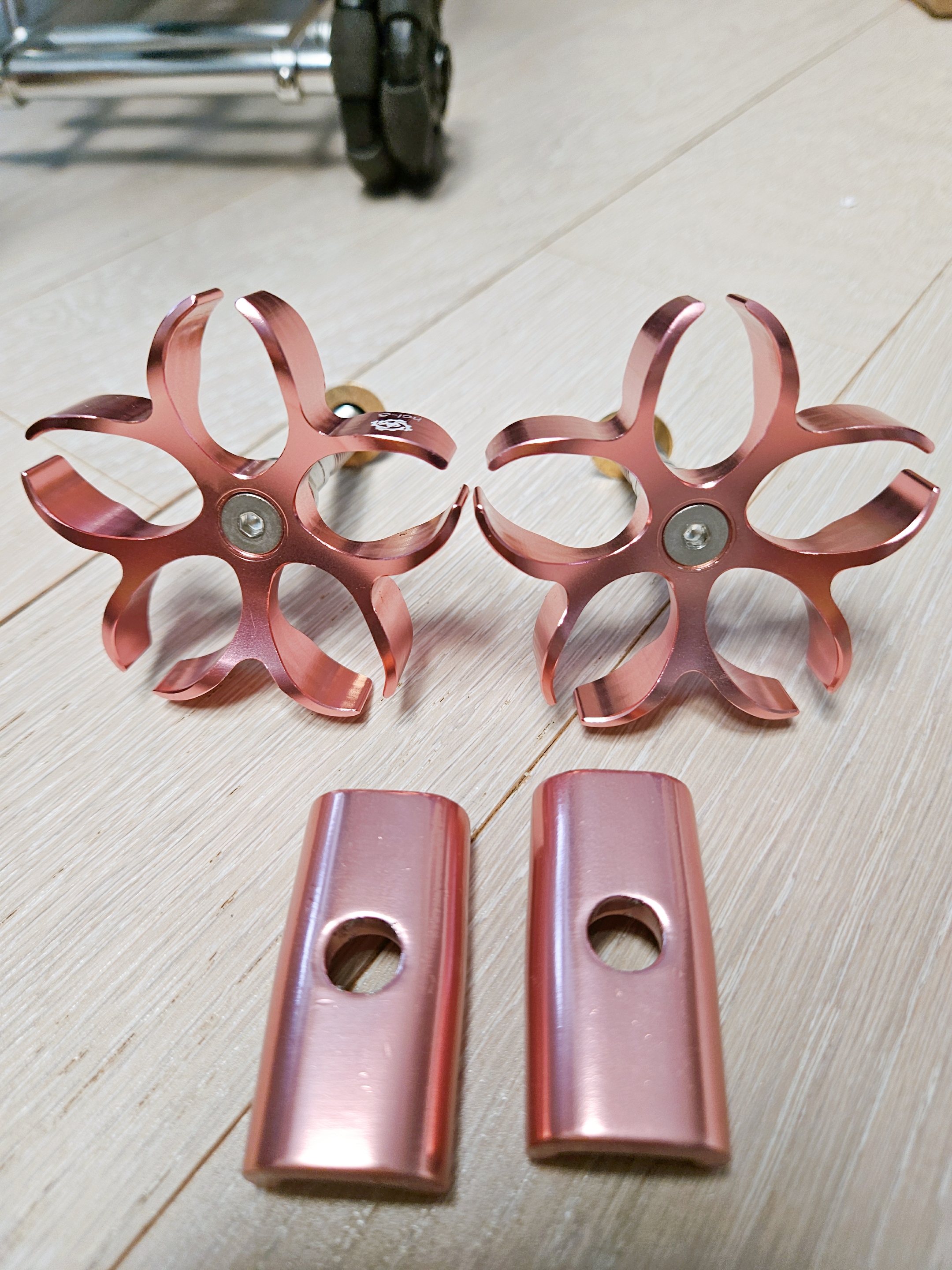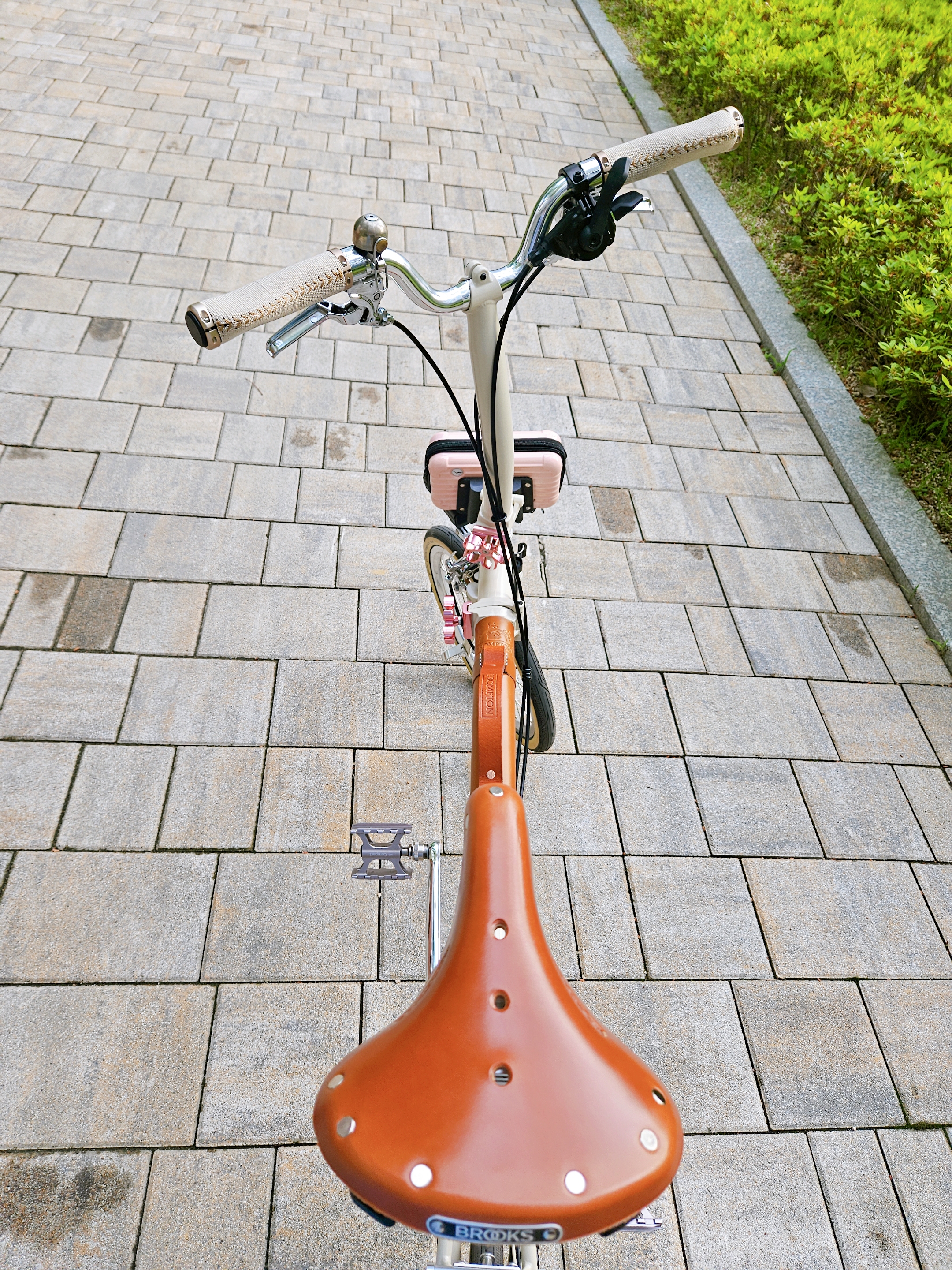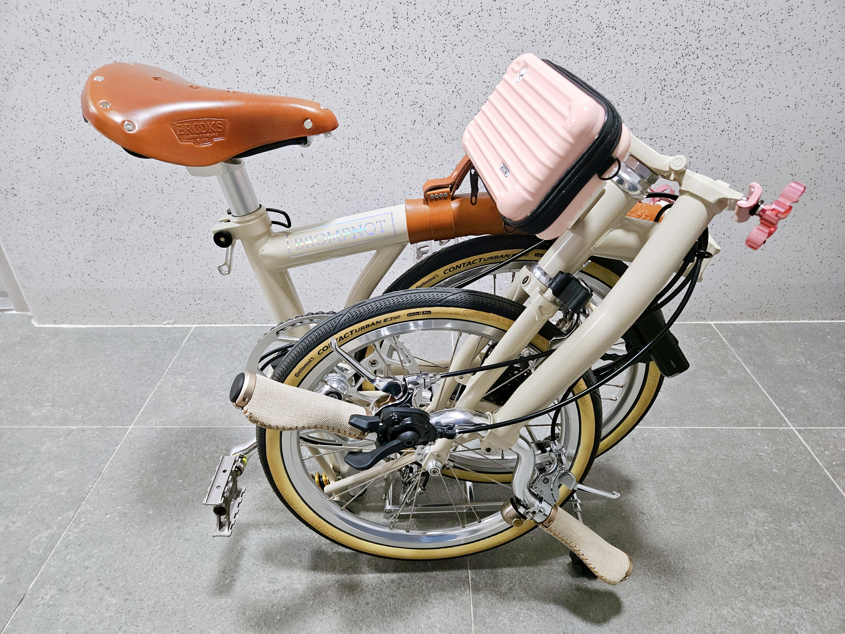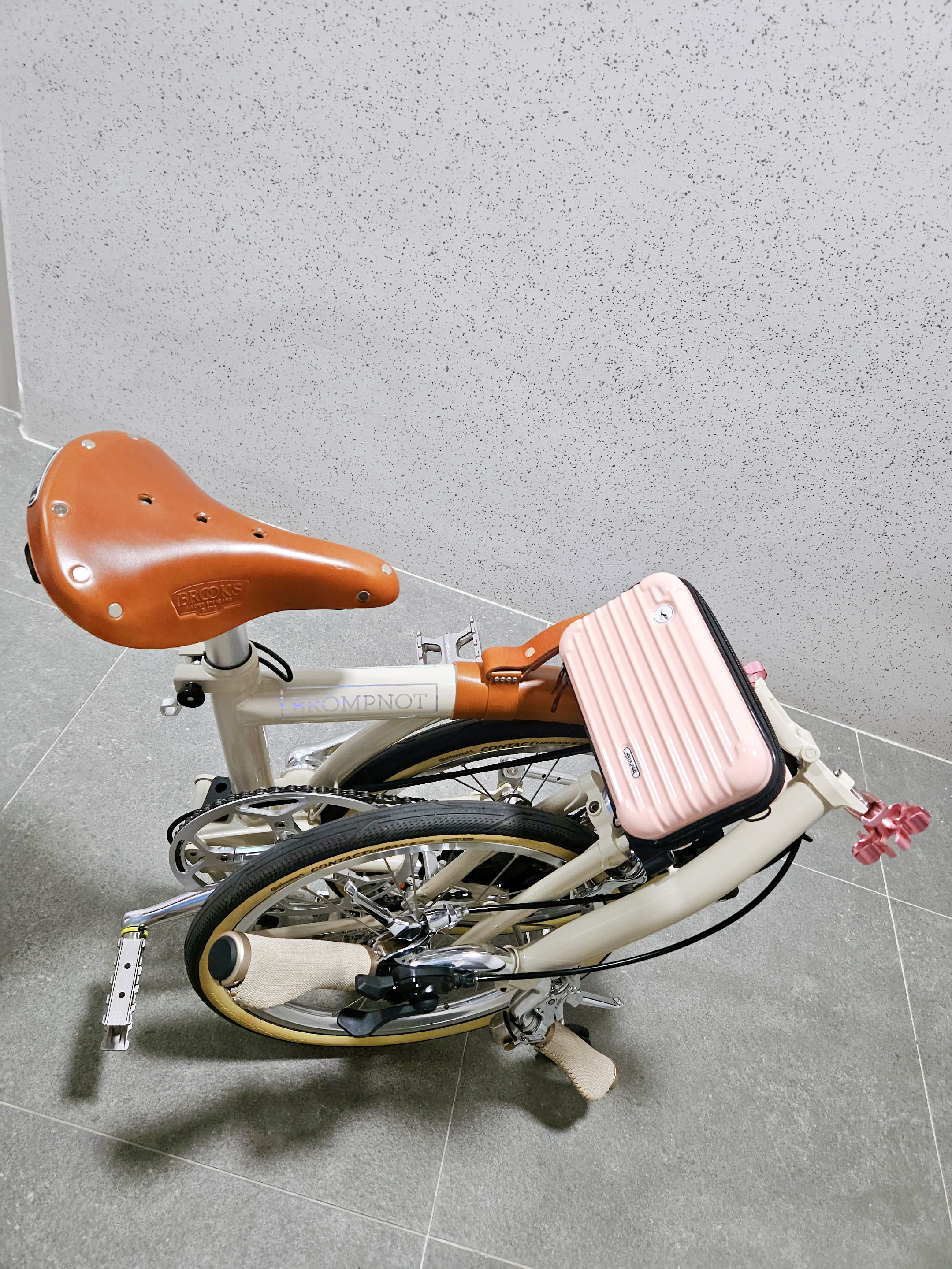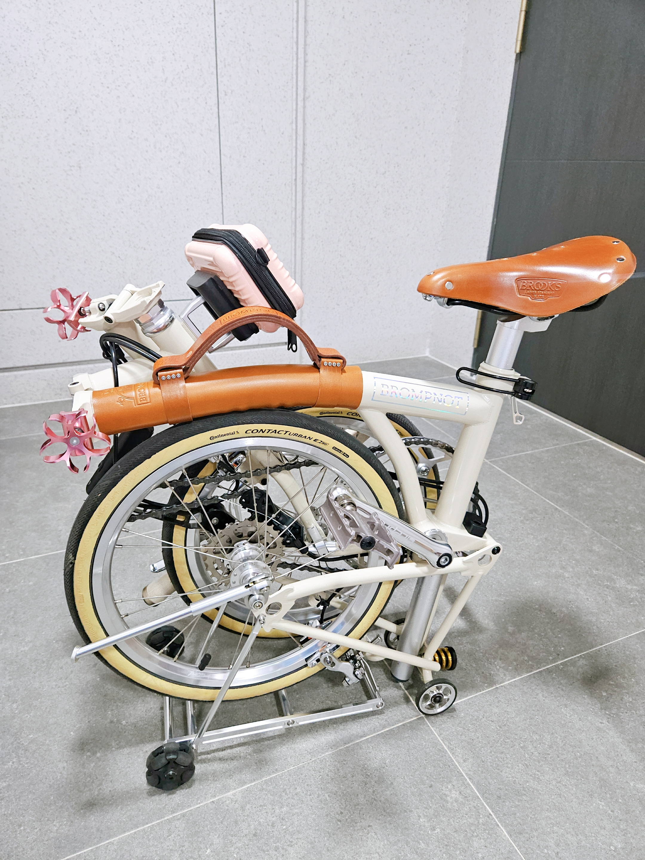 핑크색 벚꽃 모양 레버와 핑크색 프론트백도 세트처럼 잘 어울리고 포인트 되니 만족. 자전거 접고 펴는데 잘 되는지 테스트해보니 이상 없어서 다행이다.
