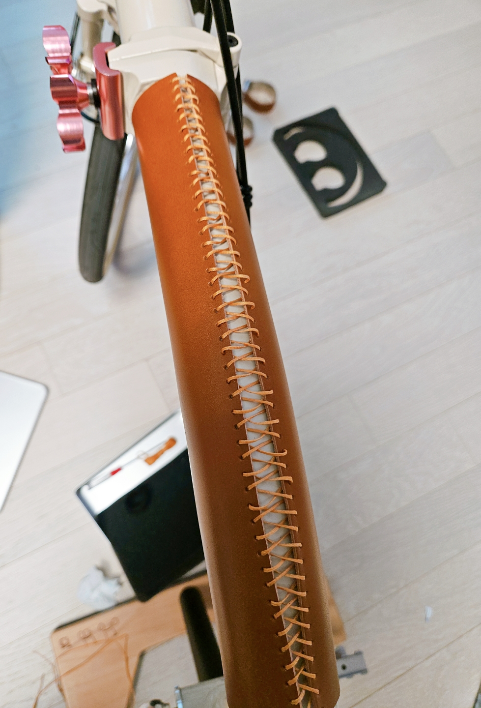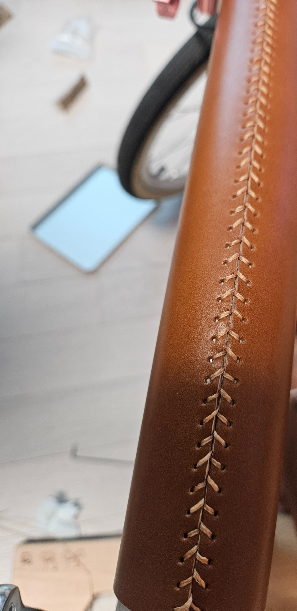 마지막으로 프레임 가죽 핸들 손잡이는 직접 달아보니 혼자 하기 어렵겠더라. 일단 프레임에 가죽을 감싼 후 바늘에 실을 꿰어서 엮어야 하고 손잡이에 드라이버도 작아서 엄청난 힘으로 조여서 돌려야 하니 쉽지않다.