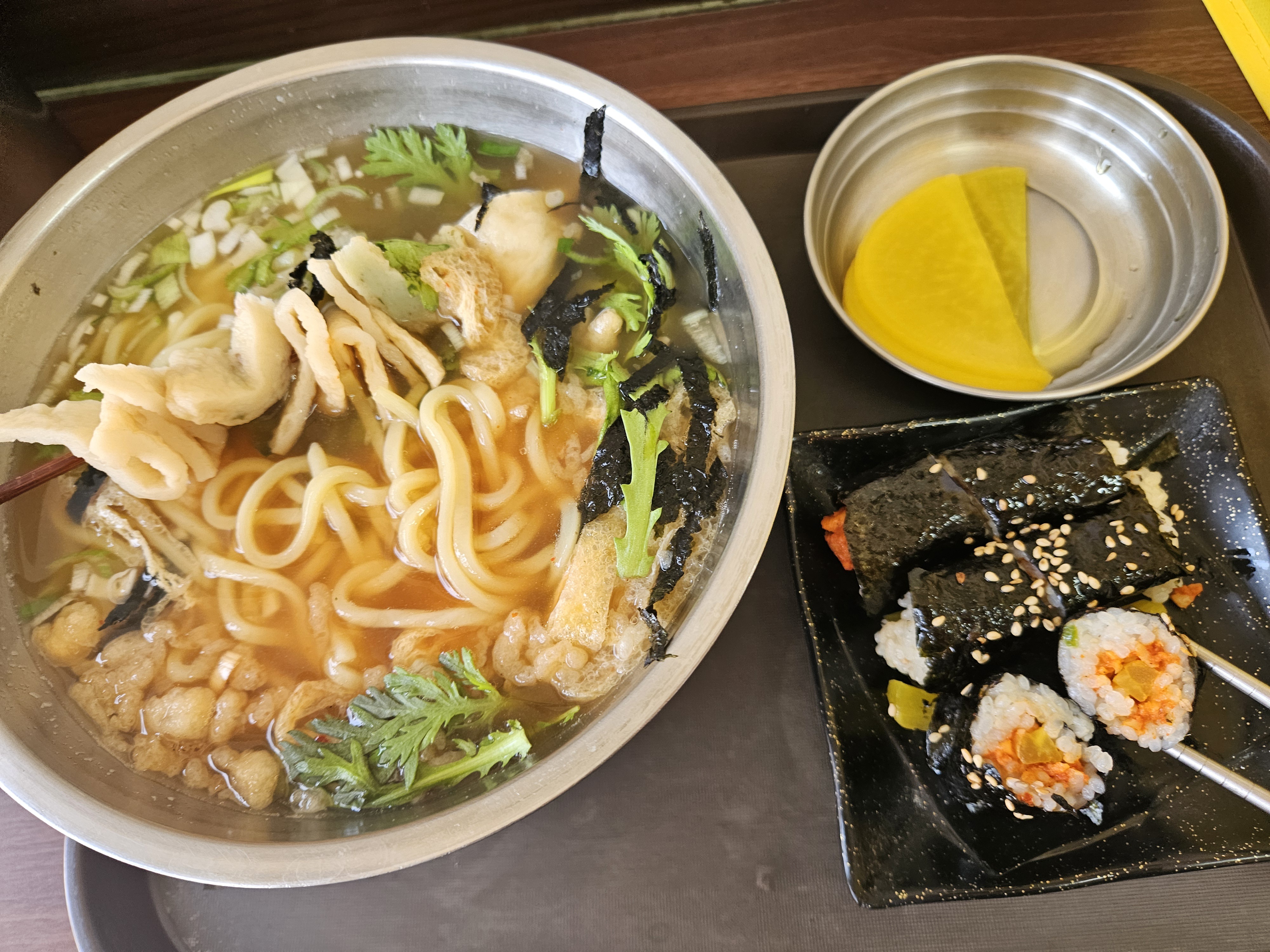 어묵우동 + 꼬마김밥(8,0) 주문하고 금세 식사할 수 있게 음식 가져다주셨다. 반찬은 단무지 하나가 전부.